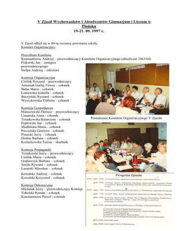 V Zjazd Wychowanków i Absolwentów Gimnazjum i Liceum w Płońsku 19-21. 09. 1997 r. V Zjazd odbył się w 80-tą rocznicę powstania szkoły. Komitet Organizacyjny: Prezydium Komitetu Konstantinow Andrzej – przewodniczący Komitetu Organizacyjnego (absolwent 1963/64) Piskorski Jan – zastępca przewodniczącego Stolpa Andrzej – sekretarz Komisja Organizacyjna Cieślak Ryszard – przewodniczący Antoniak Garlej Teresa – członek Bidas Maria – członek Łoniewska Izabella – członek Buczyński Ryszard – członek Wyrzykowska ElŜbieta – członek Komisja Gospodarcza Matuszewski Dariusz – przewodniczący Uznańska Anna - członek Trzaskowska Katarzyna – członek Pepłowski Jan – członek Modlińska Maria – członek Peczyńska GraŜyna – członek Piasecki Jerzy – członek Derbin Barbara – członek KoŜuchowska Teresa – skarbnik Komisja Propagandy Trzaskowki Jerzy – przewodniczący Cieślak Maria – członek Grabarczyk Barbara – członek Sutyła Ryszard – członek Łazarski Mirosław – członek Kowalski Andrzej – członek Kowalski Krzysztof – członek Komisja Dekoracyjna Michalak Jerzy – przewodniczący Komisji Tobolski Roman – członek Konstantinow Paweł - członek Posiedzenie Komitetu Organizacyjnego V Zjazdu Komitet Organizacyjny V Zjazdu Stoją od lewej: Dariusz Matuszewski, Jan Pepłowski, Maria Modlińska, GraŜyna Peczyńska, Ryszard Buczyński, Ryszard Sutyła, Andrzej Stolpa, ElŜbieta Wyrzykowska, Andrzej Konstantinow, Ryszard Cieślak, Jerzy Piasecki, Jerzy Trzaskowski, Mirosław Łazarski, Andrzej Kowalski Siedzą od lewej: Anna Uznańska, Maria Cieślak, Teresa KoŜuchowska, Barbara Grabarczyk, Teresa Antoniak, Katarzyna Trzaskowska, Maria Bidas, Izabella Łoniewska Barbara Wachowicz w sekretariacie Zjazdu Przewodniczący Komitetu Organizacyjnego Andrzej Konstantinow dziękuje Barbarze Wachowicz za występ Występ Barbary Wachowicz Dyrektor Ryszard Buczyński wręcza Barbarze Wachowicz medal MAXIMA CUM LAUDE Barbara Wachowicz z Krzysztofem Karulakiem i Ryszardem Buczyńskim Cześć oficjalna Zjazdu w sali kina Krzysztof Karulak dziękuje Andrzejowi Kowalskiemu za pomoc w wydaniu ksiąŜki Były dyrektor Władysław Wieczorkiewicz w otoczeniu wychowanek Pochód uczestników V Zjazdu ulicami Płońska V zjazd ufundował salę komputerowo-informatyczną, tablicę pamiątkową oraz ksiąŜkę Krzysztofa Karulaka „Z Muzą w herbie” Tablica pamiątkowa Uroczyste odsłonięcie tablicy pamiątkowej V Zjazdu