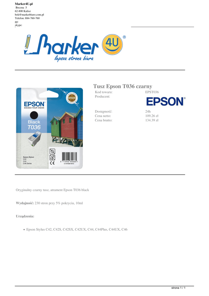 Marker4U.pl Boczna 5 62-800 Kalisz [email protected] Telefon: 884-760-760 gg: skype: Tusz Epson T036 czarny Kod towaru: Producent: EPST036 Dostępność: Cena netto: Cena brutto: 24h 109.26 zł 134.39 zł Oryginalny czarny tusz, atrament Epson T036 black Wydajność: 230 stron przy 5% pokryciu, 10ml Urządzenia: Epson Stylus C42, C42S, C42SX, C42UX, C44, C44Plus, C44UX, C46 strona 1 / 1 Powered by TCPDF (www.tcpdf.org)
