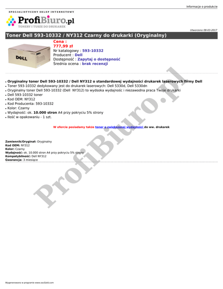 Informacje o produkcie Utworzono 08-03-2017 Toner Dell 593-10332 / NY312 Czarny do drukarki (Oryginalny) Cena : 777,99 zł Nr katalogowy : 593-10332 Producent : Dell Dostępność : Zapytaj o dostępność Średnia ocena : brak recenzji ● ● ● ● ● ● ● Oryginalny toner Dell 593-10332 / Dell NY312 o standardowej wydajności drukarek laserowych firmy Dell Toner 593-10332 dedykowany jest do drukarek laserowych: Dell 5330d, Dell 5330dn Oryginalny toner Dell 593-10332 (Dell NY312) to wydsoka wydajnośc i niezawodna praca Twoje drukarki Dell 593-10332 toner Kod OEM: NY312 Kod Producenta: 593-10332 Kolor: Czarny Wydajność: ok. 10.000 stron A4 przy pokryciu 5% strony Ilość w opakowaniu - 1 szt. o. pl ● iu r ● W ofercie posiadamy także toner o zwiększonej wydajności do ww. drukarek Pr of iB Zamiennik/Oryginał: Oryginalny Kod OEM: NY312 Kolor: Czarny Wydajność: ok. 10.000 stron A4 przy pokryciu 5% strony Kompatybilność: Dell NY312 Gwarancja: 3 miesiące Wygenerowano w programie www.oscGold.com