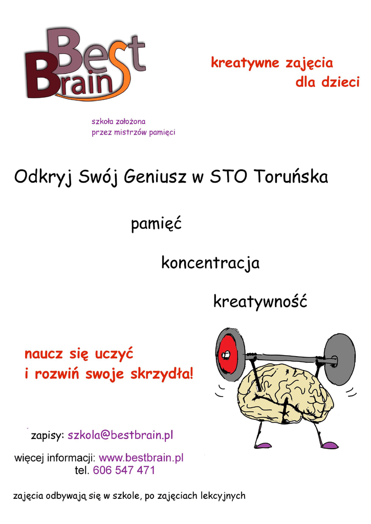 www.bestbrain.pl [email protected] Szkoła mistrzów pamięci: www.bestbrain.pl [email protected] Szkoła mistrzów pamięci: Podczas zajęć: rozwijamy wyobraźnię ćwiczymy koncentrację uwagi uczymy i korzystamy z technik pamięci rozwijamy spostrzegawczość ćwiczymy słuchanie ze zrozumieniem rozwijamy kreatywność i pomysłowość uczymy jak radzić sobie z pracą pod presją czasu Ponadto z dziećmi starszymi (począwszy od klasy 2 SP): uczymy efektywnego zapamiętywania: dat, imion, listy wyrazów, wierszy, definicji, wzorów itd. tworzymy innowacyjne notatki w formie map myśli oraz metodą Cornella uczymy technik nauki słówek języków obcych www.bestbrain.pl [email protected] Szkoła mistrzów pamięci: Kim jesteśmy?: pasjonatami rozwoju umysłowego sportowcami pamięci i rekordzistami kraju w tej dziedzinie pierwszymi w historii reprezentantami Polski na Mistrzostwach Świata Pamięci autorami książki "Techniki zapamiętywania" ekspertami rozwoju umysłowego i gośćmi licznych .....programów telewizyjnych i audycji radiowych Jak pracujemy? prowadzimy monitoring wyników i postępów dzieci podczas kursu w oparciu o oprogramowanie multimedia oraz platformę Systemu Doskonalenia Pamięci wprowadzamy motywacyjny system punktów i nagród dla uczestników i specjalistyczne autorskiego www.bestbrain.pl [email protected] Szkoła mistrzów pamięci: Oferta: czas trwania kursu – minimum 31 godzin zegarowych czyli minimum 41 godzin lekcyjnych (spotkania raz w tygodniu) zajęcia odbywają się w bardzo małych grupach (około 10 uczestników) z podziałem według wieku dzieci zajęcia odbywają się na miejscu w szkole (STO Toruńska) zajęcia przeznaczone dla dzieci od 6 roku życia (klasa 0) do VI klasy szkoły podstawowej każdy z uczestników otrzyma specjalny zeszyt ćwiczeń oraz całoroczny dostęp do platformy e-learningowej Best Brain cena kursu – 1500 PLN podzielona na 10 rat po 150PLN płatnych od września do czerwca. Pierwsza zajęcia mają charakter pokazowy dla rodzeństw rabat 10% zapisy i pytania: [email protected] lub pod numerem telefonu: 606-547-471 naucz się uczyć i zapamiętaj wszystko!