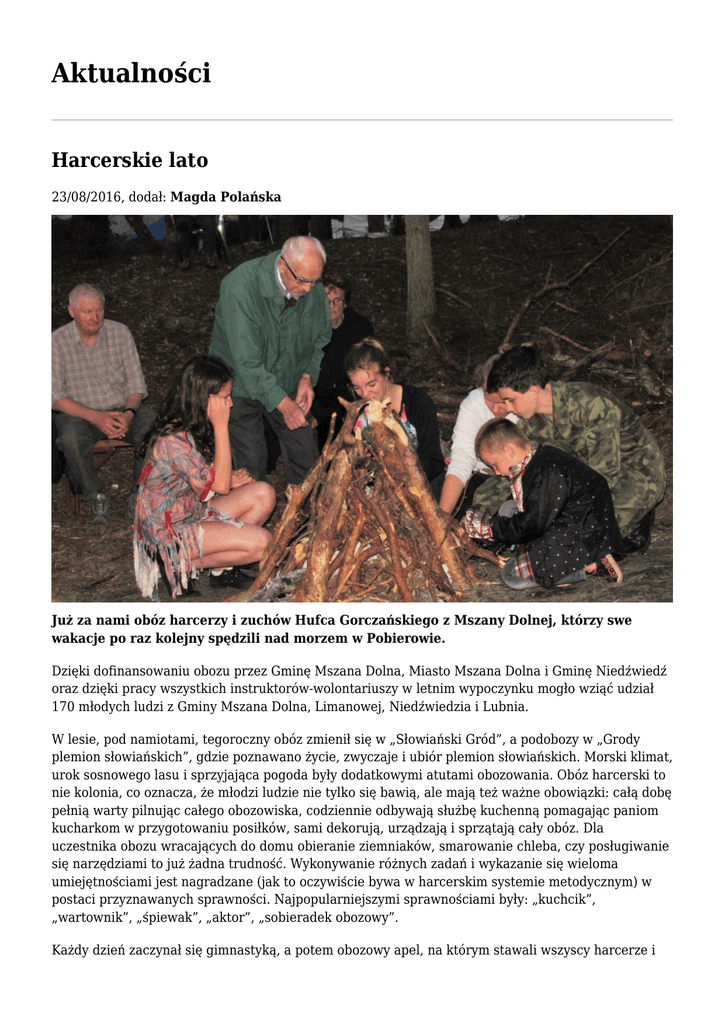 Aktualności Harcerskie lato 23/08/2016, dodał: Magda Polańska Już za nami obóz harcerzy i zuchów Hufca Gorczańskiego z Mszany Dolnej, którzy swe wakacje po raz kolejny spędzili nad morzem w Pobierowie. Dzięki dofinansowaniu obozu przez Gminę Mszana Dolna, Miasto Mszana Dolna i Gminę Niedźwiedź oraz dzięki pracy wszystkich instruktorów-wolontariuszy w letnim wypoczynku mogło wziąć udział 170 młodych ludzi z Gminy Mszana Dolna, Limanowej, Niedźwiedzia i Lubnia. W lesie, pod namiotami, tegoroczny obóz zmienił się w „Słowiański Gród”, a podobozy w „Grody plemion słowiańskich”, gdzie poznawano życie, zwyczaje i ubiór plemion słowiańskich. Morski klimat, urok sosnowego lasu i sprzyjająca pogoda były dodatkowymi atutami obozowania. Obóz harcerski to nie kolonia, co oznacza, że młodzi ludzie nie tylko się bawią, ale mają też ważne obowiązki: całą dobę pełnią warty pilnując całego obozowiska, codziennie odbywają służbę kuchenną pomagając paniom kucharkom w przygotowaniu posiłków, sami dekorują, urządzają i sprzątają cały obóz. Dla uczestnika obozu wracających do domu obieranie ziemniaków, smarowanie chleba, czy posługiwanie się narzędziami to już żadna trudność. Wykonywanie różnych zadań i wykazanie się wieloma umiejętnościami jest nagradzane (jak to oczywiście bywa w harcerskim systemie metodycznym) w postaci przyznawanych sprawności. Najpopularniejszymi sprawnościami były: „kuchcik”, „wartownik”, „śpiewak”, „aktor”, „sobieradek obozowy”. Każdy dzień zaczynał się gimnastyką, a potem obozowy apel, na którym stawali wszyscy harcerze i zuchy oraz kadra obozu. Można było wykazać się wtedy znajomością musztry i ceremoniału harcerskiego. Codziennie odczytywano rozkaz Komendanta, z którego dowiadywano się ważnych informacji. Podczas apelu obchodzono także urodziny i imieniny, a solenizant otrzymywał w prezencie słodką paczkę. Dni słoneczne pozwalały na plażowanie i kąpiel w morzu. Nad bezpieczeństwem wszystkich czuwał ratownik, pielęgniarka oraz instruktorzy - wychowawcy. Było podziwianie zachodów słońca i chrzest morski dla wszystkich, którzy nad morzem byli po raz pierwszy, zabawy integracyjne i zawody sportowe. Podczas trwania obozu harcerze i zuchy uczestniczyli w grach terenowych, zwiadach, poznawali bliższą i dalszą okolicę, rywalizowali w różnego rodzaju konkursach, doskonaląc przy okazji harcerską wiedzę i umiejętności. Scenki z życia Słowian, piosenki, pląsy i okrzyki prezentowali na ogniskach i świeczkowiskach. Dzień po dniu, bawiąc się poznawano kolejne tajniki wiedzy o życiu, obyczajach i obrzędach. Nie zabrakło najważniejszego – Przyrzeczenia Harcerskiego, które odbyło się w nocy przy blasku ognia i całej kadrze instruktorskiej. W ramach obozu zorganizowano również wycieczki do Międzyzdrojów i Kołobrzegu, gdzie niewątpliwą atrakcją dla młodzieży był rejs po Bałtyku. W drodze powrotnej zwiedzali oni Trzęsacz z resztkami zabytkowej ściany średniowiecznego kościoła. Pierwszego sierpnia o godz. 17:00 leśną ciszę rozdarł głos syreny strażackiej i głośne wybuchy petard. Wspólnym apelem, na którym komendantka obozu hm Ewa Jasińska odczytała „Rozkaz specjalny”, uczciliśmy 72 rocznicę Powstania Warszawskiego. Z obozu wszyscy powrócili zdrowi, zadowoleni, opaleni, roześmiani z gorącymi postanowieniami udziału w przyszłym obozie. „Trzeba na obozie być aby zrozumieć co się traci nie będąc” - tak podsumowali pobyt zadowoleni uczestnicy obozu. Harcmistrz Ewa Jasińska