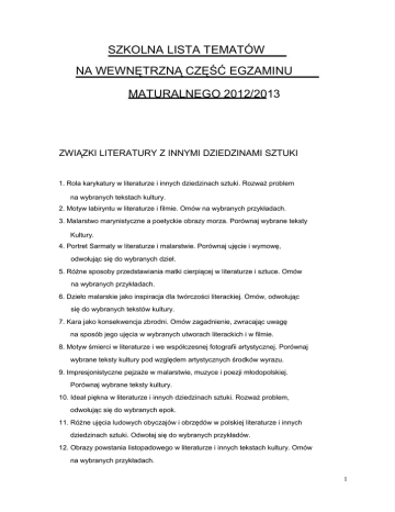 SZKOLNA LISTA TEMATÓW NA WEWNĘTRZNĄ CZĘŚĆ EGZAMINU MATURALNEGO 2012/2013 ZWIĄZKI LITERATURY Z INNYMI DZIEDZINAMI SZTUKI 1. Rola karykatury w literaturze i innych dziedzinach sztuki. Rozważ problem na wybranych tekstach kultury. 2. Motyw labiryntu w literaturze i filmie. Omów na wybranych przykładach. 3. Malarstwo marynistyczne a poetyckie obrazy morza. Porównaj wybrane teksty Kultury. 4. Portret Sarmaty w literaturze i malarstwie. Porównaj ujęcie i wymowę, odwołując się do wybranych dzieł. 5. Różne sposoby przedstawiania matki cierpiącej w literaturze i sztuce. Omów na wybranych przykładach. 6. Dzieło malarskie jako inspiracja dla twórczości literackiej. Omów, odwołując się do wybranych tekstów kultury. 7. Kara jako konsekwencja zbrodni. Omów zagadnienie, zwracając uwagę na sposób jego ujęcia w wybranych utworach literackich i w filmie. 8. Motyw śmierci w literaturze i we współczesnej fotografii artystycznej. Porównaj wybrane teksty kultury pod względem artystycznych środków wyrazu. 9. Impresjonistyczne pejzaże w malarstwie, muzyce i poezji młodopolskiej. Porównaj wybrane teksty kultury. 10. Ideał piękna w literaturze i innych dziedzinach sztuki. Rozważ problem, odwołując się do wybranych epok. 11. Różne ujęcia ludowych obyczajów i obrzędów w polskiej literaturze i innych dziedzinach sztuki. Odwołaj się do wybranych przykładów. 12. Obrazy powstania listopadowego w literaturze i innych tekstach kultury. Omów na wybranych przykładach. 1 13. System totalitarny w literaturze i filmie. Porównaj wykorzystane środki wyrazu. 14. Holocaust w literaturze i filmie. Omów na wybranych przykładach. 15. Mitotwórcza rola literatury i filmu. Przedstaw na wybranych przykładach. 16. ,,Nie zabijaj” – zaprezentuj sposób funkcjonowania biblijnego nakazu etycznego w literaturze i sztuce współczesnej. 17. Kreacja postaci wampira w literaturze i filmie. Omów na wybranych przykładach. 18. Kicz a arcydzieło. Czy kultura współczesna jest terenem ekspansji kiczu? Rozważ problem, odwołując się do literatury i wybranej dziedziny sztuki współczesnej. 19. Wiersze o obrazach. Poetyckie spojrzenie na arcydzieła malarstwa. Omów zagadnienie na wybranych przykładach. 20. Dramat Szekspirowski w adaptacjach filmowych. Porównaj wybrane teksty z filmami. 21. Rozważ rolę inspiracji mitologicznych we współczesnej literaturze i innych dziedzinach sztuki. 22. Pejzaż (sentymentalny, romantyczny, młodopolski) w literaturze i sztukach plastycznych. Porównaj oba sposoby tworzenia obrazu natury, odwołując się do wybranych przykładów. 23. Omów rolę toposu raju w literaturze i malarstwie. 24. Różnorodne ujęcia motywu Madonny w literaturze i malarstwie wybranych epok kulturowych. 25. Funkcja ujęcia toposu Nike w poezji oraz malarstwie wybranych epok kulturowych. 26. Symboliczny obraz świata w literaturze i malarstwie. Omów na wybranych przykładach. 27. Motyw walki narodowowyzwoleńczej w literaturze i malarstwie wybranych epok kulturowych. Przedstaw na wybranych przykładach. 28. Postawa piłatyzmu. Przedstaw na podstawie wybranych tekstów kultury. 29. Różne ujęcia motywu tańca w literaturze i sztuce. Przedstaw na wybranych przykładach. 30. Motywy katastroficzne- omów temat, analizując wybrane dzieła literackie, malarskie i filmowe. 31. Topos Ikara w poezji i malarstwie. Omów na wybranych przykładach. 2 32. Motyw piekła i mąk piekielnych w literaturze i malarstwie różnych epok. Omów funkcję tego toposu. 33. Obraz diabła w literaturze, malarstwie i filmie. Przedstaw temat, odwołując się do wybranych przykładów. 34. Motyw anioła w literaturze, malarstwie i filmie. Omów na wybranych przykładach. 35.Literackie i filmowe wizje średniowiecza. Omów, odwołując się do wybranych tekstów kultury. 36. Motyw arkadii w literaturze i innych dziedzinach sztuki. Omów funkcję tego toposu. 37. Miłość w epoce romantyzmu. Przedstaw problem, odwołując się do wybranych tekstów kultury. 38. Motyw śmierci w literaturze i filmie. Omów na wybranych przykładach. 39. Między bytem a niebytem. Przedstaw zagadnienie, odwołując się do wybranych tekstów kultury. 40. Fascynacje kulturą Wschodu w literaturze i innych dziedzinach sztuki. Omów problem na wybranych przykładach. 41. Romantyczna miłość w literaturze i filmie. Omów na wybranych przykładach. 42. Rodzina i jej społeczne funkcje. Zaprezentuj temat, odwołując się do wybranych przykładów literackich i filmowych. 43. Cierpienie źródłem przemiany wewnętrznej. Omów na wybranych przykładach literackich i filmowych. 44. Ideał urody kobiecej w literaturze i filmie. Omów na wybranych przykładach. 45. Dzieło literackie i jego adaptacja filmowa. Omów na wybranych przykładach. 46. Filmy A. Wajdy jako interpretacje dzieł literatury polskiej. Omów na wybranych przykładach. 47. Problem narkomanii w literaturze i filmie. Omów na wybranych przykładach. 48. Motyw podróży w literaturze i innych dziedzinach sztuki. Omów funkcję tego toposu, odwołując się do wybranych przykładów. 49. Jan Paweł II i Jego wpływ na losy Polski i Polaków. Omów na wybranych przykładach literackich i filmowych. 50. Cena sztuki… . Omów problem, opierając się na przykładach z literatury i innych dziedzin sztuki. 3 51. Ujęcie motywu matki i dziecka w literaturze i fotografii. Omów na wybranych przykładach. 52. ,, Kochać, pragnąć i żałować…”. Twoje rozważania o obrazach pożegnań i rozstań na podstawie wybranych utworów literackich i filmów. 53. Chrześcijańska koncepcja cierpienia Boga w różnych dziedzinach sztuki. Przedstaw na wybranych przykładach. 54. Porównaj różne ujęcia motywu lekarza na podstawie wybranych utworów literackich i filmów. 55. Alternatywna wizja świata w literaturze i w innych dziedzinach sztuki. Przedstaw temat, odwołując się do wybranego materiału kulturowego. 56. Współcześni „ludzie renesansu”