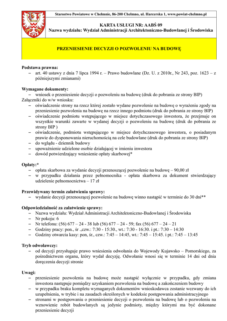 Starostwo Powiatowe w Chełmnie, 86-200 Chełmno, ul. Harcerska 1, www.powiat-chelmno.pl KARTA USŁUGI NR: AABŚ 09 Nazwa wydziału: Wydział Administracji Architektoniczno-Budowlanej i Środowiska PRZENIESIENIE DECYZJI O POZWOLENIU NA BUDOWĘ Podstawa prawna: – art. 40 ustawy z dnia 7 lipca 1994 r. – Prawo budowlane (Dz. U. z 2010r., Nr 243, poz. 1623 – z późniejszymi zmianami) Wymagane dokumenty: – wniosek o przeniesienie decyzji o pozwoleniu na budowę (druk do pobrania ze strony BIP) Załączniki do w/w wniosku: – oświadczenie strony na rzecz której zostało wydane pozwolenie na budowę o wyrażeniu zgody na przeniesienie pozwolenia na budowę na rzecz innego podmiotu (druk do pobrania ze strony BIP) – oświadczenie podmiotu wstępującego w miejsce dotychczasowego inwestora, że przejmuje on wszystkie warunki zawarte w wydanej decyzji o pozwoleniu na budowę (druk do pobrania ze strony BIP ) – oświadczenie, podmiotu wstępującego w miejsce dotychczasowego inwestora, o posiadanym prawie do dysponowania nieruchomością na cele budowlane (druk do pobrania ze strony BIP) – do wglądu - dziennik budowy – upoważnienie udzielone osobie działającej w imieniu inwestora – dowód potwierdzający wniesienie opłaty skarbowej* Opłaty:* – opłata skarbowa za wydanie decyzji przenoszącej pozwolenie na budowę – 90,00 zł – w przypadku działania przez pełnomocnika - opłata skarbowa za dokument stwierdzający udzielenie pełnomocnictwa – 17 zł Przewidywany termin załatwienia sprawy: – wydanie decyzji przenoszącej pozwolenie na budowę winno nastąpić w terminie do 30 dni** Odpowiedzialność za załatwienie sprawy: – Nazwa wydziału: Wydział Administracji Architektoniczno-Budowlanej i Środowiska – Nr pokoju: 6 – Nr telefonu: (56) 677 – 24 - 38 lub (56) 677 – 24 - 59; fax (56) 677 – 24 – 21 – Godziny pracy: pon., śr .,czw.: 7:30 - 15:30., wt.: 7:30 - 16:30. i pt.: 7:30 – 14:30 – Godziny otwarcia kasy: pon, śr., czw.: 7:45 – 14:45, wt.: 7:45 – 15:45. i pt.: 7:45 – 13:45 Tryb odwoławczy: – od decyzji przysługuje prawo wniesienia odwołania do Wojewody Kujawsko – Pomorskiego, za pośrednictwem organu, który wydał decyzję. Odwołanie wnosi się w terminie 14 dni od dnia doręczenia decyzji stronie Uwagi: – przeniesienie pozwolenia na budowę może nastąpić wyłącznie w przypadku, gdy zmiana inwestora następuje pomiędzy uzyskaniem pozwolenia na budowę a zakończeniem budowy – w przypadku braku kompletu wymaganych dokumentów wnioskodawca zostanie wezwany do ich uzupełnienia, w trybie i na zasadach określonych w kodeksie postępowania administracyjnego – stronami w postępowaniu o przeniesienie decyzji o pozwoleniu na budowę lub o pozwoleniu na wznowienie robót budowlanych są jedynie podmioty, między którymi ma być dokonane przeniesienie decyzji * pozwolenia oraz pełnomocnictwa nie podlegają opłacie skarbowej lub podlegają zwolnieniu od opłaty skarbowej w przypadkach, o których mowa w ustawie z dnia 16 listopada 2006r. - o opłacie skarbowej (Dz. U. Nr 225 poz. 1635 – z późniejszymi zmianami) ** do terminu nie wlicza się terminów przewidzianych w przepisach prawa do dokonania określonych czynności, okresów zawieszenia postępowania oraz okresów opóźnień spowodowanych z winy strony albo z przyczyn niezależnych od organu Sporządził: Sprawdził: Zatwierdził: