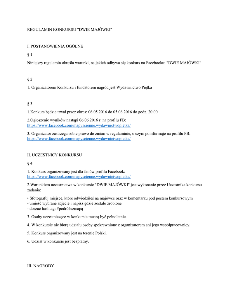 REGULAMIN KONKURSU "DWIE MAJÓWKI" I. POSTANOWIENIA OGÓLNE §1 Niniejszy regulamin określa warunki, na jakich odbywa się konkurs na Facebooku: "DWIE MAJÓWKI" §2 1. Organizatorem Konkursu i fundatorem nagród jest Wydawnictwo Piętka §3 1.Konkurs będzie trwał przez okres: 06.05.2016 do 05.06.2016 do godz. 20.00 2.Ogłoszenie wyników nastąpi 06.06.2016 r. na profilu FB: https://www.facebook.com/mapyscienne.wydawnictwopietka/ 3. Organizator zastrzega sobie prawo do zmian w regulaminie, o czym poinformuje na profilu FB: https://www.facebook.com/mapyscienne.wydawnictwopietka/ II. UCZESTNICY KONKURSU §4 1. Konkurs organizowany jest dla fanów profilu Facebook: https://www.facebook.com/mapyscienne.wydawnictwopietka/ 2.Warunkiem uczestnictwa w konkursie "DWIE MAJÓWKI" jest wykonanie przez Uczestnika konkursu zadania: • Sfotografuj miejsce, które odwiedziłeś na majówce oraz w komentarzu pod postem konkursowym - umieść wybrane zdjęcie i napisz gdzie zostało zrobione - dorzuć hashtag: #podróżezmapą 3. Osoby uczestniczące w konkursie muszą być pełnoletnie. 4. W konkursie nie biorą udziału osoby spokrewnione z organizatorem ani jego współpracownicy. 5. Konkurs organizowany jest na terenie Polski. 6. Udział w konkursie jest bezpłatny. III. NAGRODY §5 1. Organizator przewiduje trzy nagrody: Pierwsze miejsce - Atlas Polski 1:200000 Drugie miejsce - Atlas Polski 1:400000 Trzecie miejsce - Mapa składana Polski + mapa składana Europy 2. O przyznaniu nagrody decyduje jury powołane z pracowników Wydawnictwa Piętka IV. POSTANOWIENIA KOŃCOWE §6 1.Zasady Konkursu dostępne są na stronie internetowej Konkursu: http://www.mapy.com.pl/ 2. Użytkownikom nie wolno umieszczać spamu, linków do innych stron internetowych w tym również konkurencyjnych, jak również jakichkolwiek innych treści w każdej formie, nie związanych z tematyką konkursu. 3. W kwestiach nieuregulowanych Regulaminem stosuje się przepisy kodeksu cywilnego. 4. Promocja nie jest w żaden sposób sponsorowana, popierana ani przeprowadzana przez serwis Facebook ani z nim związana. 5. Facebook nie pomaga w przeprowadzaniu promocji. Administrator promocji korzysta z serwisu Facebook do administrowania promocją na własną odpowiedzialność. 6. Facebook zastrzega sobie prawo, że nie ponosi odpowiedzialności za warunki konkursu, promocje oraz treści zamieszczane przez użytkowników.