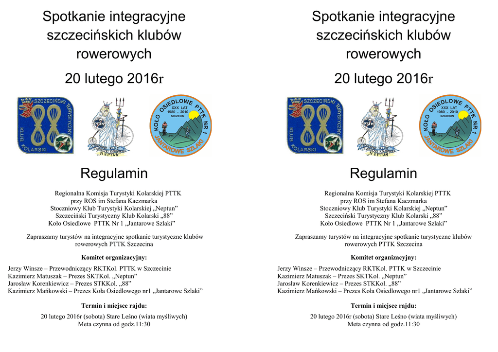 Spotkanie integracyjne szczecińskich klubów rowerowych Spotkanie integracyjne szczecińskich klubów rowerowych 20 lutego 2016r 20 lutego 2016r Regulamin Regulamin Regionalna Komisja Turystyki Kolarskiej PTTK przy ROS im Stefana Kaczmarka Stoczniowy Klub Turystyki Kolarskiej „Neptun” Szczeciński Turystyczny Klub Kolarski „88” Koło Osiedlowe PTTK Nr 1 „Jantarowe Szlaki” Regionalna Komisja Turystyki Kolarskiej PTTK przy ROS im Stefana Kaczmarka Stoczniowy Klub Turystyki Kolarskiej „Neptun” Szczeciński Turystyczny Klub Kolarski „88” Koło Osiedlowe PTTK Nr 1 „Jantarowe Szlaki” Zapraszamy turystów na integracyjne spotkanie turystyczne klubów rowerowych PTTK Szczecina Zapraszamy turystów na integracyjne spotkanie turystyczne klubów rowerowych PTTK Szczecina Komitet organizacyjny: Komitet organizacyjny: Jerzy Winsze – Przewodniczący RKTKol. PTTK w Szczecinie Kazimierz Matuszak – Prezes SKTKol. „Neptun” Jarosław Korenkiewicz – Prezes STKKol. „88” Kazimierz Mańkowski – Prezes Koła Osiedlowego nr1 „Jantarowe Szlaki” Jerzy Winsze – Przewodniczący RKTKol. PTTK w Szczecinie Kazimierz Matuszak – Prezes SKTKol. „Neptun” Jarosław Korenkiewicz – Prezes STKKol. „88” Kazimierz Mańkowski – Prezes Koła Osiedlowego nr1 „Jantarowe Szlaki” Termin i miejsce rajdu: Termin i miejsce rajdu: 20 lutego 2016r (sobota) Stare Leśno (wiata myśliwych) Meta czynna od godz.11:30 20 lutego 2016r (sobota) Stare Leśno (wiata myśliwych) Meta czynna od godz.11:30 Trasa rajdu: Jezioro Głębokie – Pilchowo - Stare Leśno Trasa rajdu: Jezioro Głębokie – Pilchowo - Stare Leśno Zbiórka uczestników na pętli tramwajowej „Głębokie”. Osoby idące pieszo ruszają z pętli „Głębokie” o godz. 10:00. Zbiórka uczestników na pętli tramwajowej „Głębokie”. Osoby idące pieszo ruszają z pętli „Głębokie” o godz. 10:00. Odjazd autobusów: linia 103 godz. 10:25; linia 106 godz. 10:13, Na mecie rajdu planowane jest ognisko i pamiątkowa plakietka. Odjazd autobusów: linia 103 godz. 10:25; linia 106 godz. 10:13, Na mecie rajdu planowane jest ognisko i pamiątkowa plakietka. Obowiązki uczestników: Obowiązki uczestników: • • Ubezpieczenie się we własnym zakresie. • • Przestrzeganie Karty Turysty i ochrony środowiska. Dobry humor. Do zobaczenia na trasie i mecie rajdu Uczestnicy którzy nie są członkami PTTK lub nie posiadają opłaconej składki za dany rok, zobowiązani są ubezpieczyć się we własnym zakresie od następstw nieszczęśliwych wypadków. Organizatorzy • • Ubezpieczenie się we własnym zakresie. • • Przestrzeganie Karty Turysty i ochrony środowiska. Dobry humor. Do zobaczenia na trasie i mecie rajdu Uczestnicy którzy nie są członkami PTTK lub nie posiadają opłaconej składki za dany rok, zobowiązani są ubezpieczyć się we własnym zakresie od następstw nieszczęśliwych wypadków. Organizatorzy