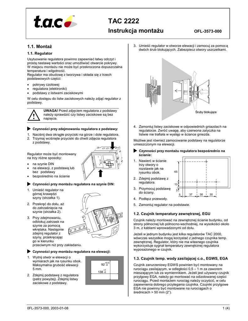 TAC 2222 Instrukcja montażu OFL-3573-000 3. Umieść regulator w otworze elewacji i zamocuj za pomocą dwóch śrub blokujących. Zabezpiecz otwory uszczelkami. 1.1. Montaż 1.1. Regulator Usytuowanie regulatora powinno zapewniać łatwy odczyt i prostą nastawę wartości oraz umożliwiać otwarcie pokrywy. W miejscu montażu nie może być przekroczona dopuszczalna temperatura i wilgotność. Regulator ma obudowę z tworzywa i składa się z trzech podstawowych części: • • • pokrywy czołowej regulatora (elektroniki) podstawy z listwami zaciskowymi W celu dostępu do listw zaciskowych należy zdjąć regulator z podstawy. ! UWAGA! Przed zdjęciem regulatora z podstawy należy sprawdzić czy listwy zaciskowe są bez napięcia. Czynności przy zdejmowaniu regulatora z podstawy: 1. Naciśnij dwa okrągłe przyciski na górze i dole regulatora. 2. Trzymaj wciśnięte przyciski do chwili zdjęcia regulatora z podstawy. • 4. Zamontuj listwy zaciskowe w odpowiednich gniazdac h na regulatorze. Zwróć uwagę, aby czerwona zatyczka na listwie nie trafiała w występ w ściance gniezda. Możliwe jest również zamocowanie podstawy na regulatorze umieszczonym na elewacji. Czynności przy montażu regulatora bezpośrednio na ścianie: Regulator może być montowany na trzy różne sposoby: • • Śruby blokujące 1. Nawierć w ścianie trzy otwory o rozstawie jak na rysunku obok. na szynie DIN na elewacji, z podstawą lub bez podstawy bezpośrednio na ścianie Czynności przy montażu regulatora na szynie DIN: 2. Zdejmij podstawę z regulatora. 3. Przymocuj podstawę do ściany. 1. Umieść regulator na górnej krawędzi szyny (strzałka 1). 65 13 3 5 37 30 30 4. Podłącz przewody. 2. Przekręć do dołu, aż do zatrzaśnięcia na szynie (strzałka 2). 5. Zamontuj regulator na podstawie. 3. Przy zdejmowaniu, odblokuj zatrzask na szynie za pomocą wkrętaka. Następnie zdejmij regulator z szyny, przekręcając go w kierunku przeciwnym niż przy zakładaniu. Czujnik należy montować na zewnętrznej ścianie budynku, od strony północnej lub północno-wschodniej, na wysokości około 3 m, z kablami wprowadzonymi od dołu. 1.2. Czujnik temperatury zewnętrznej, EGU Czynności przy montażu regulatora na elewacji: 1. Wytnij otwór w elewacji o wymiarach jak na rysunku obok. Maksymalna grubość elewacji 5 mm. 2. Zdejmij podstawę z regulatora (patrz powyżej). Zdejmij listwy zaciskowe z podstawy. 0FL-3573-000, 2003-01-08 Jeżeli w jednym budynku jest kilka regulatorów TAC 2000, wówczas wszystkie mogą korzystać z jednego czujnika temp. zewnętrznej. Regulator, który nie ma własnego czujnika wykorzystuje sygnał temperatury zewnętrznej regulatora wyposażonego w czujnik. 1.3. Czujnik temp. wody zasilającej c.o., EGWS, EGA 92 +0.5 -0 +1 138 -0 Czujnik zanurzeniowy EGWS powinien być montowany na rurociągu zasilającym, w odległości 0,5 ÷ 1 m za zaworem mieszającym lub za wymiennikiem. Jeżeli jest używany czujnik przylgowy EGA, należy go montować na odizolowanej części rurociągu. Przed montażem rurociąg należy oczyścić, w celu zapewnienia dobrego przylegania czujnika. Czujniki przylgowe EGA nie powinny być montowane na rurociągach o średnicach > 50 mm (2”). 1 (4) Instrukcja montażu TAC 2222 1.4. Czujnik temperatury odniesienia, EGRL 1.5. Czujnik temp. ciepłej wody użytkowej, EGWS Temperatura w części budynku, która jest najbardziej wrażliwa na zmiany klimatu, jest najwłaściwszym odniesieniem do regulacji temperatury wody zasilającej c.o.. Jest również ważne, żeby na czujnik nie oddziaływały żadne dodatkowe czynniki. Następujące zasady powinny być uwzględnione przy montażu czujnika: • Czujnik należy montować w pomieszczeniach narożnych, położonych w budynku od strony północnej. • Czujnik powinien być umieszczony w najbardziej reprezentatywnym pomieszczeniu. • Czujnik powinien być montowany na wewnętrznych ścianach wykonanych z lekkich materiałów. Na ścianach tych nie mogą być prowadzone rury grzewcze. Czujnik zanurzeniowy EGWS należy montować bezpośrednio za wymiennikiem ciepłej wody użytkowej. 1.6. Czujnik temp. wody powrotnej, EGWS, EGA Czujnik zanurzeniowy EGWS jest montowany w rurociągu powrotnym. W przypadku czujnika przylgowego EGA, należy montować go na odizolowanej części rurociągu. Przed montażem czujnika rurociąg należy starannie oczyścić, w celu zapewnienia dobrego styku między czujnikiem a rurociągiem. 1.7. Siłowniki M5, M15, M42, M44, M500, M750 Wraz z siłownikami i zespołami łączącymi siłowniki z zaworami są dostarczane oddzielne instrukcje. • Pomieszczenie powinno być duże, żeby temperatura nie zależała od ciepła emitowanego przez ludzi i urządzenia. • Grzejniki w pomieszczeniu nie powinny mieć zaworów termostatycznych. Jeżeli są to powinny być nastawione na wartość maksymalną. • Czujnik powinien być swobodnie opływany przez powietrze. • Czujnik montować nie dalej niż 10 m od najbliższego grzejnika, ale nie bezpośrednio nad nim. Jest to ważne szczególnie gdy nie ma mechanicznej wentylacj. 2. Połączenia elektryczne Przewody do regulatora należy podłączyć zgodnie ze schematem przedstawionym poniżej. UWAGA! Wszystkie połączenia o nap.>24V musi wykonać elektryk z uprawnieniami. ! Schemat połączeń elektrycznych 24 V AC (L) G Temp. powrotu c.w.u. Temp. wody c.o. Temp. zewn. Temp. w pom. Temp. powrotu c.o. 1 2 1 2 1 2 1 2 1 2 1 2 B1 M B2 M B3 M B4 M U M U4 M Temp. c.w.u. Sygnał SPC U2 24 V AC lub 230 V AC KC1 24 V AC lub 230 V AC KC2 KC3 TA 2222 G0 X1 X2 U3 M G Wydłużenie Forsowanie cyklu cyklu nocnego dziennego Awaria pompy Y M X1 M G0 TAC Forta Y2 K K2 K3 K4 K5 K6 B R Siłownik zaworu regul. c.w.u. Temp. Sterow. Przegrzew Bucze Program zewnętrzna pompy poranny alarm. tygodniowy 2 do innych regulatorów W M15 Siłownik zaworu regul. c.o. 24 V AC (N) 2 (4) 0FL-3573-000, 2003-01-08 TAC 2222 Instrukcja montażu Załącz zasilanie regulator