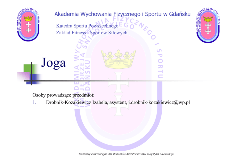 Akademia Wychowania Fizycznego i Sportu w Gdańsku Katedra Sportu Powszechnego Zakład Fitness i Sportów Siłowych Joga Osoby prowadzące przedmiot: 1. Drobnik-Kozakiewicz Izabela, asystent, [email protected] Materiały informacyjne dla studentów AWFiS kierunku Turystyka i Rekreacja Sesja jogi oparta na poznanych pozycjach Materiały informacyjne dla studentów AWFiS kierunku Turystyka i Rekreacja Sesja jogi Sesja jogi oparta na poznanych pozycjach (asanach) Praca w parach oraz trójkach Wykorzystanie przyborów do jogi: koca, klocków oraz paska Praktyka wybranych asan z poszczególnych grup: pozycji stojących, siadów, skłonów, skrętów, wygięć do tyłu, pozycji na mięśnie brzucha oraz regeneracyjnych. Materiały informacyjne dla studentów AWFiS kierunku Turystyka i Rekreacja Sprawdzian praktyczny Sprawdzian praktyczny z prezentacji wybranych pozycji (asan) oraz ich nazw w języku polskim Materiały informacyjne dla studentów AWFiS kierunku Turystyka i Rekreacja Sprawdzian praktyczny Sprawdzian praktyczny obejmuje następujące asany: TADASANA – góra VRSASANA – drzewo UTKATASANA – potęŜny, srogi GARUDASANA – orzeł UTTANASANA – intensywne rozciąganie PRASARITA PADOTTANASANA – intensywne rozciąganie w rozkroku UTTHITA TRIKONASANA - trójkąt Materiały informacyjne dla studentów AWFiS kierunku Turystyka i Rekreacja Sprawdzian praktyczny Sprawdzian praktyczny obejmuje następujące asany: VIRABHADRASANA II - wojownik UTTHITA PARŚVA KONASANA – boczny kąt PARŚVOTTANASANA – boczne rozciąganie ADHO MUKHA ŚVANASANA – pies z głową w dół DANDASANA - kij SVASTIKASANA - pomyślność BADDHA KONASANA – schwytany kąt UPAVISTHA KONASANA – uziemiony kąt (w rozkroku) Materiały informacyjne dla studentów AWFiS kierunku Turystyka i Rekreacja Sprawdzian praktyczny Sprawdzian praktyczny obejmuje następujące asany: JANU SIRSASANA – rozciąganie w siadzie PASCIMOTTANASANA – rozciąganie tylnej części ciała MARISYASANA III – pozycja Maricyego SUPTA PADANGUSTHASANA I – rozciąganie w leŜeniu tyłem ŚAVASANA – martwe ciało, trup Materiały informacyjne dla studentów AWFiS kierunku Turystyka i Rekreacja