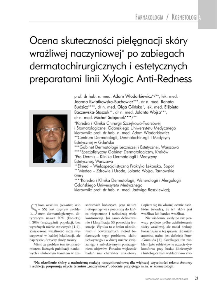 FARMAKOLOGIA / KOSMETOLOGI A Ocena skutecznoÊci piel´gnacji skóry wra˝liwej naczyniowej* po zabiegach dermatochirurgicznych i estetycznych preparatami linii Xylogic Anti-Redness prof. dr hab. n. med. Adam W∏odarkiewicz*/**, lek. med. Joanna Kwiatkowska-Buchowicz***, dr n. med. Renata Budzicz****, dr n. med. Olga Gliƒska•, lek. med. El˝bieta Baczewska-Staszak••, dr n. med. Jolanta Wojsa•••, dr n. med. Micha∏ Sobjanek••••/** *Katedra i Klinika Chirurgii Szcz´kowo-Twarzowej i Stomatologicznej Gdaƒskiego Uniwersytetu Medycznego kierownik: prof. dr hab. n. med. Adam W∏odarkiewicz **Centrum Dermatologii, Dermatochirurgii i Medycyny Estetycznej w Gdaƒsku ***Gabinet Dermatologii Leczniczej i Estetycznej, Warszawa ****Specjalistyczny Gabinet Dermatologiczny, Kraków •Pro Dermis – Klinika Dermatologii i Medycyny Estetycznej, Warszawa ••Elmed – Wielospecjalistyczna Praktyka Lekarska, Sopot •••Medea – Zdrowie i Uroda, Jolanta Wojsa, Tarnowskie Góry ••••Katedra i Klinika Dermatologii, Wenerologii i Alergologii Gdaƒskiego Uniwersytetu Medycznego kierownik: prof. dr hab. n. med. Jadwiga Roszkiewicz); kóra wra˝liwa (sensitive skin – SS) jest cz´stym problemem dermatologicznym, dotyczàcym nawet 50% (kobiety) i 30% (m´˝czyêni) populacji, bez wyraênych ró˝nic etnicznych [1-4]. Zwi´kszona wra˝liwoÊç mo˝e wyst´powaç w ka˝dej lokalizacji, ale najcz´Êciej dotyczy skóry twarzy. Mimo ˝e problem ten jest przedmiotem licznych publikacji naukowych i ulubionym tematem w cza- S sopismach kobiecych, jego natura i etiopatogeneza pozostajà do koƒca niepoznane i wzbudzajà wiele kontrowersji. Ju˝ samo definiowanie i klasyfikacja SS powodujà frustracj´. Wynika to z braku okreÊlonych i powtarzalnych metod badawczych tego problemu, s∏abo uchwytnego i w du˝ej mierze zwiàzanego z subiektywnym postrzeganiem objawów. Ponadto wi´kszoÊç badaƒ ma charakter ankietowy i opiera si´ na w∏asnej ocenie osób, które twierdzà, ˝e ich skóra jest wra˝liwa lub bardzo wra˝liwa. Nie wiadomo, kiedy po raz pierwszy podj´to prób´ zdefiniowania skóry wra˝liwej, ale nadal brakuje konsensusu w tej sprawie. Zdaniem autorów, trafna jest definicja Pons-Guirauda [5], okreÊlajàca ten problem jako subiektywne uczucie dyskomfortu przy braku klinicznych i histologicznych wyk∏adników cho- *Na okreÊlenie skóry z nadmiernà reakcjà naczynioruchowà dla wi´kszej czytelnoÊci tekstu Autorzy i redakcja proponujà u˝ycie terminu „naczyniowa”, obecnie przyj´tego m.in. w kosmetologii. DERMATOLOGIA ESTETYCZNA /VOL.14 /NR 1 /2012 27 F ARMAKOLOGIA / KOSMETOLOGIA roby. Inne, podobne opisy SS uwzgl´dniajà rol´ czynników zewn´trznych i okreÊlajà jà jako subiektywne wra˝enie dyskomfortu bez klinicznych objawów podra˝nienia i stanu zapalnego jako reakcji na leki, kosmetyki, Êrodki higieny i inne, niepowodujàce u wi´kszoÊci populacji ˝adnych objawów [5-7]. OkreÊlenie SS jako innej ni˝ u wi´kszoÊci populacji reakcji skóry na bodêce zosta∏o spopularyzowane przez Unilever Research w Wielkiej Brytanii [1]. Obecnie uwa˝a si´, ˝e SS jest wypadkowà interakcji czynników endo- i egozgenneych. Nie jest jednolitym bytem klinicznym. W miar´ post´pu badaƒ naukowych prawdopodobne jest zdywersyfikowanie zagadnienia SS. Prób´ t´ podjà∏ Pons-Guiraud [5], wyodr´bniajàc trzy typy SS: - skóra bardzo wra˝liwa, reagujàca ostro lub przewlekle na ró˝norodne czynniki, przy du˝ej komponencie psychogennej (emocjonalnej); - skóra wra˝liwa uwarunkowana Êrodowiskowo (environmentally sensitive skin), reagujàca rumieniem na czynniki Êrodowiskowe; - skóra wra˝liwa na kosmetyki (cosmetically sensitive skin), reagujàca krótkotrwale na produkty do jej piel´gnacji. Nieco inny jest podzia∏ wed∏ug Muizzuddina i wsp. [8]. Autorzy ci wyodr´bniajà skór´ delikatnà (delicate skin), ∏atwo ulegajàcà zaburzeniom bariery naskórkowej, bez stanu zapalnego; skór´ reaktywnà (reactive skin), odpowiadajàcà zapalnie na bodêce, bez zmian w jej barierze; skór´ typu stingers, charakteryzujàcà si´ reakcjà neurosensorycznà nawet na niewielkà jej stymulacj´. Wed∏ug Kligmana i wsp. [1] w kr´gu SS wyodr´bniç nale˝y cztery typy: - podra˝nienie subiektywne, odnoszàce si´ do poczucia dyskomfortu bez objawów klinicznych; 28 DERMATOLOGIA ESTETYCZNA /VOL.14 /NR 1 /2012 Ocena skutecznoÊci piel´gnacji skóry wra˝liwej naczyniowej po zabiegach dermatochirurgicznych i estetycznych preparatami linii Xylogic Anti-Redness STRESZCZENIE S∏owa kluczowe: skóra wra˝liwa naczyniowa, rumieƒ, teleangiektazje Wst´p: Skóra wra˝liwa z zaburzeniami naczyniowymi (skóra wra˝liwa naczyniowa) jest bardzo cz´stym problemem kosmetycznym i terapeutycznym. Ze wzgl´du na z∏o˝onà, wieloczynnikowà i nie w pe∏ni poznanà patogenez´ stanowi wyzwanie terapeutyczne. Cel badaƒ: Ocena skutecznoÊci preparatów z linii Xylogic Anti-Redness w kompleksowym leczeniu chorych ze skórà wra˝liwà naczyniowà. Materia∏ i metody: Badaniem obj´to 63 osoby (56 kobiet i 7 m´˝czyzn) w wieku od 23 do 64 lat (Êrednia 42 lata) z problemem skóry wra˝liwej naczyniowej. Objawy kliniczne oceniano przed leczeniem i po nim, na podstawie 4-stopniowej (0-3) skali NRS (National Rosacea Society) oraz dolegliwoÊci subiektywnych podawanych przez badane osoby. Pacjentów leczono za pomocà urzàdzeƒ wykorzystujàcych Intensive Pulse Light (IPL), Variable Pulse Light (VPL) oraz laserem KTP. Podczas leczenia badani stosowali krem (Xylogic Anti-Redness Protective Oxygene Cream) oraz nanoserum (Xylogic Anti-Redness Protective Nanoserum), jak równie˝ byli poddawani zabiegom profesjonalnym z zastosowaniem maski kriogenicznej (Xylogic Anti-Redness Professional Cryogenic Mask). Czas leczenia wynosi∏ 8 tygodni. Wyniki: U wszystkich badanych obserwowano znamiennà redukcj´ objawów naczyniowych w zakresie rumienia napadowego, utrwalonego oraz teleangie