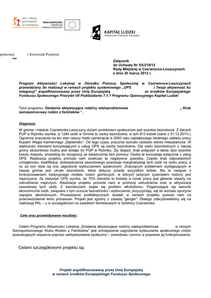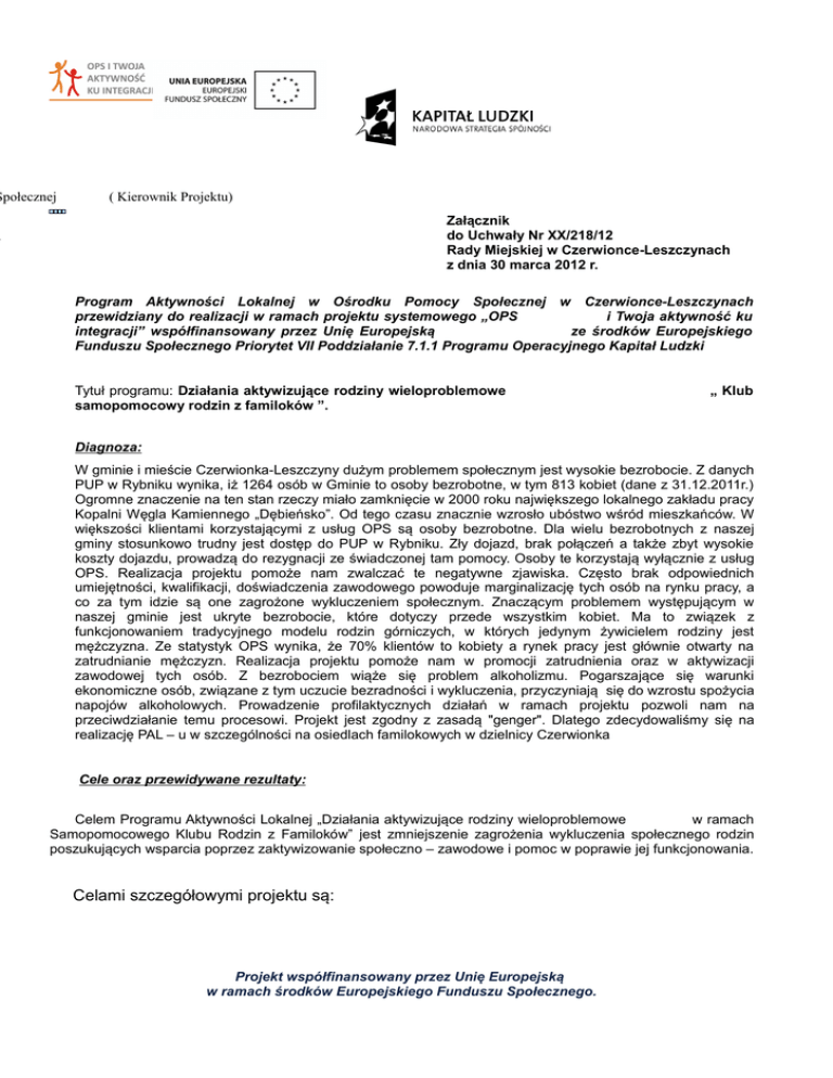 Społecznej ( Kierownik Projektu) Załącznik do Uchwały Nr XX/218/12 Rady Miejskiej w Czerwionce-Leszczynach z dnia 30 marca 2012 r. y Program Aktywności Lokalnej w Ośrodku Pomocy Społecznej w Czerwionce-Leszczynach przewidziany do realizacji w ramach projektu systemowego „OPS i Twoja aktywność ku integracji” współfinansowany przez Unię Europejską ze środków Europejskiego Funduszu Społecznego Priorytet VII Poddziałanie 7.1.1 Programu Operacyjnego Kapitał Ludzki Tytuł programu: Działania aktywizujące rodziny wieloproblemowe samopomocowy rodzin z familoków ”. „ Klub Diagnoza: W gminie i mieście Czerwionka-Leszczyny dużym problemem społecznym jest wysokie bezrobocie. Z danych PUP w Rybniku wynika, iż 1264 osób w Gminie to osoby bezrobotne, w tym 813 kobiet (dane z 31.12.2011r.) Ogromne znaczenie na ten stan rzeczy miało zamknięcie w 2000 roku największego lokalnego zakładu pracy Kopalni Węgla Kamiennego „Dębieńsko”. Od tego czasu znacznie wzrosło ubóstwo wśród mieszkańców. W większości klientami korzystającymi z usług OPS są osoby bezrobotne. Dla wielu bezrobotnych z naszej gminy stosunkowo trudny jest dostęp do PUP w Rybniku. Zły dojazd, brak połączeń a także zbyt wysokie koszty dojazdu, prowadzą do rezygnacji ze świadczonej tam pomocy. Osoby te korzystają wyłącznie z usług OPS. Realizacja projektu pomoże nam zwalczać te negatywne zjawiska. Często brak odpowiednich umiejętności, kwalifikacji, doświadczenia zawodowego powoduje marginalizację tych osób na rynku pracy, a co za tym idzie są one zagrożone wykluczeniem społecznym. Znaczącym problemem występującym w naszej gminie jest ukryte bezrobocie, które dotyczy przede wszystkim kobiet. Ma to związek z funkcjonowaniem tradycyjnego modelu rodzin górniczych, w których jedynym żywicielem rodziny jest mężczyzna. Ze statystyk OPS wynika, że 70% klientów to kobiety a rynek pracy jest głównie otwarty na zatrudnianie mężczyzn. Realizacja projektu pomoże nam w promocji zatrudnienia oraz w aktywizacji zawodowej tych osób. Z bezrobociem wiąże się problem alkoholizmu. Pogarszające się warunki ekonomiczne osób, związane z tym uczucie bezradności i wykluczenia, przyczyniają się do wzrostu spożycia napojów alkoholowych. Prowadzenie profilaktycznych działań w ramach projektu pozwoli nam na przeciwdziałanie temu procesowi. Projekt jest zgodny z zasadą "genger". Dlatego zdecydowaliśmy się na realizację PAL – u w szczególności na osiedlach familokowych w dzielnicy Czerwionka Cele oraz przewidywane rezultaty: Celem Programu Aktywności Lokalnej „Działania aktywizujące rodziny wieloproblemowe w ramach Samopomocowego Klubu Rodzin z Familoków” jest zmniejszenie zagrożenia wykluczenia społecznego rodzin poszukujących wsparcia poprzez zaktywizowanie społeczno – zawodowe i pomoc w poprawie jej funkcjonowania. Celami szczegółowymi projektu są: Projekt współfinansowany przez Unię Europejską w ramach środków Europejskiego Funduszu Społecznego. podniesienie kwalifikacji, umiejętności i kompetencji zawodowych osób bezrobotnych i nieaktywnych zawodowo, w tym osób zagrożonych wykluczeniem społecznym poprzez szkolenia zawodowe, podniesienie własnej samooceny i poprawa wizerunku uczestników projektu poprzez udział w spotkaniach z doradcą zawodowym i psychologiem, poprzez uczestnictwo w spotkaniach samopomocowych grup wsparcia, poprzez uczestnictwo w zajęciach terapii pedagogicznej, poprawa umiejętności społecznych poprzez udział w spotkaniach w ramach samopomocowych grup wsparcia, poprzez uczestnictwo w zajęciach terapii pedagogicznej, poprzez udział w punkcie konsultacyjnym – prawnik i zajęciach komputerowych, podniesienie aktywności zawodowej i nabycie wiedzy nt poruszania się na rynku pracy poprzez pomoc psychologiczną i pomoc doradcy zawodowego. Cele projektu są realne do osiągnięcia, dlatego, że Uczestnikom Projektu zaplanowano kompleksową pomoc praktycznie na każdej płaszczyźnie ich życia. Rezultaty: Rezultaty twarde: 8 osób podniesie kwalifikacje zawodowe w wyniku uczestnictwa w szkoleniach zawodowych i otrzyma certyfikat. Rezultaty miękkie: - 8 osób poprawi umiejętności psychospołeczne (w zakresie pracy w zespole, umiejętności komunikacyjnych świadomości praw i obowiązków, umiejętność obsługi komputera), - 8 osób podniesienie poziomu samooceny oraz wiary we własne siły, - 8 osób podniesie umiejętności społeczne poprzez udział w samopomocowych grupach wsparcia, poprzez uczestnictwo w zajęciach terapii pedagogicznej, - 8 osób podniesie własną samoocenę i poprawi wizerunek poprzez uczestnictwo w spotkaniach z psychologiem i w spotkaniach z doradcą zawodowym, poprzez uczestnictwo w zajęciach terapii pedagogicznej. Adresaci programu: Program Aktywności Lokalnej przewidziany do realizacji przez Ośrodek Pomocy Społecznej w CzerwionceLeszczynach zakłada pracę na rzecz rodzin społeczności lokalnej dzielnicy Czerwionka ze szczególnym uwzględnieniem: Projekt współfinansowany przez Unię Europejską w ramach środków Europejskiego Funduszu Społecznego. 1. 2. 3. Rodzin / osób bezrobotnych. Rodzin / osób nieaktywnych zawodowo. Młodzieży w wieku 15 – 25 lat W ramach Samopomocowego Klubu Rodzin przewidujemy aktywizację społeczno-zawodową w oparciu o instrumenty aktywnej integracji oraz działania środowiskowe między innymi: osób bezrobotnych, członków rodzin nieaktywnych zawodowo z uwagi na i osobami zależnymi, młodzieży w wieku 15 – 25 lat zagrożonej wykluczeniem społecznym. opiekę nad dziećmi Opis planowanych działań: Z uwagi na ideę Programu Aktywności Lokalnej, która opiera się na inicjatywach społeczności lokalnej, zakładamy, że część realizowanych w ramach Programu Aktywności Lokalnej działań będzie wynikała z potrzeb i inicjatywy osób biorących w nim udział. Zakładamy jednak już teraz działania, których potrzebę re