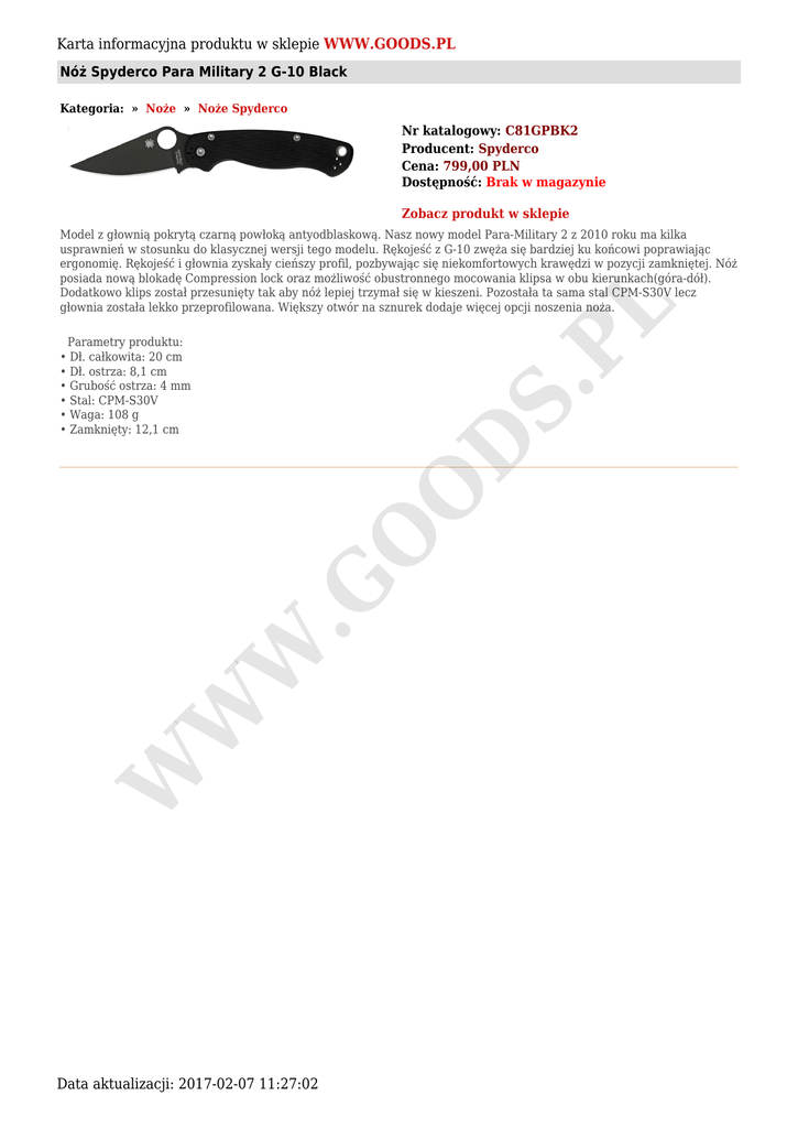 Karta informacyjna produktu w sklepie WWW.GOODS.PL Nóż Spyderco Para Military 2 G-10 Black Kategoria: » Noże » Noże Spyderco Nr katalogowy: C81GPBK2 Producent: Spyderco Cena: 799,00 PLN Dostępność: Brak w magazynie Zobacz produkt w sklepie S. PL Model z głownią pokrytą czarną powłoką antyodblaskową. Nasz nowy model Para-Military 2 z 2010 roku ma kilka usprawnień w stosunku do klasycznej wersji tego modelu. Rękojeść z G-10 zwęża się bardziej ku końcowi poprawiając ergonomię. Rękojeść i głownia zyskały cieńszy profil, pozbywając się niekomfortowych krawędzi w pozycji zamkniętej. Nóż posiada nową blokadę Compression lock oraz możliwość obustronnego mocowania klipsa w obu kierunkach(góra-dół). Dodatkowo klips został przesunięty tak aby nóż lepiej trzymał się w kieszeni. Pozostała ta sama stal CPM-S30V lecz głownia została lekko przeprofilowana. Większy otwór na sznurek dodaje więcej opcji noszenia noża. W W W .G O O D Parametry produktu: • Dł. całkowita: 20 cm • Dł. ostrza: 8,1 cm • Grubość ostrza: 4 mm • Stal: CPM-S30V • Waga: 108 g • Zamknięty: 12,1 cm Data aktualizacji: 2017-02-07 11:27:02