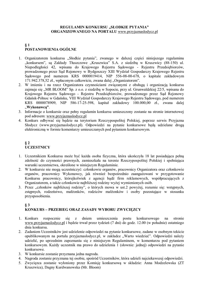 REGULAMIN KONKURSU „SŁODKIE PYTANIA” ORGANIZOWANEGO NA PORTALU www.przyjaznaslodycz.pl §1 POSTANOWIENIA OGÓLNE 1. Organizatorem konkursu „Słodkie pytania”, zwanego w dalszej części niniejszego regulaminu „konkursem”, są Zakłady Tłuszczowe „Kruszwica” S.A. z siedzibą w Kruszwicy (88-150) ul. Niepodległości 42, wpisana do Krajowego Rejestru Sądowego - Rejestru Przedsiębiorców, prowadzonego przez Sąd Rejonowy w Bydgoszczy XIII Wydział Gospodarczy Krajowego Rejestru Sądowego pod numerem KRS 0000019414, NIP 556-08-00-678, o kapitale zakładowym 171.942.378,52 zł., wpłaconym całkowicie, zwana dalej „Organizatorem”. 2. W imieniu i na rzecz Organizatora czynnościami związanymi z obsługą i organizacją konkursu zajmuje się „MR BLOOM” Sp. z o.o. z siedzibą w Sopocie, przy ul. Grunwaldzkiej 22/5, wpisana do Krajowego Rejestru Sądowego - Rejestru Przedsiębiorców, prowadzonego przez Sąd Rejonowy Gdańsk-Północ w Gdańsku, VIII Wydział Gospodarczy Krajowego Rejestru Sądowego, pod numerem KRS 0000078909, NIP 586-17-25-598, kapitał zakładowy 100.000,00 zł., zwana dalej „Wykonawcą”. 3. Informacje o konkursie oraz pełny regulamin konkursu umieszczony zostanie na stronie internetowej pod adresem: www.przyjaznaslodycz.pl 4. Konkurs odbywać się będzie na terytorium Rzeczypospolitej Polskiej, poprzez serwis Przyjazna Słodycz (www.przyjaznaslodycz.pl). Odpowiedzi na pytanie konkursowe będą udzielane drogą elektroniczną w formie komentarzy umieszczanych pod pytaniem konkursowym. §2 UCZESTNICY 1. Uczestnikiem Konkursu może być każda osoba fizyczna, która ukończyła 18 lat posiadająca pełną zdolność do czynności prawnych, zamieszkała na terenie Rzeczypospolitej Polskiej i spełniająca warunki uczestnictwa, określone w niniejszym Regulaminie. 2. W konkursie nie mogą uczestniczyć: członkowie organów, pracownicy Organizatora oraz członkowie organów, pracownicy Wykonawcy, jak również bezpośrednio zaangażowani w przygotowanie Konkursu pracownicy, którejkolwiek z agencji bądź firm reklamowych, współpracujących z Organizatorem, a także członkowie najbliższej rodziny wyżej wymienionych osób. 3. Przez „członków najbliższej rodziny”, o których mowa w ust.2 powyżej, rozumie się: wstępnych, zstępnych, rodzeństwo, małżonków, rodziców małżonków i osoby pozostające w stosunku przysposobienia. §3 KONKURS – PRZEBIEG ORAZ ZASADY WYBORU ZWYCIĘZCY 1. Konkurs rozpocznie się z dniem umieszczenia postu konkursowego na stronie www.przyjaznaslodycz.pl i będzie trwał przez tydzień (7 dni) do godz. 12.00 (w południe) ostatniego dnia konkursu. 2. Zadaniem Uczestników jest udzielenie odpowiedzi na pytanie konkursowe, zadane w osobnym tekście opublikowanym na portalu przyjaznaslodycz.pl, w zakładce „Warto wiedzieć”. Odpowiedzi należy udzielić, po uprzednim zapoznaniu się z niniejszym Regulaminem, w komentarzu pod pytaniem konkursowym. Każdy uczestnik ma prawo do udzielenia 1 (słownie: jednej) odpowiedzi na pytanie konkursowe. 3. W konkursie zostanie przyznana jedna nagroda. 4. Nagroda zostanie przyznana tej osobie, spośród Uczestników, która udzieli najciekawszej odpowiedzi. 5. Zwycięzca zostanie wyłoniony przez Komisję konkursową w składzie: Anna Modzelewska (ZT Kruszwica), Dagny Kurdwanowska (Mr. Bloom) 6. Zwycięzca zostanie ogłoszony na stronie www.przyjaznaslodycz.pl 7. Zwycięzca proszony jest o przesłanie swoich danych adresowych drogą mailową na adres: [email protected] w celu ustalenia adresu wysyłki Nagrody. 8. Nagrodą w Konkursie jest: - dla osoby, która udzieli najciekawszej odpowiedzi na zadane pytanie – pendrive z logo Przyjazna Słodycz o wartości 40 zł. 9. Nagroda zostanie przesłana zwycięzcy drogą pocztową. Koszty wysyłki pokrywa Wykonawca. 10. Zwycięzca ma prawo tylko do jednej Nagrody. Zwycięzca nie może przenieść prawa do otrzymania Nagrody na inne osoby. 11. Nagroda konkursowa będzie wydana wyłącznie w postaci, określonej niniejszym Regulaminem, bez możliwości wypłaty jej równowartości w gotówce. §4 REKLAMACJE 1. Reklamacje dotyczące spraw związanych z Konkursem należy składać na piśmie wraz z uzasadnieniem oraz wskazaniem imienia, nazwiska i adresu Uczestnika zgłaszającego reklamację, do Wykonawcy konkursu, na adres: „MR BLOOM” Sp. z o.o. z siedzibą w Sopocie, 81-758 Sopot, ul. Grunwaldzka 22/5, z dopiskiem "REKLAMACJA", w terminie 7 dni od daty opublikowania informacji o zwycięzcy - bezpośrednio lub listem poleconym (o zachowaniu terminu decyduje data stempla pocztowego). 2. Reklamacje przesłane po upływie powyższego terminu nie będą rozpatrywane. 3. Reklamacje złożone w terminie, wskazanym w ust. 1 niniejszego paragrafu, zostaną rozpatrzone w terminie 14 dni od dnia ich doręczenia Wykonawcy. 4. Zgłaszający reklamację, zostaną powiadomieni o jej rozpatrzeniu listem poleconym, wysłanym na adres do korespondencji, wskazany w zgłoszeniu reklamacji, o którym mowa w §4 ust.1 niniejszego Regulaminu, najpóźniej w terminie 7 dni od daty rozpatrzenia reklamacji przez Komisję Reklamacyjną. 5. Decyzja Komisji Reklamacyjnej, co do zgłoszonej reklamacji, jest ostateczna. §5 PRZETWARZANIE DANYCH OSOBOWYCH 1. Administratorem danych osobowych udostępnianych przez Uczestników jest Organizator. 2. Organizator oświadcza, że przetwarza dane osobowe Uczestników zgodnie z przepisami ustawy z dnia 29 sierpnia 1997 r. o ochronie danych osobowych (t.j. - Dz. U. z 2002 r. Nr 101 poz. 926 z późn.zm.). 3. Podanie danych osobowych przez Uczestnika jest dobrowolne, jednak niezbędne w celu wzięcia udziału w Konkursie, przyznania i odbioru nagrody. 4. Dane osobowe Uczestników będą przetwarzane wyłącznie w celu przeprowadzenia i prawidłowej realizacji Konkursu. Przystępując do Konkursu Uczestnik wyraża zgodę na przetwarzanie przez Organizatora jego danych osobowych w celu realizacji Konkursu, w zakresi