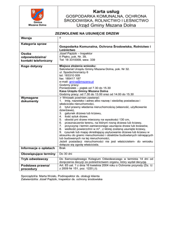 Karta usług GOSPODARKA KOMUNALNA, OCHRONA ŚRODOWISKA, ROLNICTWO I LEŚNICTWO Gmina Mszana Dolna Urząd Gminy Mszana Dolna ZEZWOLENIE NA USUNIĘCIE DRZEW Wersja Kategoria spraw 4 Gospodarka Komunalna, Ochrona Środowiska, Rolnictwo i Leśnictwo Osoba odpowiedzialna/ kontakt telefoniczny Józef Pajdzik – Inspektor II Piętro, pok. Nr. 39, Tel: 18 3310009, wew. 339 Kogo dotyczy Informacje o opłatach Miejsce złożenia wniosku: Sekretariat Urzędu Gminy Mszana Dolna, pok. Nr 32. ul. Spadochroniarzy 6 tel: 183310 009 fax: 185417 187 e-mail: [email protected] Godziny pracy: Poniedziałek – piątek od 7.30 do 15.30 Kasa Urzędu Gminy Mszana Dolna Godziny pracy: od 7.30 do 13.00 oraz od 14.00 do 15.30 Ø Wniosek powinien zawierać: 1. imię, nazwisko i adres albo nazwę i siedzibę posiadacza i właściciela nieruchomości, 2. tytuł prawny władania nieruchomością (własność, użytkowanie dzierżawa), 3. gatunek drzewa lub krzewu, 4. ilość sztuk drzew, 5. obwód pni drzew mierzony na wysokości 130 cm, 6. przeznaczenie terenu, na którym rosną drzewa lub krzewy, 7. przyczynę i termin zamierzonego usunięcia drzew lub krzewów, 8. wielkość powierzchni w m² , z której zostaną usunięte krzewy, 9. rysunek lub mapę określającą usytuowanie drzewa lub krzewu w stosunku do granic nieruchomości i obiektów budowlanych istniejących lub budowanych na tej nieruchomości, Jeżeli posiadacz nieruchomości nie jest właścicielem- do wniosku dołącza się zgodę właściciela. Brak Obowiązujące terminy Do 30 dni Tryb odwoławczy Do Samorządowego Kolegium Odwoławczego w terminie 14 dni od doręczenia decyzji za pośrednictwem organu, który wydał decyzję. Art. 83 ust. 1 z dnia 16 kwietnia 2004 roku o Ochronie przyrody (Dz. U. z 2009 Nr 151, poz. 1220 j.t). Wymagane dokumenty Podstawa prawna/ procedury Sporządził/a: Marta Wcisło, Podinspektor ds. obsługi klienta Zatwierdził/a: Józef Pajdzik, Inspektor ds. ochrony środowiska