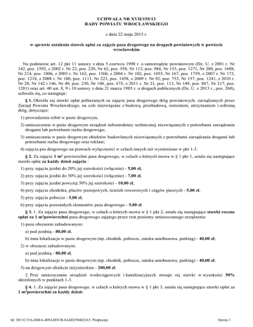 UCHWAŁA NR XVII/155/13 RADY POWIATU WROCŁAWSKIEGO z dnia 22 maja 2013 r. w sprawie ustalenia stawek opłat za zajęcie pasa drogowego na drogach powiatowych w powiecie wrocławskim Na podstawie art. 12 pkt 11 ustawy z dnia 5 czerwca 1998 r. o samorządzie powiatowym (Dz. U. z 2001 r. Nr 142, poz. 1592, z 2002 r. Nr 23, poz. 220, Nr 62, poz. 558, Nr 113, poz. 984, Nr 153, poz. 1271, Nr 200, poz. 1688, Nr 214, poz. 1806, z 2003 r. Nr 162, poz. 1568, z 2004 r. Nr 102, poz. 1055, Nr 167, poz. 1759, z 2007 r. Nr 173, poz. 1218, z 2008 r. Nr 180, poz. 1111, Nr 223, poz. 1458, z 2009 r. Nr 92, poz. 753, Nr 157, poz. 1241, z 2010 r. Nr 28, Nr 142 i 146, Nr 40, poz. 230, Nr 106, poz. 675, z 2011 r. Nr 21, poz. 113, Nr 149, poz. 887, Nr 217, poz. 1281) oraz art. 40 ust. 8, 9 i 10 ustawy z dnia 21 marca 1985 r. o drogach publicznych (Dz. U. z 2013 r., poz. 260), uchwala się, co następuje: § 1. Określa się stawki opłat pobieranych za zajęcie pasa drogowego dróg powiatowych, zarządzanych przez Zarząd Powiatu Wrocławskiego, na cele niezwiązane z budową, przebudową, remontem, utrzymaniem i ochroną dróg, dotyczące: 1) prowadzenia robót w pasie drogowym, 2) umieszczenia w pasie drogowym urządzeń infrastruktury technicznej niezwiązanych z potrzebami zarządzania drogami lub potrzebami ruchu drogowego; 3) umieszczenia w pasie drogowym obiektów budowlanych niezwiązanych z potrzebami zarządzania drogami lub potrzebami ruchu drogowego oraz reklam; 4) zajęcia psa drogowego na prawach wyłączności w celach innych niż wymienione w pkt 1-3. § 2. Za zajęcie 1 m2 powierzchni pasa drogowego, w celach o których mowa w § 1 pkt 1, ustala się następujące stawki opłat za każdy dzień zajęcia : 1) przy zajęciu jezdni do 20% jej szerokości (włącznie) - 5,00 zł, 2) przy zajęciu jezdni do 50% jej szerokości (włącznie) - 7,00 zł, 3) przy zajęciu jezdni powyżej 50% jej szerokości - 10,00 zł, 4) przy zajęciu chodnika, placów postojowych, ścieżek rowerowych i ciągów pieszych - 5,00 zł, 5) przy zajęciu pobocza - 5,00 zł, 6) przy zajęciu pozostałych elementów pasa drogowego - 5,00 zł. § 3. 1. Za zajęcie pasa drogowego, w celach o których mowa w § 1 pkt 2, ustala się następujące stawki roczne opłat za 1 m2powierzchni pasa drogowego zajętego przez rzut poziomy umieszczanego urządzenia: 1) poza obszarem zabudowanym: a) pod jezdnią - 80,00 zł, b) inna lokalizacja w pasie drogowym (np. chodnik, pobocze, zatoka autobusowa, parking) - 40,00 zł; 2) w obszarze zabudowanym: a) pod jezdnią - 80,00 zł, b) inna lokalizacja w pasie drogowym (np. chodnik, pobocze, zatoka autobusowa, parking) - 40,00 zł; 3) na drogowym obiekcie inżynierskim - 200,00 zł. 2. Przy umieszczaniu urządzeń wodociągowych i kanalizacyjnych stosuje się stawki w wysokości 50% określonych w punktach 1-3. § 4. 1. Za zajęcie pasa drogowego, w celach o których mowa w § 1 pkt 3, ustala się następujące stawki opłat za 1 m2powierzchni za każdy dzień: Id: 3811C15A-D48A-4054-B3CB-8A4D2504D2A5. Podpisany Strona 1 1) zajętej przez rzut poziomy obiektu budowlanego - 1,00 zł; 2) zajętej przez reklamę umieszczoną w pasie drogowym - 2,00 zł, 3) zajętej przez inne obiekty (np. rusztowania) - 1,00 zł. 2. Za umieszczenie w pasie drogowym reklamy zwierającej informacje o gminie w postaci planów, tablic, plansz, „witaczy” itp. oraz reklam informujących o imprezach organizowanych przez jednostki organizacyjne gminy, ustala się zerową stawkę opłaty. § 5. Za zajęcie 1 m2powierzchni pasa drogowego, w celach o których mowa w § 1 pkt 4 z wyjątkiem pojemników na odpady, ustala się następujące stawki opłat za każdy dzień zajęcia : 1) przy zajęciu jezdni do 20% jej szerokości (włącznie) - 4,00 zł, 2) przy zajęciu jezdni do 50% jej szerokości (włącznie) - 4,00 zł, 3) przy zajęciu jezdni powyżej 50% jej szerokości - 4,00 zł, 4) przy zajęciu pobocza i terenów utwardzonych (chodniki, zatoki autobusowe, parkingi) - 4,00 zł, 5) przy zajęciu pozostałych elementów pasa drogowego - 3,00 zł. § 6. Traci moc uchwała Rady Powiatu Wrocławskiego nr XVIII/108/04 z dnia 29 kwietnia 2004 roku w sprawie wysokości stawek opłat za zajęcie pasa drogowego. § 7. Wykonanie niniejszej uchwały powierza się Zarządowi Powiatu Wrocławskiego. § 8. Uchwała wchodzi w życie po upływie 14 dni od dnia ogłoszenia w Dzienniku Urzędowym Województwa Dolnośląskiego. Przewodniczący Rady Powiatu Wrocławskiego Michał Trębacz Id: 3811C15A-D48A-4054-B3CB-8A4D2504D2A5. Podpisany Strona 2