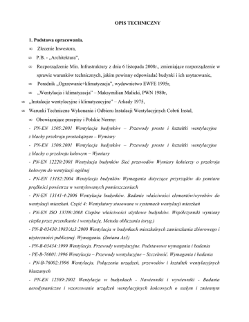 OPIS TECHNICZNY 1. Podstawa opracowania. • Zlecenie Inwestora, • P.B. - „Architektura”, • Rozporządzenie Min. Infrastruktury z dnia 6 listopada 2008r., zmieniające rozporządzenie w sprawie warunków technicznych, jakim powinny odpowiadać budynki i ich usytuowanie, • Poradnik ,,Ogrzewanie+klimatyzacja”, wydawnictwo EWFE 1995r, • „Wentylacja i klimatyzacja” – Maksymilian Malicki, PWN 1980r, • ,,Instalacje wentylacyjne i klimatyzacyjne” – Arkady 1975, • Warunki Techniczne Wykonania i Odbioru Instalacji Wentylacyjnych Cobrti Instal, • Obowiązujące przepisy i Polskie Normy: - PN-EN 1505:2001 Wentylacja budynków – Przewody proste i kształtki wentylacyjne z blachy przekroju prostokątnym – Wymiary - PN-EN 1506:2001 Wentylacja budynków – Przewody proste i kształtki wentylacyjne z blachy o przekroju kołowym – Wymiary - PN-EN 12220:2001 Wentylacja budynków Sieć przewodów Wymiary kołnierzy o przekroju kołowym do wentylacji ogólnej - PN-EN 13182:2004 Wentylacja budynków Wymagania dotyczące przyrządów do pomiaru prędkości powietrza w wentylowanych pomieszczeniach - PN-EN 13141-4:2006 Wentylacja budynków. Badanie właściwości elementów/wyrobów do wentylacji mieszkań. Część 4: Wentylatory stosowane w systemach wentylacji mieszkań - PN-EN ISO 13789:2008 Cieplne właściwości użytkowe budynków. Współczynniki wymiany ciepła przez przenikanie i wentylację. Metoda obliczania (oryg.) - PN-B-03430:1983/Az3:2000 Wentylacja w budynkach mieszkalnych zamieszkania zbiorowego i użyteczności publicznej. Wymagania. (Zmiana Az3) - PN-B-03434:1999 Wentylacja. Przewody wentylacyjne. Podstawowe wymagania i badania - PE-B-76001:1996 Wentylacja – Przewody wentylacyjne – Szczelność. Wymagania i badania - PN-B-76002:1996 Wentylacja. Połączenia urządzeń, przewodów i kształtek wentylacyjnych blaszanych - PN-EN 12589:2002 Wentylacja w budynkach - Nawiewniki i wywiewniki - Badania aerodynamiczne i wzorcowanie urządzeń wentylacyjnych końcowych o stałym i zmiennym strumieniu powietrza - PN-EN 15243:2007 Wentylacja budynków. Obliczanie temperatury wewnętrznej, obciążenia i energii w budynkach wyposażonych w systemy klimatyzacji pomieszczeń - PN-EN 1886:2008 Wentylacja budynków. Centrale wentylacyjne i klimatyzacyjne. Właściwości mechaniczne - PN-EN 1751:2001 Wentylacja budynków – Urządzenia wentylacyjne końcowe – Badanie aerodynamiczne przepustnic regulacyjnych i zamykających - ENV 12097:1997 Wentylacja budynków – Sieci przewodów – Wymagania dotyczące części składowych sieci przewodów ułatwiające konserwację sieci przewodów - PrEN 12236 Wentylacja budynków – Podwieszenia i podpory przewodów – Wymagania wytrzymałościowe 2. Zakres opracowania Projekt obejmuje zmiany w zakresie wbudowania wentylacji mechanicznej w wybranych pomieszczeniach budynku: wielofunkcyjny integracyjny stadion sportowy-budynek główny m. Stróże dz. ew. nr 1113/2 obręb nr.0016 Stróże gm. Grybów. 3. Dane wyjściowe: 3.1.Warunki zewnętrzne: Parametry powietrza zewnętrznego wg PN-76/B-03420 dla lata: • strefa klimatyczna II • temperatura zewnętrzna tzl = 30oC, • wilgotność względna φzl = 45%, • zawartość wilgoci xzl = 11,9g/kg, • entalpia hzl = 60,7 kJ/kg, Parametry powietrza zewnętrznego wg PN-76/B-03420 dla zimy: • strefa klimatyczna III • temperatura zewnętrzna tzz = -20oC, • wilgotność względna φzz = 100%, • zawartość wilgoci xzz = 0,8g/kg, • entalpia hzz = -18,5kJ/kg, 3.2.Warunki wewnętrzne: • zima Tn=20-24˚C, • prędkość ruch powietrza w strefie przebywania ludzi <0,3m/s, • wilgotność względna: φzl = 40% ÷ 60%. 4. Rozwiązania projektowe wentylacji mechanicznej. Zaprojektowano trzy układy wentylacji mechanicznej nawiewno-wywiewnej. Poszczególne układy wentylacji realizowane będą przez centrale wentylacyjne firmy VTS Clima. Podział poszczególnych układów dokonano, biorąc pod uwagę funkcje, lokalizacje, wymaganą temperaturę oraz wilgotność w poszczególnych pomieszczeniach. 4.1. System N1-W1 Zaprojektowano układ wentylacji mechanicznej nawiewno-wywiewnej z wymiennikiem krzyżowym. Układ wentylacji realizowany będzie przez centralę wentylacyjną firmy VTS Clima. Zestawienie pomieszczeń objętych wentylacją mechaniczną i opis systemu Nazwa Pomieszczenia Wg. proj. budow. Jadalnia-świetlica (43) Zmywalnia (45) Rozdzielnia (44) V [m3] Temp. Krotność wymiany Ilość powietrza wewnętrzn powietrza wentylac. a nawiew / wywiew nawiew / wywiew °C - [m3/h] PARTER – System N1-W1 129,9 20 28osób*50m3/os. 20,5 20 9/10 27,10 20 10/10 Suma 1400/1400 180/200 270/270 1850/1870 Zaprojektowano centrale wentylacyjną nawiewno – wywiewną nr 1, firmy VTS typ VS15-R-PH-T o wydajności Vn=1850m3/h, Vw=1870m3/h, którą zlokalizowano w pomieszczeniu sanitarnym nr 15 na poziomie parteru budynku. Centrala składa się z sekcji wymiennika krzyżowego, sekcji wentylatorowych nawiewnej i wywiewnej, przepustnic i króćców wlotowych i wylotowych, sekcji nagrzewnicy wodnej, sekcje filtracji składającej się z filtrów klasy EU4. Na kanale nawiewnym i wywiewnym zaprojektowano tłumiki akustyczne firmy TROX typu MSA200-200-100-2-PF o wymiarach podanych na rzutach. Praca instalacji będzie nadzorowana przez system automatycznej regulacji oparty na sterownikach cyfrowych firmy VTS, które współpracowały będą z czujnikiem temperatury umieszczonym w kanale wentylacyjnym wywiewnym, dzięki czemu temperatura w wentylowanym pomieszczeniu utrzymywana będzie w odpowiednich zakresach temperaturowych. W wentylowanych pomieszczeniach z uwagi na fakt, iż nie jest to przebieralnia, zakłada się temperaturę 20°C. Czerpnia powietrza o wymiarach 750x250 typu A firmy Euro-Went z układem zatrzymującym wodę oraz siatką drobnooczkową zlokalizowano w ścianie zewnętrznej budynku. Zaprojektowany system nawiewny realizowany będzie za pomocą kratek wentylacyjnych typu KSH-V