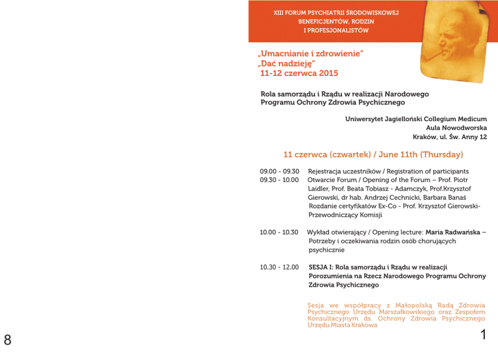 XIII FORUM PSYCHIATRII ŒRODOWISKOWEJ BENEFICJENTÓW, RODZIN I PROFESJONALISTÓW „Umacnianie i zdrowienie” „Daæ nadziejê” 11-12 czerwca 2015 Rola samorz¹du i Rz¹du w realizacji Narodowego Programu Ochrony Zdrowia Psychicznego Uniwersytet Jagielloñski Collegium Medicum Aula Nowodworska Kraków, ul. Œw. Anny 12 11 czerwca (czwartek) / June 11th (Thursday) 09.00 - 09.30 09.30 - 10.00 Rejestracja uczestników / Registration of participants Otwarcie Forum / Opening of the Forum – Prof. Piotr Laidler, Prof. Beata Tobiasz - Adamczyk, Prof.Krzysztof Gierowski, dr hab. Andrzej Cechnicki, Barbara Banaœ Rozdanie certyfikatów Ex-Co - Prof. Krzysztof GierowskiPrzewodnicz¹cy Komisji 10.00 - 10.30 Wyk³ad otwieraj¹cy / Opening lecture: Maria Radwañska – Potrzeby i oczekiwania rodzin osób choruj¹cych psychicznie 10.30 - 12.00 SESJA I: Rola samorz¹du i Rz¹du w realizacji Porozumienia na Rzecz Narodowego Programu Ochrony Zdrowia Psychicznego Sesja we wspó³pracy z Ma³opolsk¹ Rad¹ Zdrowia Psychicznego Urzêdu Marsza³kowskiego oraz Zespo³em Konsultacyjnym ds. Ochrony Zdrowia Psychicznego Urzêdu Miasta Krakowa 8 1 Moderacja / Moderation: Andrzej Cechnicki, Niels Pörksen Wyk³ady wprowadzaj¹ce / Introductory lectures: Stanis³aw Kracik – Moja wizja Szpitala im. J. Babiñskiego Maciej Pilecki – Moja wizja Kliniki Psychiatrycznej w Szpitalu Uniwersyteckim £ukasz Cichocki – Moja wizja rozwoju opieki psychiatrycznej w Ma³opolsce Dyskusja panelowa/ Panel discussion: Moderator: Andrzej Cechnicki, Niels Pörksen, Uczestnicy: Stanis³aw Kracik, Maciej Pilecki, Anita Orze³-Nowak, Micha³ Marsza³ek, Jolanta Chrzanowska, Anna Czech, £ukasz Cichocki, Rafa³ Barañski 12.00 - 12.30 Komitet organizacyjny: Joanna Palka– przewodnicz¹ca Agnieszka Lewonowska-Banach – wiceprzewodnicz¹ca dr n. med. £ukasz Cichocki – wiceprzewodnicz¹cy Rada Naukowa: Prof. dr hab. Beata Tobiasz-Adamczyk Prof. dr hab. Józef Krzysztof Gierowski Prof. dr hab. Bogdan de Barbaro dr n. med. Maciej Pilecki mgr Anna Bielañska dr Artur Kochañski Prof. dr hab. Maria Za³uska Prof. dr hab. Katarzyna Prot-Klinger Prof. dr hab. Jacek Wciórka Prof. Niels Pörksen Przerwa kawowa / Coffee break Sesja organizowana przy wspó³pracy z Pracowni¹ Badañ nad Psychoterapi¹ Psychoz Stowarzyszenia na Rzecz Rozwoju Psychiatrii i Opieki Œrodowiskowej 12.30 - 14.00 Komitet Naukowy: dr hab. Andrzej Cechnicki – przewodnicz¹cy SESJA II: Zrozumieæ schizofreniê Moderacja / Moderation: Bogdan de Barbaro Przy wspó³pracy z: Komisja ds. Reformy Zarz¹du G³ównego Polskiego Towarzystwa Psychiatrycznego Ma³opolska Filia Sekcji Naukowej Psychiatrii Œrodowiskowej i Rehabilitacji PTP Ma³opolska Rada ds. Psychiatrii Polskie Towarzystwo na Rzecz Psychologicznego i Spo³ecznego Podejœcia do Psychoz (PTPS) Polsko-Niemieckie Towarzystwo Zdrowia Psychicznego Stowarzyszenie „Otwórzcie Drzwi” Stowarzyszenie Rodzin „Zdrowie Psychiczne” Wyk³ady wprowadzaj¹ce / Introductory lectures: Jerzy Zadêcki – Zaburzenia JA w schizofrenii Film z seminarium „Zrozumieæ schizofreniê” Jacek Wciórka – Rozumienie choroby psychicznej Panel beneficjentów i profesjonalistów: Moderator: Bogdan de Barbaro. Uczestnicy: Boles³aw Gorgol, Dorota Du¿yk-Wypich, Barbara Banaœ, Jacek Bomba, Jerzy Zadêcki, Anna Bielañska, Joanna Franczyk-Glita, Aneta Kalisz 2 Uczestnicy otrzymuj¹ 9 punktów edukacyjnych 7 14.00 – 15.00 Op³aty: 10 z³ beneficjenci i studenci 30 z³ rodziny osób choruj¹cych 70 z³ profesjonaliœci Op³ata zawiera: fee, materia³y konferencyjne, czasopismo Dla Nas i Rodziny, lunch Sesja organizowana przy wspó³pracy z Ma³opolsk¹ Fili¹ Sekcji Psychiatrii Œrodowiskowej i Rehabilitacji PTP i Stowarzyszeniem „Rewersy Kultury” 15.00 – 17.00 Wyk³ady wprowadzaj¹ce / Introductory lectures: Anna Liberadzka – Przeciw wykluczeniu - Potrzeby i oczekiwania beneficjentów - wstêpny raport z Polski Artur Kochañski - Wizerunek osoby choruj¹cej psychicznie wœród psychiatrów Wp³ata na konto: 88 1240 1431 1111 0010 0537 9768 Bank PeKaO S.A. I O. Kraków Dyskusja panelowa / Panel discussion: Moderator: £ukasz Cichocki Stowarzyszenie na Rzecz Rozwoju Psychiatrii i Opieki Œrodowiskowej Pl. Sikorskiego 2/8 31-115 Kraków W tytule przelewu: Forum 2015 + imiê i nazwisko Organizatorzy: Uniwersytet Jagielloñski Collegium Medicum UJ CM Katedra Psychiatrii Zak³ad Psychiatrii Œrodowiskowej Stowarzyszenie na Rzecz Rozwoju Psychiatrii i Opieki Œrodowiskowej ŒRODOW STOWARZYSZENIE PSYCHIATRII I OPIE KI NA RZECZ ROZWOJU ISKOWEJ 6 SESJA III: Piêtno i jego pokonywanie Moderacja / Moderation: £ukasz Cichocki Zg³oszenia: Termin nadsy³ania zg³oszeñ: 15 maja. Prosimy o zg³oszenia drog¹ mailow¹. [email protected] tel. 12 421 17 30 koordynator: Iwona Kurgan-S³yœ 6 Lunch Moderator: £ukasz Cichocki, Uczestnicy / Participants: Artur Kochañski, Anna Liberadzka, Joanna Hañderek, Barbara Banaœ, Maria Radwañska, Andrzej Cechnicki, Ewa Bartecka-Pi³asiewicz, Hubert Kaszyñski 17.00 Zebranie osób i organizacji wspieraj¹cych Porozumienie na Rzecz NPOZP oraz Zarz¹du Naukowej Sekcji Psychiatrii Œrodowiskowej i Rehabilitacji PTP /Meeting of people and organizations supporting Agreement for the National Program of Mental Health Care and of The Board of the Scientific Section of Community Psychiatry and Rehabilitation at Polish Psychiatric Association 3 12 czerwca (pi¹tek) / June 12th (Friday) Barbara Banaœ – 10 lat Stowarzyszenia Otwórzcie Drzwi – bilans sukcesów i pora¿ek Sesja IV i V organizowana przy wspó³pracy z Pracowni¹ Badañ nad Psychoterapi¹ Psychoz SRP i Polskim Towarzystwem na Rzecz Psychologicznego i Spo³ecznego Podejœcia do Psychoz (PTPS) 09.00 - 11.00 SESJA IV: Rola psychoterapii w leczeniu osób choruj¹cych psychicznie (The role of psychotherapy in treatment of people suffering from mental illness) Dorota Du¿yk-Wypich - Co w nas zostawi³a wizyta Daniela Fishera? Uczestnicy/Partic