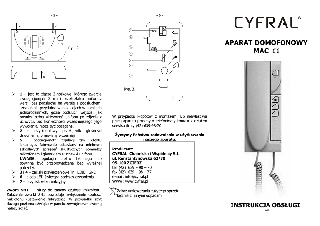 ` –5– B –6– C 1 2 Rys. 2 3 + - 4 APARAT DOMOFONOWY MAC 5 6 A 7 Rys. 3. 1 – jest to złącze 2-nóżkowe, którego zwarcie zworą (jumper 2 mm) przekształca unifon z wersji bez podsłuchu na wersję z podsłuchem, szczególnie przydatną w instalacjach w domkach jednorodzinnych, gdzie podsłuch wejścia, jak również pełna aktywność unifonu po zdjęciu z uchwytu, bez konieczności wcześniejszego jego wywołania, może być pożądana. 2 – trzystopniowy przełącznik głośności dzwonienia, omawiany wcześniej 5 – potencjometr regulacji tzw. efektu lokalnego, fabrycznie ustawiany na minimum szkodliwych sprzężeń akustycznych pomiędzy mikrofonem i głośnikiem słuchawki unifonu, UWAGA: regulacja efektu lokalnego nie powinna być przeprowadzana bez wyraźnej potrzeby. 3 i 4 – zaciski przyłączeniowe linii LINE i GND 6 – dioda LED świecąca podczas dzwonienia 7 – przycisk wielofunkcyjny Zwora SH1 – służy do zmiany czułości mikrofonu. Założenie zworki SH1 powoduje zwiększenie czułości mikrofonu (ustawienie fabryczne). W przypadku zbyt dużego poziomu dźwięku w panelu zewnętrznym zworkę należy zdjąć. W przypadku kłopotów z montażem, lub niewłaściwą pracą aparatu prosimy o telefoniczny kontakt z działem serwisu firmy (42) 639-98-70. Życzymy Państwu zadowolenia w użytkowania naszego aparatu. Producent: CYFRAL Chabelska i Wspólnicy S.J. ul. Konstantynowska 62/70 95-100 ZGIERZ tel. (42) 639 – 98 – 70 fax (42) 639 – 98 – 77 e-mail: [email protected] WWW: www.cyfral.pl Zakaz umieszczania zużytego sprzętu łącznie z innymi odpadami INSTRUKCJA OBSŁUGI (1v2) –2– –3– –4– SZANOWNI PAŃSTWO ! Jest nam niezmiernie miło, że zdecydowaliście się Państwo na zakup aparatu domofonowego typu MAC. Wierzymy, że dobra jakość i funkcjonalność naszego produktu spełni Państwa oczekiwania. 1 HIGH LOW 2 OFF 3 4 UWAGA: Aparat zapewnia prawidłowe działanie w systemach analogowych CYFRAL opartych na centralach typu TD3, TD4, TD-6 oraz systemach cyfrowych CC1000&1500 2. Rozmieszczenie i opis elementów funkcyjnych. Na rysunku (rys.1) przedstawiono rozmieszczenie podstawowych elementów funkcyjnych aparatu, które pozwalają na: a. regulację sygnału wywołania, którego poziom głośności można ustawić trójstopniowym przełącznikiem 2 w pozycji: HIGH – głośno LOW – cicho OFF – wyłączony b. optyczną sygnalizację wywołania diodą elektroluminescencyjną LED – 3 c. uruchomienie zaczepu elektromagnetycznego – przycisk 1 d. sterowanie pracą innych urządzeń (uruchomienie sterowania bramy, oświetlenia, dodatkowy dzwonek, itp.) – przycisk wielofunkcyjny 4 3. Demontaż aparatu. Aparat domofonowy MAC charakteryzuje się łatwym demontażem holdera aparatu, którego dwie pokrywy połączone są ze sobą plastykowymi zaczepami. Aby Rys. 1 zdjąć pokrywy holdera należy umieścić np. wkrętak kolejno w jednym oraz w drugim otworze pokrywy holdera (wskazanym przez strzałki B i C); naciskając wkrętakiem na zaczepy i jednocześnie palcami odciągając pokrywy rozłożyć holder. Można sobie ułatwić rozłączenie umieszczając wkrętak w prostokątnej szczelinie miedzy pokrywami holdera (strzałka A na rys.2) 4. Montaż unifonu. Po demontażu pokrywy holdera unifonu przewody instalacyjne LINE i GND przychodzące z centrali należy po przełożeniu ich przez otwór obudowy podłączyć do zacisków oznaczonych odpowiednio + (LINE) i – (GND) zgodnie z rysunkiem (rys. 3). Rozmieszczenie ważniejszych elementów regulacyjnych i funkcyjnych zostało również pokazane na tym rysunku. •