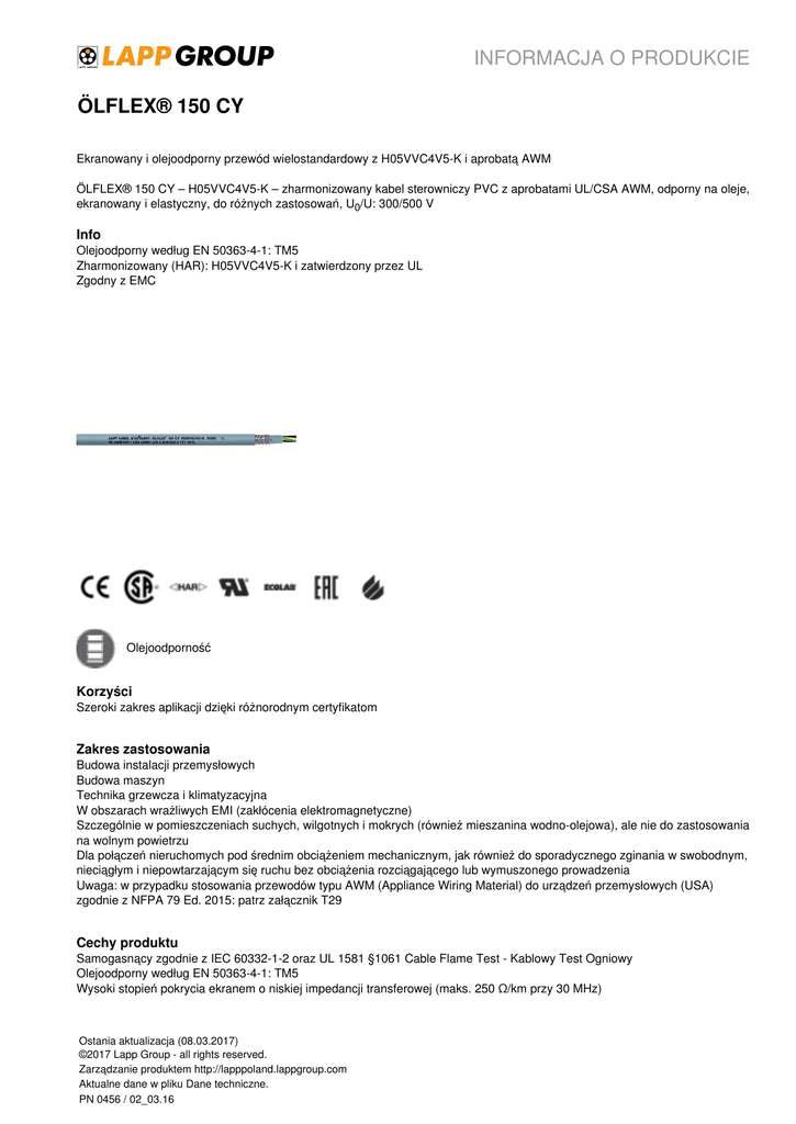 INFORMACJA O PRODUKCIE ÖLFLEX® 150 CY Ekranowany i olejoodporny przewód wielostandardowy z H05VVC4V5-K i aprobatą AWM ÖLFLEX® 150 CY – H05VVC4V5-K – zharmonizowany kabel sterowniczy PVC z aprobatami UL/CSA AWM, odporny na oleje, ekranowany i elastyczny, do różnych zastosowań, U0/U: 300/500 V Info Olejoodporny według EN 50363-4-1: TM5 Zharmonizowany (HAR): H05VVC4V5-K i zatwierdzony przez UL Zgodny z EMC Olejoodporność Korzyści Szeroki zakres aplikacji dzięki różnorodnym certyfikatom Zakres zastosowania Budowa instalacji przemysłowych Budowa maszyn Technika grzewcza i klimatyzacyjna W obszarach wrażliwych EMI (zakłócenia elektromagnetyczne) Szczególnie w pomieszczeniach suchych, wilgotnych i mokrych (również mieszanina wodno-olejowa), ale nie do zastosowania na wolnym powietrzu Dla połączeń nieruchomych pod średnim obciążeniem mechanicznym, jak również do sporadycznego zginania w swobodnym, nieciągłym i niepowtarzającym się ruchu bez obciążenia rozciągającego lub wymuszonego prowadzenia Uwaga: w przypadku stosowania przewodów typu AWM (Appliance Wiring Material) do urządzeń przemysłowych (USA) zgodnie z NFPA 79 Ed. 2015: patrz załącznik T29 Cechy produktu Samogasnący zgodnie z IEC 60332-1-2 oraz UL 1581 §1061 Cable Flame Test - Kablowy Test Ogniowy Olejoodporny według EN 50363-4-1: TM5 Wysoki stopień pokrycia ekranem o niskiej impedancji transferowej (maks. 250 Ω/km przy 30 MHz) Ostania aktualizacja (08.03.2017) ©2017 Lapp Group - all rights reserved. Zarządzanie produktem http://lapppoland.lappgroup.com Aktualne dane w pliku Dane techniczne. PN 0456 / 02_03.16 INFORMACJA O PRODUKCIE ÖLFLEX® 150 CY Normy i aprobaty H05VVC4V5-K (EN 50525-2-51) UL AWM Style 21098 CSA AWM I A/B II A/B Przewody wielostandardowe mają nominalne przekroje żył podane w mm² lub w AWG/kcmil. Przekrój główny znajduje się w poniższej tabeli, odpowiadający mu przekrój w drugim systemie można znaleźć w załączniku T16. Przekrój żyły w drugim systemie jest zazwyczaj większy od podanej poniżej wartości nominalnej. Budowa produktu Żyła cienkodrutowa z czystej miedzi Izolacja żyły: PVC Żyły skręcone warstwowo Płaszcz wewnętrzny z PVC, szary Oplot z ocynowanych drucików miedzianych Płaszcz z PVC, podwyższona olejoodporność, szary (RAL 7001) Dane techniczne Klasyfikacja: ETIM 5.0 Class-ID: EC000104 Opis klasy ETIM 5.0: Przewód sterowniczy Oznaczenie żył: Czarny z białymi numerami zgodny z VDE 0293-1 Budowa żyły: Z cienkich drucików według VDE 0295, klasa 5/IEC 60228, klasa 5 Minimalny promień gięcia: Połączenia sporadycznie ruchome: 20 x średnica zewnętrzna Połączenia nieruchome: 6 x średnica zewnętrzna Napięcie nominalne: HAR U0/U: 300/500 V UL/CSA: 600 V Napięcie próbne: 3000 V Żyła ochronna: G = z żyłą ochronną żółto - zieloną X = bez żyły ochronnej Zakres temperatury: Sporadycznie ruchome: HAR: od -5°C do +70°C UL/CSA: od -5°C do +90°C Połączenia nieruchome: HAR: od -40°C do +70°C UL/CSA: od -40°C do +90°C Wskazówka Wszystkie podane wartości dotyczące produktów są wartościami nominalnymi (o ile nie wskazano inaczej). Inne wartości, takie jak np. tolerancje mogą być przedstawione na zamówienie (jeżeli są dostępne i przeznaczone do publikacji). Standardowe odcinki proszę sprawdzić na: www.lapppolska.pl Rodzaj opakowania: krążek ≤ 30 kg lub ≤ 250 m, w przeciwnym razie bęben Prosimy określić rodzaj opakowania (np. 1 x 500 m bęben lub 5 x 100 m krążek). Fotografie nie mogą być używane do wymiarowania oraz nie stanowią szczegółowego odwzorowania przedstawionych produktów. * Podane ceny to ceny netto bez podatku VAT i dodatkowych opłat. Sprzedaż klientom biznesowym. Ostania aktualizacja (08.03.2017) ©2017 Lapp Group - all rights reserved. Zarządzanie produktem http://lapppoland.lappgroup.com Aktualne dane w pliku Dane techniczne. PN 0456 / 02_03.16 Powered by TCPDF (www.tcpdf.org) Średnica zewnętrzna [mm] Indeks miedzi [kg/km] Waga [kg/km] 0015602 2 X 0,75 8,5 40 109 0015603 3 G 0,75 8,9 51 125 0015604 4 G 0,75 9,6 70 157 0015605 5 G 0,75 10,3 77 180 0015607 7 G 0,75 12,3 93 226 0015612 12 G 0,75 14,8 155 325 0015702 2X1 8,8 46,4 121 0015703 3G1 9,4 76 145 0015704 4G1 10 80 180 0015705 5G1 11 95 203 0015707 7G1 13 118 273 0015712 12 G 1 15,6 195 425 0015802 2 X 1,5 10 59,2 151 0015803 3 G 1,5 10,5 84 159 0015804 4 G 1,5 11,4 94,8 211 0015805 5 G 1,5 12,7 122 241 0015807 7 G 1,5 15,1 143 306 0015812 12 G 1,5 17,8 254 480 0015903 3 G 2,5 11,9 120 245 0015904 4 G 2,5 13,2 170 295 0015905 5 G 2,5 14,7 205 365 0015907 7 G 2,5 17,5 241 480 ÖLFLEX® 150 CY INFORMACJA O PRODUKCIE Liczba żył i przekrój [mm²] ÖLFLEX® 150 CY Ostania aktualizacja (08.03.2017) ©2017 Lapp Group - all rights reserved. Zarządzanie produktem http://lapppoland.lappgroup.com Aktualne dane w pliku Dane techniczne. PN 0456 / 02_03.16 Powered by TCPDF (www.tcpdf.org) Numer katalogowy