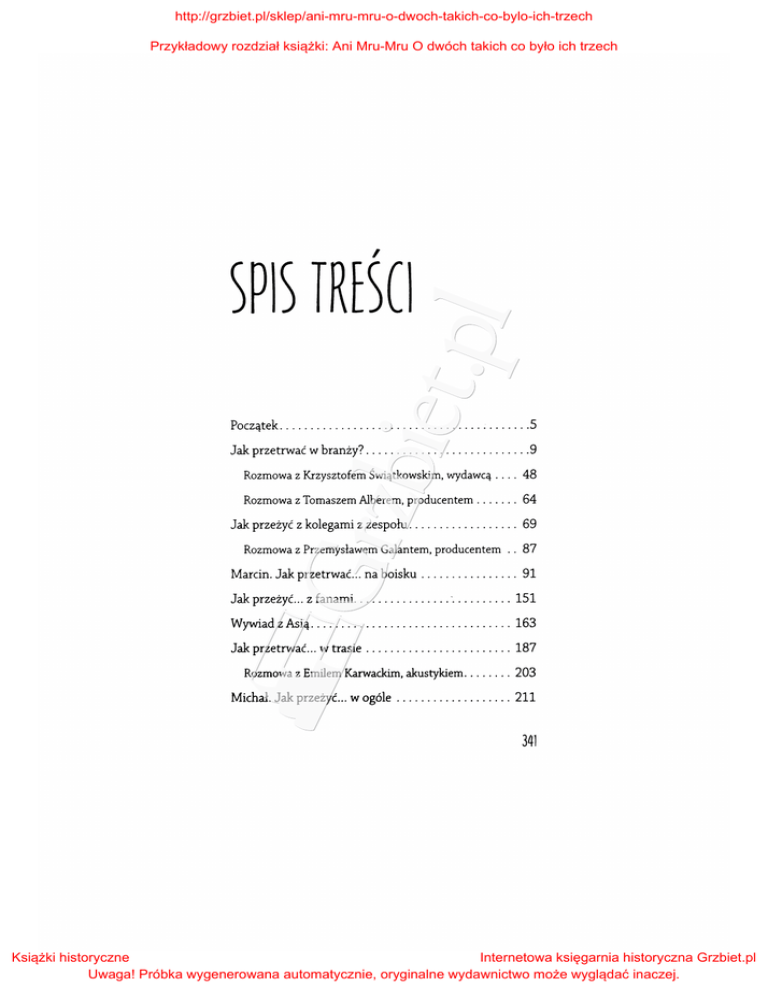 http://grzbiet.pl/sklep/ani-mru-mru-o-dwoch-takich-co-bylo-ich-trzech Przykładowy rozdział książki: Ani Mru-Mru O dwóch takich co było ich trzech l )PI) TRf)(l Początek ......................................... S Jak przetrwać w branży? ........................... 9 Rozmowa z Krzysztofem Świątkowskim, wydawcą . . . . 48 Rozmowa z Tomaszem Alberem, producentem ....... 64 Jak przeżyć z kolegami z zespołu. . . . . . . . . . . . . . . . . . 69 Rozmowa z Przemysławem Galantem, producentem .. 87 Marcin. Jak przetrwać ... na boisku . . . . . . . . . . . . . . . . 91 Jak przeżyć ... z fanami. ............... -. ......... 151 WywiadzAsią ................................. 163 Jak przetrwać ... w trasie ........................ 187 Rozmowa z Emilem Karwackim, akustykiem ........ 203 Michał. Jak przeżyć ... w ogóle ................... 211 341 Książki historyczne Internetowa księgarnia historyczna Grzbiet.pl Uwaga! Próbka wygenerowana automatycznie, oryginalne wydawnictwo może wyglądać inaczej. http://grzbiet.pl/sklep/ani-mru-mru-o-dwoch-takich-co-bylo-ich-trzech Przykładowy rozdział książki: Ani Mru-Mru O dwóch takich co było ich trzech Jak przeżyć ... picie ........ . Waldek. Jak żyć w stresie .. . Jak poradzić sobie z cenzurą? Artur.~enadżer .......... . Epitafium ........... --- Książki historyczne Internetowa księgarnia historyczna Grzbiet.pl Uwaga! Próbka wygenerowana automatycznie, oryginalne wydawnictwo może wyglądać inaczej. http://grzbiet.pl/sklep/ani-mru-mru-o-dwoch-takich-co-bylo-ich-trzech Przykładowy rozdział książki: Ani Mru-Mru O dwóch takich co było ich trzech Ani Mru-Mru Jakie jeszcze dyscypliny boju? wchodzą w skład Dziesięcio To się zmienia z każdym rokiem. Część zostaje, część się wymienia. Były narty wodne, łucznictwo, strzelectwo, wspinaczka, trójbój siłowy, triathlon, kajaki. Kolarstwo, golf, gokarty i trójbój albo czwórbój lekkoatletyczny są zawsze. W tym roku był rzut dyskiem, skok wzwyż i bie gi: na sto i tysiąc pięćset metrów. W poprzednim roku skok w dal i pchnięcie kulą. Trójbój czy czwórbój jest traktowany jako jedna dyscyplina, żeby wyrównać szan se. Marny takich kolegów, którzy ważą po sto kilo, więc w skoku wzwyż nie zaszaleją, ale w pchnięciu kulą mogą już sporo nadrobić. Tak sarno, jak ktoś jest słaby w sprin cie, to ma większe szanse na tysiąc pięćset metrów. Dobór dyscyplin należy do mojego szwagra, który trzyc ma to w największej tajemnicy i nawet ja nie wiem, jakie dyscypliny będą w najbliższej edycji. Najfajniejsze jest to, że w każdej z kolejnych edycji ODL-u pojawia się jedna dyscyplina o charakterze typowo dla mnie niesportowym np. wędkarstwo czy grzybobranie. Jak długo trwa cała impreza? Różnie. Pierwsza była rozgrywana tylko w wakacje, dru ga od czerwca do września, a trzecią zaczęliśmy w maju, a skończyliśmy w listopadzie. Jest problem z dopasowa niem terminów. W ostatniej edycji startowało trzed1 chłopaków z kabaretu Smile, więc zgranie naszych 104 Książki historyczne Internetowa księgarnia historyczna Grzbiet.pl Uwaga! Próbka wygenerowana automatycznie, oryginalne wydawnictwo może wyglądać inaczej. http://grzbiet.pl/sklep/ani-mru-mru-o-dwoch-takich-co-bylo-ich-trzech Przykładowy rozdział książki: Ani Mru-Mru O dwóch takich co było ich trzech kalendarzy z ich kalendarzami i jeszcze dopasowanie się całej reszty było sporym wyzwaniem logistycznym. W zawodach bierze udział dwadzieścia osób. Startuje szesnaście, pozostałe cztery to są tak zwane dzikie karty. Jak przyjdzie tych dwadzieścia osób z rodzinami, znajo mymi, do tego dołączą sympatycy naszych zawodów, to czasem na widowni jest !lawet dwieście osób. A jest szansa, z zewnątrz? żeby w waszej imprezie wziął udział ktoś Organizujemy to co prawda w zamkniętym gronie, ale co roku dochodzą nowe osoby. Część rezygnuje, nie może startować z różnych powodów: a to komuś uro dziło się dziecko, a to ktoś się nie sprawdził. Trzon, mniej więcej osiem osób, jest stały. Co roku jest organi zowany tak zwany challenge. W lutym rozgrywane są zawody w trzech dyscyplinach: gokarty, kręgle i bieg. I każdy, kto chce wziąć udział w OD L-u, może wystarto wać w challenge'u, z którego do dziesięcioboju zawsze wchodzą cztery osoby. Ale w tym challenge'u startują też osoby, które zajęły ostatnie cztery miejsca w poprzednim ODL-u. Dlatego challenge też jest nie złym wyzwaniem. Zrobiła się poważna impreza. Pisanie regulaminu do każdej dyscypliny, potem kłótnie, rozmowy, to jest też niezła jatka. - 105 Książki historyczne Internetowa księgarnia historyczna Grzbiet.pl Uwaga! Próbka wygenerowana automatycznie, oryginalne wydawnictwo może wyglądać inaczej.