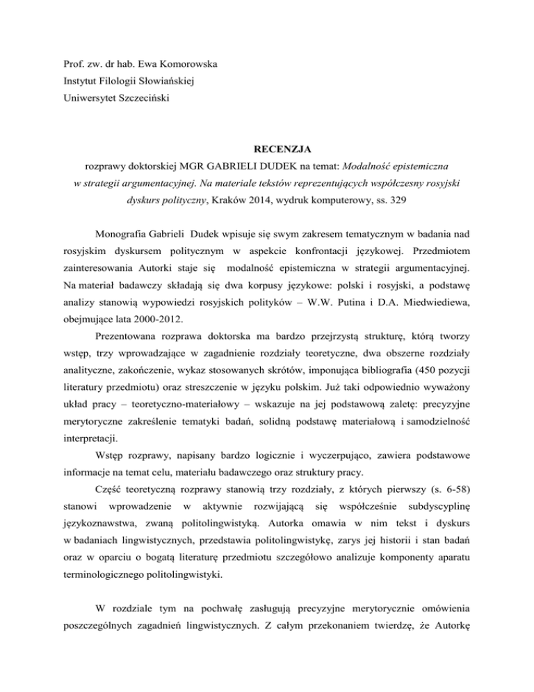 Prof. zw. dr hab. Ewa Komorowska Instytut Filologii Słowiańskiej Uniwersytet Szczeciński RECENZJA rozprawy doktorskiej MGR GABRIELI DUDEK na temat: Modalność epistemiczna w strategii argumentacyjnej. Na materiale tekstów reprezentujących współczesny rosyjski dyskurs polityczny, Kraków 2014, wydruk komputerowy, ss. 329 Monografia Gabrieli Dudek wpisuje się swym zakresem tematycznym w badania nad rosyjskim dyskursem politycznym w aspekcie konfrontacji językowej. Przedmiotem zainteresowania Autorki staje się modalność epistemiczna w strategii argumentacyjnej. Na materiał badawczy składają się dwa korpusy językowe: polski i rosyjski, a podstawę analizy stanowią wypowiedzi rosyjskich polityków – W.W. Putina i D.A. Miedwiediewa, obejmujące lata 2000-2012. Prezentowana rozprawa doktorska ma bardzo przejrzystą strukturę, którą tworzy wstęp, trzy wprowadzające w zagadnienie rozdziały teoretyczne, dwa obszerne rozdziały analityczne, zakończenie, wykaz stosowanych skrótów, imponująca bibliografia (450 pozycji literatury przedmiotu) oraz streszczenie w języku polskim. Już taki odpowiednio wyważony układ pracy – teoretyczno-materiałowy – wskazuje na jej podstawową zaletę: precyzyjne merytoryczne zakreślenie tematyki badań, solidną podstawę materiałową i samodzielność interpretacji. Wstęp rozprawy, napisany bardzo logicznie i wyczerpująco, zawiera podstawowe informacje na temat celu, materiału badawczego oraz struktury pracy. Część teoretyczną rozprawy stanowią trzy rozdziały, z których pierwszy (s. 6-58) stanowi wprowadzenie w aktywnie rozwijającą się współcześnie subdyscyplinę językoznawstwa, zwaną politolingwistyką. Autorka omawia w nim tekst i dyskurs w badaniach lingwistycznych, przedstawia politolingwistykę, zarys jej historii i stan badań oraz w oparciu o bogatą literaturę przedmiotu szczegółowo analizuje komponenty aparatu terminologicznego politolingwistyki. W rozdziale tym na pochwałę zasługują precyzyjne merytorycznie omówienia poszczególnych zagadnień lingwistycznych. Z całym przekonaniem twierdzę, że Autorkę cechuje umiejętność Zaproponowałabym doboru jedną literatury tematu drobną zmianę, a i precyzja mianowicie opisu lingwistycznego. rozważenie możliwości przestawienia rozdziałów 1.3 i 1.4 w taki sposób, by wprowadzenie do politolingwistyki rozpoczęło się od określenia źródeł jego powstania, poprzez zarys historii i stan badan aż do współczesności. Takie przestawienie materiału, moim zdaniem, sprzyjać będzie logicznemu wprowadzeniu w zagadnienie i pozwoli uniknąć drobnych powtórzeń. W rozdziale drugim (s. 65-105) przedstawiane zostały zależności między zakresami pojęciowymi argumentacji, perswazji i manipulacji. Autorka podkreśla dyskusyjność statusu opisywanych pojęć w istniejącej literaturze przedmiotu. Podziw budzi wielość przytaczanych definicji i bogata literatura tematu, która zgromadziła Doktorantka. Materiał wprowadzany jest konsekwentnie i z dużą precyzją lingwistyczną. Natomiast nie bardzo do mnie przemawia konieczność umieszczenia prostego schematu mówiącego o oczywistości, czyli o obecności argumentacji zarówno w perswazji, jak i w manipulacji. Tak dobry, merytoryczny rozdział nie warto psuć prostym schematem. A rozdział jest świetny. Trzeci rozdział teoretyczny (s. 106-130) dotyczy wiodącego problemu dysertacji – modalności epistemicznej na tle innych typów modalności. Gabriela Dudek omawia złożoność kategorii modalności, typy modalności, szczególną uwagę zwracając na modalność epistemiczną. Z kolei Autorka analizuje pojęcie gwaranta i przedstawia wykładniki modalności epistemicznej w języku rosyjskim. Gabriela Dudek wyróżnia wykładniki wskazujące na sąd posiadający gwaranta – mówiącego; wskazujące na sąd nieposiadający gwaranta – mówiącego, ale posiadający gwaranta zewnętrznego; wskazujące na sąd posiadający gwaranta – mówiącego i gwaranta zewnętrznego oraz wykładniki wskazujące na sąd pozbawiony gwaranta. W tej części pracy Gabriela Dudek wprowadza niezbędne ustalenia terminologiczne oraz precyzuje przyjęte w swoich badaniach rozumienie podstawowych pojęć. Drugą zasadniczą część pracy budują rozdziały analityczne, na które składa się rozdział czwarty i piąty. Treść rozdziału czwartego stanowi analiza wykładników modalności epistemicznej w strategii argumentacyjnej w wypowiedziach W.W. Putina (s. 132-215), a piątego – analiza wykładników modalności epistemicznej w strategii argumentacyjnej w wypowiedziach D.A. Miedwiediewa (s. 216-282). Rozdziały te tworzą podstawę materiałową rozprawy. Struktura rozdziału czwartego i piątego jest identyczna z jednym wyjątkiem: w rozdziale czwartym, który poświęcony jest wypowiedziom W.W. Putina Doktorantka wychodzi od charakterystyki całego wyekscerpowanego materiału badawczego (4.1.). Innymi słowy, analiza w punkcie 4.1. dotyczy zarówno wypowiedzi W.W. Putina, jak i D.A. Miedwiediewa. Według mnie nie jest to właściwe. Jeśli rozdział w tytule sygnalizuje o strategii argumentacyjnej W.W. Putina, to konsekwentnie materiał powinien dotyczyć jedynie Putina. Proponuję wprowadzenie do rozdziału piątego analogicznego jak w rozdziale czwartym podrozdziału pierwszego pt. Charakterystyka wyekscerpowanego materiału badawczego D.A. Miedwiediewa i przesunięcia odpowiednich treści z podrozdziału 4.1., a nadto uzupełnienie tytułu podrozdziału 4.1. o nazwisko Putina i ograniczenie materiału do wypowiedzi Putina. W części analitycznej pracy Autorka przyjmuje konsekwentną zasadę opisu: badane wypowiedzi rosyjskich przywódców podzielone zostały gatunkowo od najliczniejszych (wystąpienia, słowo wstępne, wywiad, odpowiedzi na pytania, konferencja prasowa) do najmniej licznych (konferencja internetowa, wideokonferencja, replika, sprawozdanie, spotkanie robocze), co zostało egzempl