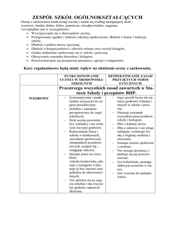 ZESPÓŁ SZKÓŁ OGÓLNOKSZTAŁCĄCYCH Ocenę z zachowania śródroczną( roczną ) ustala się według następującej skali : wzorowe, bardzo dobre, dobre, poprawne, nieodpowiednie, naganne, i uwzględnia ona w szczególności: • Wywiązywanie się z obowiązków ucznia, • Postępowanie zgodne z dobrem szkolnej społeczności, dbałość o honor i tradycję szkoły, • Dbałość o piękno mowy ojczystej, • Dbałość o bezpieczeństwo i zdrowie własne oraz swoich kolegów, • Godne, kulturalne zachowanie się w szkole i poza nią, • Okazywanie szacunku dorosłym i kolegom, • Przeciwstawianie się przejawom przemocy, agresji i wulgarności. Kary regulaminowe będą miały wpływ na obniŜenie oceny z zachowania. FUNKCJONOWANIE UCZNIA W ŚRODOWISKU SZKOLNYM RESPEKTOWANIE ZASAD PRZYJĘTYCH NORM ETYCZNYCH Przestrzega wszystkich zasad zawartych w Statucie Szkoły i przepisów BHP. WZOROWE − Systematycznie i punktualnie uczęszcza na zajęcia pozalekcyjne. − Solidnie i starannie przygotowany do zajęć szkolnych. − Strój ucznia powinien być schludny i nie uwłaczać niczyjej godności. − Reprezentuje klasę i szkołę w konkursach, zawodach sportowych, olimpiadach przedmiotowych, sesjach itp.., osiągając sukcesy. − Inicjuje prace na rzecz klasy /szkoły/środowiska, planuje a następnie wykonuje je bez zarzutu oraz pobudza do aktywności innych. − Nie spóźnia się na zajęcia szkolne i ma wszystkie godziny usprawiedliwione. − Jego sposób bycia nie narusza godności własnej i innych w szkole i poza nią. − Okazuje szacunek wszystkim pracownikom szkoły i kolegom. − Dba o kulturę słowa. − Dba o zdrowie i nie ulega nałogom, wykazuje troskę o higienę osobistą i otoczenia. − Szanuje mienie społeczne i osobiste. − Nie stosuje przemocy i próbuje się jej przeciwstawiać. − Jest koleŜeński, pomaga słabszym uczniom w nauce. − Jest wzorem do naśladowania. Przestrzega wszystkich zasad zawartych w Statucie Szkoły i przepisów BHP. BARDZO DOBRE DOBRE POPRAWNE − Systematycznie i punktualnie uczęszcza na zajęcia pozalekcyjne. − Jest zawsze solidnie przygotowany do zajęć szkolnych. − Chętnie bierze udział w konkursach, zawodach sportowych i sesjach organizowanych w szkole i poza nią. − Ma wszystkie godziny usprawiedliwione i rzadko spóźnia się na zajęcia szkolne. − Starannie i systematycznie przygotowuje się do zajęć. − Wykonuje powierzone prace dla klasy, szkoły, środowiska. − Nie moŜe mieć kar regulaminowych (udzielonych przez dyrektora). − Ma do trzech godzin nieusprawiedliwionych. Rzadko spóźnia się na zajęcia szkolne − Zawsze okazuje szacunek pracownikom szkoły i kolegom. − Dba o kulturę słowa, jest uczciwy, szanuje mienie społeczne i osobiste. − Jest uczniem zadbanym, nie ulega nałogom, nie stosuje przemocy i próbuje przeciwstawiać się jej. − Sporadycznie jest nieprzygotowany do zajęćszkolnych. − Na lekcjach i zajęciach pozalekcyjnych nie stwarza kłopotów − Aktywność średnia, jest biernym uczestnikiem Ŝycia szkolnego, niezbyt skrupulatnie wywiązuje się z powierzonych obowiązków. − Ma do dziesięciu godzin nieusprawiedliwionych. Czasami spóźnia się na zajęcia szkolne − Swoim zachowaniem nie przysparza kłopotów zarówno nauczycielom jak i rodzicom. W przypadku uchybienia uczeń musi naprawić szkodę − Nie stosuje przemocy wobec innych, nie ulega nałogom − Dba o higienę osobistą i stara się dbać o kulturę słowa. − Kulturalnie zachowuje się wobec dorosłych, nie wchodzi w konflikty z kolegami − Szanuje mienie społeczne i indywidualne − Jest uczciwy i prawdomówny − Jest uczniem zadbanym, dba o porządek wokół siebie, nie ulega nałogom, dba o kulturę słowa NIEODPOWIEDNIE NAGANNE − Często jest nieprzygotowany do zajęć − Notorycznie uchyla się od prac na rzecz szkoły − Posiada kary regulaminowe − Ma negatywny wpływ na kolegów − Ma do dwudziestu godzin nieusprawiedliwionych. Często spóźnia się na zajęcia szkolne. − Uczeń swoim zachowaniem przysparza kłopoty nauczycielom i wychowawcy. − Narusza godność innych − Stosuje przemoc. − UŜywa ordynarnego słownictwa − Kłamie i oczernia innych − Często jest nieprzygotowany do zajęć. − Nie bierze udziału w Ŝyciu społecznym klasy i szkoły, a nawet uniemoŜliwia taką działalność innym. − Posiada kary regulaminowe. − Ma powyŜej dwudziestu godzin nieusprawiedliwionych. Bardzo często spóźnia się na zajęcia szkolne. − Stosuje przemoc wobec kolegów oraz innych osób. − Ulega nałogom − Niszczy z premedytacją sprzęt szkolny i mienie społeczne − Jest inicjatorem aspołecznych poczynań w klasie i poza nią − Stwarza sytuacje zagraŜające bezpieczeństwu innych. Ocena z zachowania ustalona przez wychowawcę jest ostateczna (Rozporządzenie MEN z 7.09.2004r) Tryb i zasady ustalania ocen z zachowania. Ocena z zachowania jest oceną jawną i umotywowaną. Ustala ją wychowawca klasy na tydzień przed konferencją uwzględniając samoocenę, opinię całego zespołu klasowego i opinię członków Rady pedagogicznej. Na konferencji Rady Pedagogicznej ocenę z zachowania ucznia zatwierdza się uchwałą Rady Pedagogicznej. Tryb odwołania od ustalenia ocen z zachowania uczniów: Wniosek/ odwołanie o ponowne ustalenie przez wychowawcę klasy oceny z zachowania moŜe być złoŜony przez ucznia lub jego rodziców w terminie trzech dni przed konferencją RP, ale tylko jeŜeli wychowawca ustalił ocenę niezgodnie z przepisami prawa. Ustalona przez komisję roczna ocena klasyfikacyjna z zachowania nie moŜe być niŜsza od ustalonej wcześniej oceny. Ocena z zachowania ustalona przez komisję jest ostateczna.