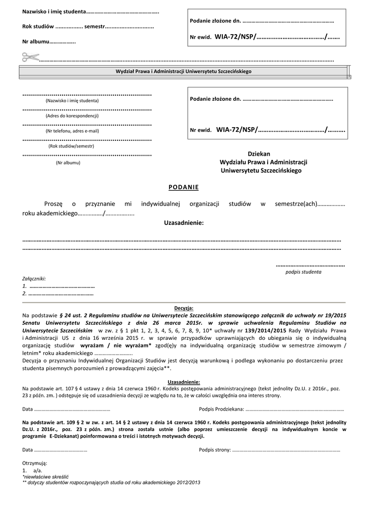 Nazwisko i imię studenta………………………………………….. Rok studiów ................. semestr.............................. Podanie złożone dn. ……………………………………………………… Nr ewid. Nr albumu……………... WIA-72/NSP/…………………………………/……. .………………………………………………................................................................................................................................... Wydział Prawa i Administracji Uniwersytetu Szczecińskiego .................................................................. (Nazwisko i imię studenta) Podanie złożone dn. …………………………………………………….. .................................................................. (Adres do korespondencji) .................................................................. (Nr telefonu, adres e-mail) Nr ewid. WIA-72/NSP/……………………..…………/………. .................................................................. (Rok studiów/semestr) .................................................................. Dziekan Wydziału Prawa i Administracji Uniwersytetu Szczecińskiego (Nr albumu) PODANIE Proszę o przyznanie mi indywidualnej organizacji roku akademickiego……………./….………..... Uzasadnienie: studiów w semestrze(ach)……………… ……………………………………………………………………………………………………………………………………………………………………………… ……………………………………………………………………………………………………………………………………………………………………………… ……………………………………. podpis studenta Załączniki: 1. ……………………………………… 2. ……………………………………… Decyzja: Na podstawie § 24 ust. 2 Regulaminu studiów na Uniwersytecie Szczecińskim stanowiącego załącznik do uchwały nr 19/2015 Senatu Uniwersytetu Szczecińskiego z dnia 26 marca 2015r. w sprawie uchwalenia Regulaminu Studiów na Uniwersytecie Szczecińskim w zw. z § 1 pkt 1, 2, 3, 4, 5, 6, 7, 8, 9, 10* uchwały nr 139/2014/2015 Rady Wydziału Prawa i Administracji US z dnia 16 września 2015 r. w sprawie przypadków uprawniających do ubiegania się o indywidualną organizację studiów wyrażam / nie wyrażam* zgod(ę)y na indywidualną organizację studiów w semestrze zimowym / letnim* roku akademickiego ……………………... Decyzja o przyznaniu Indywidualnej Organizacji Studiów jest decyzją warunkową i podlega wykonaniu po dostarczeniu przez studenta pisemnych porozumień z prowadzącymi zajęcia**. Uzasadnienie: Na podstawie art. 107 § 4 ustawy z dnia 14 czerwca 1960 r. Kodeks postępowania administracyjnego (tekst jednolity Dz.U. z 2016r., poz. 23 z późn. zm. ) odstępuje się od uzasadnienia decyzji ze względu na to, że w całości uwzględnia ona interes strony. Data …………………………………………………… Podpis Prodziekana: ……….……………………..……………………..…………… Na podstawie art. 109 § 2 w zw. z art. 14 § 2 ustawy z dnia 14 czerwca 1960 r. Kodeks postępowania administracyjnego (tekst jednolity Dz.U. z 2016r., poz. 23 z późn. zm.) strona została ustnie (albo poprzez umieszczenie decyzji na indywidualnym koncie w programie E-Dziekanat) poinformowana o treści i istotnych motywach decyzji. Data …………………………………… Podpis strony: ………………………………………………….……………………… Otrzymują: 1. a/a. *niewłaściwe skreślić ** dotyczy studentów rozpoczynających studia od roku akademickiego 2012/2013