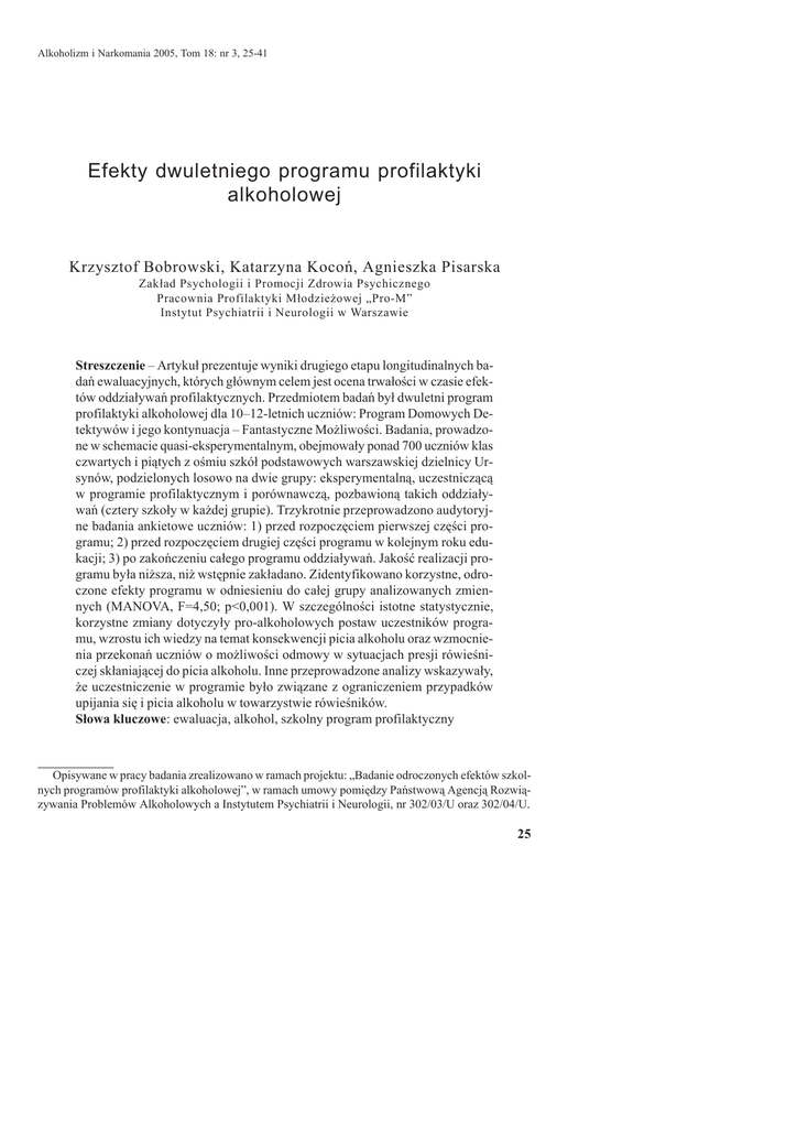 Alkoholizm i Narkomania 2005, Tom 18: nr 3, 25-41 Efekty dwuletniego programu profilaktyki alkoholowej Krzysztof Bobrowski, Katarzyna Kocoń, Agnieszka Pisarska Zakład Psychologii i Promocji Zdrowia Psychicznego Pracownia Profilaktyki Młodzieżowej „Pro-M” Instytut Psychiatrii i Neurologii w Warszawie Streszczenie – Artykuł prezentuje wyniki drugiego etapu longitudinalnych badań ewaluacyjnych, których głównym celem jest ocena trwałości w czasie efektów oddziaływań profilaktycznych. Przedmiotem badań był dwuletni program profilaktyki alkoholowej dla 10–12-letnich uczniów: Program Domowych Detektywów i jego kontynuacja – Fantastyczne Możliwości. Badania, prowadzone w schemacie quasi-eksperymentalnym, obejmowały ponad 700 uczniów klas czwartych i piątych z ośmiu szkół podstawowych warszawskiej dzielnicy Ursynów, podzielonych losowo na dwie grupy: eksperymentalną, uczestniczącą w programie profilaktycznym i porównawczą, pozbawioną takich oddziaływań (cztery szkoły w każdej grupie). Trzykrotnie przeprowadzono audytoryjne badania ankietowe uczniów: 1) przed rozpoczęciem pierwszej części programu; 2) przed rozpoczęciem drugiej części programu w kolejnym roku edukacji; 3) po zakończeniu całego programu oddziaływań. Jakość realizacji programu była niższa, niż wstępnie zakładano. Zidentyfikowano korzystne, odroczone efekty programu w odniesieniu do całej grupy analizowanych zmiennych (MANOVA, F=4,50; p<0,001). W szczególności istotne statystycznie, korzystne zmiany dotyczyły pro-alkoholowych postaw uczestników programu, wzrostu ich wiedzy na temat konsekwencji picia alkoholu oraz wzmocnienia przekonań uczniów o możliwości odmowy w sytuacjach presji rówieśniczej skłaniającej do picia alkoholu. Inne przeprowadzone analizy wskazywały, że uczestniczenie w programie było związane z ograniczeniem przypadków upijania się i picia alkoholu w towarzystwie rówieśników. Słowa kluczowe: ewaluacja, alkohol, szkolny program profilaktyczny Opisywane w pracy badania zrealizowano w ramach projektu: „Badanie odroczonych efektów szkolnych programów profilaktyki alkoholowej”, w ramach umowy pomiędzy Państwową Agencją Rozwiązywania Problemów Alkoholowych a Instytutem Psychiatrii i Neurologii, nr 302/03/U oraz 302/04/U. 25 Krzysztof Bobrowski, Katarzyna Kocoń, Agnieszka Pisarska The results of the two-year alcohol prevention program Abstract – The paper presents results of the second stage of a longitudinal outcome evaluation study aimed mostly at the assessment of preventive intervention effect stability over time. The two-year alcohol prevention program for 10-12-year-olds consisting of the “Home Detectives Program” and its continuation – “Amazing Alternatives” was submitted for evaluation. In the study carried out in a quasi-experimental design over 700 students participated of eight primary schools in Ursynów, the district of Warsaw. The schools were randomly assigned either to the intervention or reference conditions (four schools in each group). Self-report questionnaire was administered to students three times: 1) before the first part of the program; 2) before the second part of the program in the next year of education; 3) when the two-year program was completed. Beneficial effects of the two-year program have been identified for the whole group of the intermediating variables (MANOVA, F=4,50; p<0,001). In particular, significant favorable changes were identified in participants' pro-alcohol attitudes, knowledge about consequences of drinking and assertiveness beliefs. Other analyses indicated that participation in the two-year program was associated with less drunkenness and alcohol drinking with peers. Key words: evaluation, alcohol, school-based prevention program WSTĘP W Polsce badania ewaluacyjne programów profilaktyki alkoholowej prowadzone są rzadko, o czym świadczą przeglądy krajowych badań i publikacji (1, 2). Badania tego typu mają z reguły charakter aplikacyjny, a ich dalekosiężnym celem jest opracowanie, a następnie upowszechnienie działań czy procedur profilaktycznych, skutecznie chroniących młodych ludzi przed negatywnymi konsekwencjami picia alkoholu lub używania innych środków. W ciągu ostatnich pięciu lat ukazały się prace opisujące wyniki badań zaledwie kilku programów: Drugi Elementarz (3), Program Domowych Detektywów (4, 5), Trzy Koła (6), Szkolna interwencja profilaktyczna (7). W cytowanych pracach badano z reguły bezpośrednie efekty programów, bez jakiegokolwiek odroczenia ich w czasie. Brak jest polskich prac badawczych i publikacji opisujących odroczone, średnio- lub długoterminowe, efekty programów profilaktycznych. Niebawem możemy spodziewać się danych na temat odroczonych w czasie efektów dwóch programów wychowawczych Spójrz inaczej (8) oraz Pion (9), zawierających komponenty profilaktyki używania substancji psychoaktywnych. Tego typu projekty to jednak wielka rzadkość. Z drugiej strony, mamy do czynienia z dynamicznie rozwijającym się rynkiem działań profilaktycznych. Według badań ESPAD z 2003 roku blisko 70% młodzieży gimnazjalnej uczestniczyło, w ciągu roku poprzedzającego badanie, w zajęciach profilaktycznych dotyczących kwestii alkoholu, tytoniu lub narkotyków (10). Problem polega jednak na tym, że skuteczność powszechnie realizowanych działań profilaktycznych jest nieokreślona, a nawet, jak sugeruje autor 26 Efekty dwuletniego programu profilaktyki alkoholowej badań ESPAD, wątpliwa ze względu na brak związku pomiędzy uczestniczeniem w zajęciach profilaktycznych a deklarowanym używaniem substancji psychoaktywnych (10). Rozwój badań nad skutecznością programów wczesnej profilaktyki może mieć duże znaczenie dla rozwiązywania różnych problemów społecznych, w tym problemów alkoholowych czy dotyczących używania narkotyków. Tymczasem wsparcie instytucjonalne w obszarze rozwoju programów