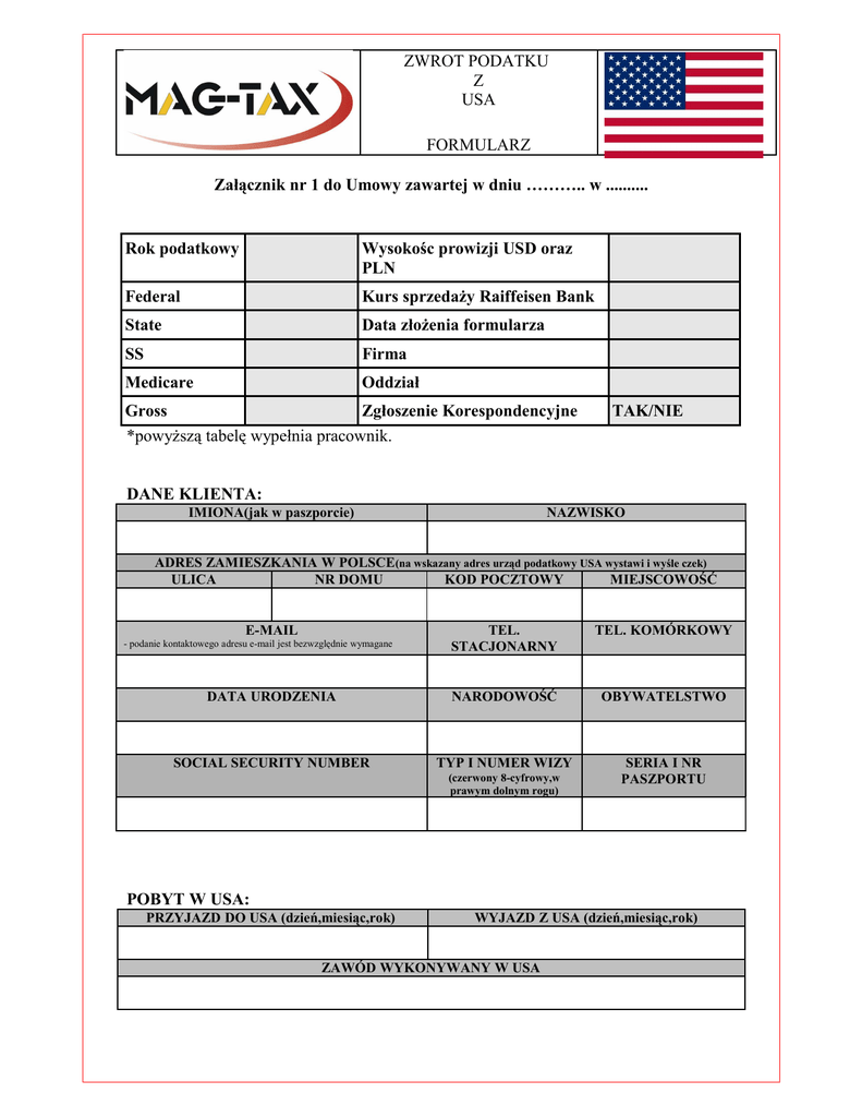ZWROT PODATKU Z USA FORMULARZ Załącznik nr 1 do Umowy zawartej w dniu ……….. w .......... Rok podatkowy Wysokośc prowizji USD oraz PLN Federal Kurs sprzedaży Raiffeisen Bank State Data złożenia formularza SS Firma Medicare Oddział Gross Zgłoszenie Korespondencyjne *powyższą tabelę wypełnia pracownik. TAK/NIE DANE KLIENTA: IMIONA(jak w paszporcie) NAZWISKO ADRES ZAMIESZKANIA W POLSCE(na wskazany adres urząd podatkowy USA wystawi i wyśle czek) ULICA NR DOMU KOD POCZTOWY MIEJSCOWOŚĆ E-MAIL TEL. STACJONARNY TEL. KOMÓRKOWY DATA URODZENIA NARODOWOŚĆ OBYWATELSTWO SOCIAL SECURITY NUMBER TYP I NUMER WIZY SERIA I NR PASZPORTU - podanie kontaktowego adresu e-mail jest bezwzględnie wymagane (czerwony 8-cyfrowy,w prawym dolnym rogu) POBYT W USA: PRZYJAZD DO USA (dzień,miesiąc,rok) WYJAZD Z USA (dzień,miesiąc,rok) ZAWÓD WYKONYWANY W USA ZWROT PODATKU Z WIELKIEJ BRYTANII FORMULARZ Ile dni przebywałeś w 2010 roku w USA :...................................................................................................... 2009............................................. 2008.............................................. 2007.............................................. Czy wypełniałeś przed 2010 r. jakikolwiek formularz o zwrot podatku z USA?.....TAK/NIE................ Jeżeli tak, to podaj rok podatkowy i nazwę formularza bądź nazwę firmy, przez którą się rozliczałeś:......................................................................................................................................................... ZWROT PODATKU: CZEKIEM NA ADRES (podany powyżej w Formularzu) PRZELEWEM NA KONTO DOLAROWE W BANKU AMERYKAŃSKIM - konto musi być prowadzone na nazwisko podatnika - opcja obowiązuje tylko wybranych Stanów - prosimy o podanie dokładnych numerów konta ROUTING NUMBER ACCOUNT NUMBER INFORMACJE DODATKOWE: PRACODAWCA: NAZWA ADRES (TELEFON, E-MAIL) PRACODAWCA 2: NAZWA ADRES (TELEFON, E-MAIL) PRACODAWCA 3: NAZWA ADRES (TELEFON, E-MAIL) Wyrażam zgodę na przetwarzanie moich danych osobowych w celach rozliczenia podatków z USA, zgodnie z Ustawą z dnia 29.08.1997 r. o ochronie danych osobowych, przez firme MAG-TAX Zleceniodawca 2 ZWROT PODATKU Z WIELKIEJ BRYTANII FORMULARZ Wybierz opcję rozliczenia: ? Opcja A „Umowa podatkowa” – zeznania podatkowe wypełniane są w imieniu Klienta z powołaniem się na przepisy umowy podatkowej między Polską a USA: „United Statets – Poland Income Tax Convention”. W tej opcji zwrot podatku federalnego powinien wynieść 100 % kwoty podatku zapłaconego podczas pracy w USA. Jednak ze względu na nie do końca jednoznaczną interpretację części przepisów tej umowy podatkowej przez federalny amerykański urząd skarbowy (IRS), czasami zdarza się, że zastosowane schematy rozliczeń są kwestionowane przez IRS. W takim przypadku IRS może samodzielnie dokona_ korekty zeznania podatkowego i zmniejszenia kwoty zwrotu podatku federalnego (najczęściej do poziomu zbliżonego do kwoty spodziewanego zwrotu, obliczonego w przypadku Opcji B). W 2006 roku taka sytuacja miała miejsce w przypadku ok. 10 % wszystkich rozliczających się osób. W przypadku zakwestionowania zeznania wypełnionego wg Opcji A, Klient otrzyma pomniejszony zwrot podatku federalnego, bez konieczności wysyłania nowych formularzy. ? Opcja B „Standardowe rozliczenie” – zeznania podatkowe wypełniane są w imieniu Klienta z zastosowaniem standardowych metod rozliczeń. Odliczeniu od podstawy opodatkowania podlega podatek stanowy, lokalny, ewentualnie Social Security i Medicare. W przypadku całkowitej sumy zarobków nie przekraczających około 3500 zwrot podatku federalnego powinien wynieść 100% kwoty podatku federalnego zapłaconego podczas pracy w USA. Aby w przybliżeniu określić spodziewany zwrot podatku federalnego w tej opcji, należy skorzystać z kalkulatora podatkowego umieszczonego na stronie www.mag-tax.pl. ................................. (data) ................................. Zleceniodawca 3