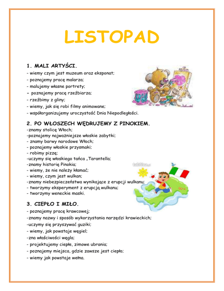 LISTOPAD 1. MALI ARTYŚCI. - wiemy czym jest muzeum oraz eksponat; - poznajemy pracę malarza; - malujemy własne portrety; - poznajemy pracę rzeźbiarza; - rzeźbimy z gliny; - wiemy, jak się robi filmy animowane; - współorganizujemy uroczystość Dnia Niepodległości. 2. PO WŁOSZECH WĘDRUJEMY Z PINOKIEM. -znamy stolicę Włoch; -poznajemy najważniejsze włoskie zabytki; - znamy barwy narodowe Włoch; - poznajemy włoskie przysmaki; - robimy pizzę; -uczymy się włoskiego tańca „Tarantella; -znamy historię Pinokia; - wiemy, że nie należy kłamać; - wiemy, czym jest wulkan; -znamy niebezpieczeństwa wynikające z erupcji wulkanu; - tworzymy eksperyment z erupcją wulkanu; - tworzymy weneckie maski. 3. CIEPŁO I MIŁO. - poznajemy pracę krawcowej; -znamy nazwy i sposób wykorzystania narzędzi krawieckich; -uczymy się przyszywać guziki; - wiemy, jak powstaje węgiel; -zna właściwości węgla; - projektujemy ciepłe, zimowe ubrania; - poznajemy miejsca, gdzie zawsze jest ciepło; - wiemy jak powstaje wełna. 4. NA SANIACH MIKOŁAJA ZWIEDZAMY FINLANDIĘ. - potrafimy wskazać Finlandię na mapie Europy; - wiemy jak wygląda flaga Finlandii; - wiemy z czego słynnie Finlandia i dlaczego odwiedzają ją turyści; - umiemy opowiedzieć o miasteczku Laponii skąd pochodzi Mikołaj; - znamy historię Św. Mikołaja; - piszemy list do Św. Mikołaja; - wiemy, kto to są Muminki i trole; - zna najważniejsze postacie serii książek o Muminkach . Śmieszny portret" 1.Oto karton całkiem biały zaraz będzie w farbie cały. Wezmę pędzel nie żartuję, Śmieszny portret namaluję. Ref. Ha, ha, ha, to naprawdę jestem ja! 2. Oczy wielkie, zezowate i policzki piegowate. Uszy wielkie, jak u słonia, Zęby takie, jak u konia.