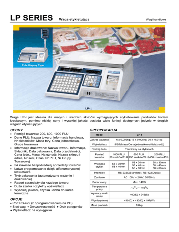 LP SERIES Waga etykietująca Wagi handlowe Waga LP-I jest idealna dla małych i średnich sklepów wymagających etykietowania produktów kodem kreskowym, pomimo niskiej ceny i wysokiej jakości posiada wiele funkcji dostępnych jedynie w drogich wagach etykietujących. CECHY • Pamięć towarów: 200, 600, 1000 PLU • Dane PLU: Nazwa towaru, Informacja handlowa, Nr składników, Masa tary, Cena jednostkowa, Grupa towarowa • Informacje drukowane: Nazwa towaru, Informacja, Składniki, Data pakowania, Data przydatności, Cena jedn., Masa, Należność, Nazwa sklepu i adres, Nr serii, Czas, Nr PLU, Nr Grupy Towarowej • 54 klawisze bezpośredniej sprzedaży towarów • Łatwe programowanie dzięki alfanumerycznej klawiaturze • Tryb pakowania (automatyczne ważenie i drukowanie) • Raport sprzedaży dla każdego towaru • Duża szalka i czytelny wyświetlacz • Wysokiej jakości, szybka i cicha drukarka termiczna OPCJE • Port RS-422 (z oprogramowaniem na PC) • Sieć wag • Dwuzakresowość ● Druk paragonów ● Wyświetlacz na wysięgniku SPECYFIKACJA Model LP-I Zakres ważenia 6 x 0,002kg; 15 x 0,005kg; 30 x 0,01kg Wyświetlacz 5/6/7(Masa/Cena jednostkowa/Należność) Rodzaj druku Termiczny na etykietach Pamięć towarów 1000 PLU 600 PLU 200 PLU 56 znaków/PLU 256 znaków/PLU 456 znaków/PLU Wielkość etykiet 58 x 30mm 58 x 40mm 58 x 30mm 58 x 40mm 58 x 60mm 58 x 30mm 58 x 40mm 58 x 60mm Interfejsy RS-232C(Standard), RS-422(Opcja) Zasilanie AC 100V ~ 240V, 50/60Hz Pobór mocy Max. 140W Temperatura pracy -10 C ~ +40 C Wymiary szalki (mm) 400(D) x 245(S) Wymiary(mm) 410(D) x 430(D) x 197(W) Masa produktu 9,8kg O O
