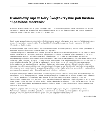 Szkoła Podstawowa nr 16 im. Konstytucji 3 Maja w Jaworznie Dwudniowy rajd w Góry Świętokrzyskie poh hasłem "Spełnione marzenia" W dniach od 4 i 5 czerwca 2016r. grupa składająca się z 13 uczniów naszej szkoły, 9 osób towarzyszących (w tym rodziców) i 2 nauczycieli, wzięła udział w dwudniowym rajdzie po Górach Świętokrzyskich pod hasłem "Spełnione marzenia” zorganizowanym przez Oddział PTTK w Jaworznie. Część naszej grupy pieszo przemierzała Góry Świętokrzyskie, a część pokonywała je na rowerze. Wśród rowerzystów znalazł się najmłodszy uczestnik rajdu – Franciszek Lipski z klasy 1b, który przez dwa dni przejechał dziesiątki kilometrów na dwóch kołach. W pierwszym dniu rajdu jadąc w stronę Chęcin zatrzymaliśmy się na odpoczynek przy ruinach zamku rycerskiego w Sobkowie, a potem zwiedziliśmy zamek królewski w Chęcinach i podziwialiśmy piękną panoramę okolicy ze szczytu baszty. Następnie szlakiem turystycznym wiodącym przez gęste zarośla krzewów (m.in. tarniny) dotarliśmy się na Zelejową Górę, gdzie znajduje się dawny kamieniołom kalcytu o niepowtarzalnym wzorze – "różanki zelejowskiej" (biały i różowy kalcyt zabarwiony wiśniowym hematytem z zielonkawymi i niebieskimi wtrąceniami minerałów miedzi). Trasa tego dnia wiodła przez: Górę Zamkową w Chęcinach – Chęciny – Górę Zelejową – Sitkówkę – Czerwoną Górę, a zakończyła się w pobliżu Jaskini Raj (10 pkt. do GOT – u). Po smacznej obiadokolacji w OW "Jodełka" w miejscowości Święta Katarzyna, w którym mieliśmy zakwaterowanie i krótkim odpoczynku, przystąpiliśmy do rywalizacji drużynowej w konkursie wiedzy o Górach Świętokrzyskich, w konkursie piosenki turystycznej i konkurencjach sportowych. Nasza drużyna "Górskie wilki" zajęła 3 miejsce spośród kilku innych drużyn uczestniczących w rajdzie. Otrzymaliśmy puchar, dyplomy i drobne upominki. Przy ognisku, które zakończyło pierwszy dzień rajdu – śpiewaliśmy piosenki i piekliśmy kiełbaski. W drugim dniu rajdu po obfitym i smacznym śniadaniu wyruszyliśmy w kierunku Nowej Słupi, aby stamtąd wejść na Święty Krzyż zwany też Łysą Górą lub Łyścem, na którym znajduje się Sanktuarium Relikwii Drzewa Krzyża Świętego oraz Klasztor Misjonarzy Oblatów Maryi Niepokalanej. W tym dniu zdobyliśmy także najwyższy szczyt Gór Świętokrzyskich – Łysicę (612m n.p.m.), na której podziwialiśmy piękne gołoborze. Trasa drugiego dnia wiodła przez Nową Słupię – Łysiec Św. Krzyż – Przełęcz Hucką – Bieliny – kapliczkę Św. Mikołaja – Łysicę do Św. Katarzyny (20 pkt. do GOT – u). Po dosyć długiej wędrówce ze smakiem zjedliśmy obiad i trzeba było spakować swoje rzeczy do drogi powrotnej do Jaworzna. Wspaniała pogoda, która towarzyszyła nam przez dwa dni rajdu, piękna przyroda Świętokrzyskiego Parku Narodowego oraz dobra atmosfera sprawiły, że będziemy mile wspominać wspólnie spędzone dni i pewnie w przyszłym roku wyruszymy razem na inny górski szlak, do czego serdecznie zachęcam Agnieszka Liszka 1