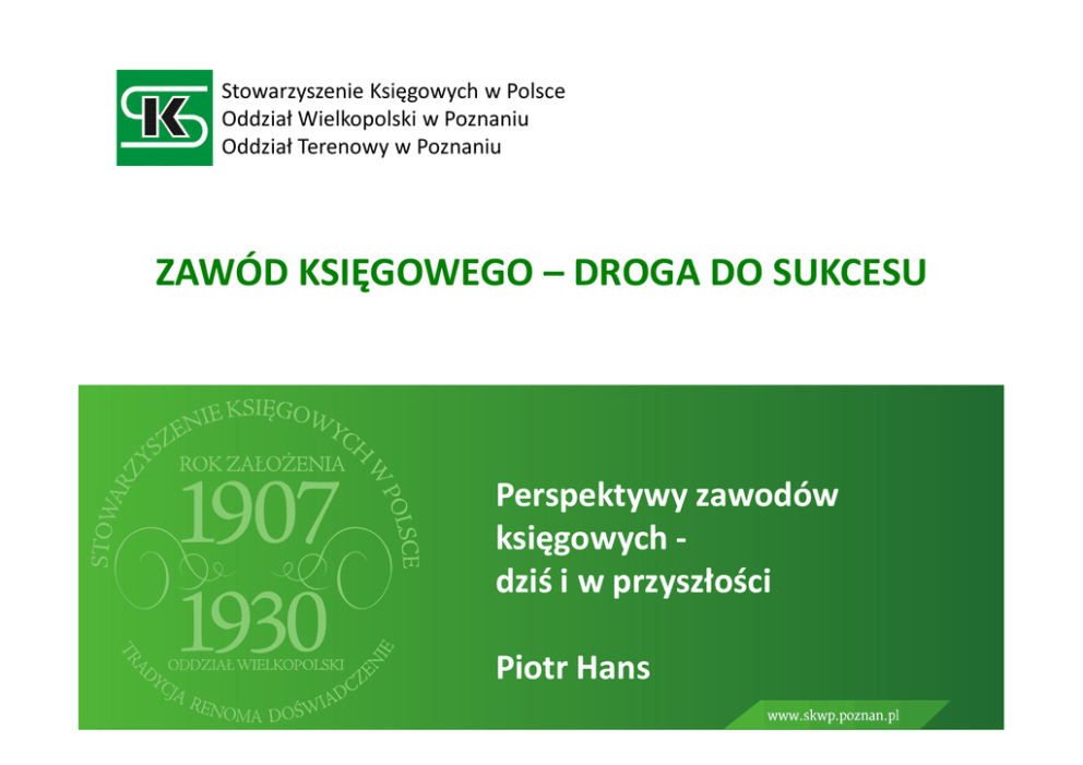Stowarzyszenie Księgowych w Polsce Oddział Wielkopolski w Poznaniu Oddział Terenowy w Poznaniu ZAWÓD KSIĘGOWEGO – DROGA DO SUKCESU Perspektywy zawodów księgowych dziś i w przyszłości Piotr Hans Temat: Księgowy. Zawód z przyszłością? Odrobina goryczki. Jeszcze przez jakiś czas Księgowi będą potrzebni, ale moim zdaniem zawód ten wcześniej czy później zginie, podobnie jak inne wyparte przez komputery zawody. Coraz większe znaczenie odgrywają dokumenty elektroniczne, kody paskowe i tym podobne wynalazki jak do tego dodamy potężne zintegrowane systemy informatyczne to się okaże, że w potężnej międzynarodowej korporacji będzie zatrudnionych kilka osób, które mają jakieś pojęcie o rachunkowości i księgowości. Moi drodzy jesteście jak dinozaury skazani na wymarcie. Jedyna wasza szansa, to być jak najlepszymi specami to może z Waszym udziałem powstaną niektóre z takich zintegrowanych systemów. Chcecie dowodów? W mojej firmie jeszcze parę lat temu w każdym oddziale były duże zespoły, ktore zajmowały się tym tematem. Obecnie tylko w największych placówkach jest może jedna, dwie osoby, której jednym z wielu zadań jest kontrola ksiąg. Ito by było na tyle. Co Wy na To? GoldenLine.pl 2 • Praktyka • Wiedza • Etyka 3 • Praktyka • Wiedza • Etyka Nacisk na jakość Technologie Mobilność Zarządzanie talentami i sukcesja • Wykorzystanie mediów społecznościowych • • • • 2014 Wolters Kluwer, CCH Preparedness Survey 4 • Praktyka • Wiedza • Etyka Nacisk na jakość Technologie Mobilność Zarządzanie talentami i sukcesja • Wykorzystanie mediów społecznościowych • • • • • • • • Adaptacja Doradztwo Specjalizacja Komunikacja 2014 Wolters Kluwer, CCH Preparedness Survey 5 Perspektywy zawodów księgowych dziś i w przyszłości Piotr Hans Członek Zarządu Głównego SKwP 6