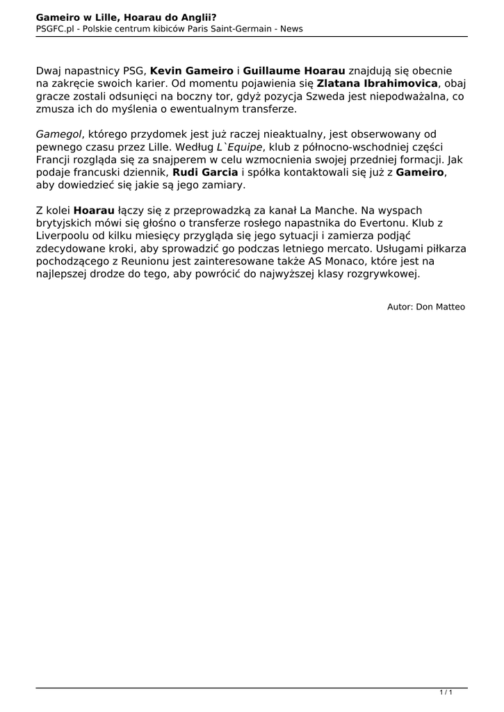 Gameiro w Lille, Hoarau do Anglii? PSGFC.pl - Polskie centrum kibiców Paris Saint-Germain - News Dwaj napastnicy PSG, Kevin Gameiro i Guillaume Hoarau znajdują się obecnie na zakręcie swoich karier. Od momentu pojawienia się Zlatana Ibrahimovica, obaj gracze zostali odsunięci na boczny tor, gdyż pozycja Szweda jest niepodważalna, co zmusza ich do myślenia o ewentualnym transferze. Gamegol, którego przydomek jest już raczej nieaktualny, jest obserwowany od pewnego czasu przez Lille. Według L`Equipe, klub z północno-wschodniej części Francji rozgląda się za snajperem w celu wzmocnienia swojej przedniej formacji. Jak podaje francuski dziennik, Rudi Garcia i spółka kontaktowali się już z Gameiro, aby dowiedzieć się jakie są jego zamiary. Z kolei Hoarau łączy się z przeprowadzką za kanał La Manche. Na wyspach brytyjskich mówi się głośno o transferze rosłego napastnika do Evertonu. Klub z Liverpoolu od kilku miesięcy przygląda się jego sytuacji i zamierza podjąć zdecydowane kroki, aby sprowadzić go podczas letniego mercato. Usługami piłkarza pochodzącego z Reunionu jest zainteresowane także AS Monaco, które jest na najlepszej drodze do tego, aby powrócić do najwyższej klasy rozgrywkowej. Autor: Don Matteo 1/1 Powered by TCPDF (www.tcpdf.org)