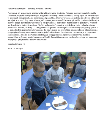 "Zdrowe nietrudne" – chcemy być silni i zdrowi! Pierwszaki z I b zaczynają poznawać tajniki zdrowego żywienia. Podczas pierwszych zajęć z cyklu "Drużyna przygód" zdobyli nowych przyjaciół : Celinkę i wafelka Stefcia, którzy będą im towarzyszyć w kolejnych przygodach. Ale zacznijmy od początku...Wszyscy wiedzą ,że należy się zdrowo odżywiać ale – jak to zrobić? Czy to co lubimy jeść zawsze jest zdrowe? Poznając piramidę żywienia już każdy z nas wie czego powinniśmy jeść dużo a czego unikać. I oczywiście ruch! Ruch to podstawa. Wszyscy bardzo chętnie ćwiczyli w rytmie Stefcia wyliczanki: "...siedem podskoków, cztery obroty, skaczą pierwszaki zwinne jak koty...". Każy pierwszak potrafi ruchem pokazać ulubioną dyscyplinę sportu i ... samodzielnie przygotować owsiankę! To nowe danie nie wszystkim smakowało ale zdobyło grono sympatyków którzy postanowili częściej jadać takie danie. Tym bardziej, że można je przygotować samodzielnie. Dzielne pierwszaki zdobyły już swoją pierwszą sprawność zdrowy na medal i samodzilnie wykonały swoje kolorowe zakładki. Początki zawsze są trudne ale czekają na nas nowe przygody z programem "zdrowe nietrudne"! Uczniowie klasy I b Foto: E. Brożyna Więcej zdjęć >>