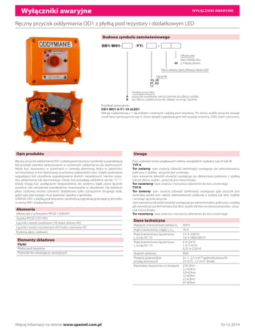 Wyłączniki awaryjne WYŁĄCZNIKI AWARYJNE Ręczny przycisk oddymiania OD1 z płytką pod rezystory i dodatkowym LED Budowa symbolu zamówieniowego OD1-W01- -Y1\ Młoteczek bez młoteczka -M z młoteczkiem Patrz tabela „Specyfikacja diod LED” Łączniki 10, 20 01, 02 11 A B Rodzaj przycisku przycisk zwalniany samoczynnie po zbiciu szybki po zbiciu szybki przycisk należy wcisnąć ręcznie Przykład oznaczenia: OD1-W01-A-Y1-10-2LED1 Wersja nadtynkowa z 1 łącznikiem zwiernym i płytką pod rezystory. Po zbiciu szybki przycisk zostaje zwolniony samoczynnie typ A. Dwie lampki sygnalizacyjne led na prąd zmienny 230V, kolor czerwony. Opis produktu Ręczny przycisk oddymiania OD1 z płytką pod rezystory i podwójną sygnalizacją led posiada szerokie zastosowanie w systemach oddymiania lub alarmowych. Może być stosowany w systemach z centralą alarmową, która w zależności od rezystancji w linii dozorowej uruchamia odpowiedni stan. Dzięki podwójnej sygnalizacji led umożliwia sygnalizowanie dwóch niezależnych stanów systemu oddymiania lub alarmowego. Diody led posiadają oddzielne zaciski "+" "-". Diody mogą być podłączone bezpośrednio do systemu bądź przez łączniki (zwierne lub rozwierne) standardowo montowane w obudowie. Na etykiecie płyty czołowej można zamówić dodatkowo tylko oznaczenie drugiego leda, gdyż opis pierwszego musi pozostać zgodny z aprobatą. UWAGA: OD1 z płytką pod rezystory i podwójną sygnalizacją dostępny jest tylko w wersji W01 (nadtynkowej). Akcesoria Młoteczek z uchwytem PPOŻ-1200\P01 Szybka PPOŻ-5701\P01 Łącznik z torem zwiernym (10) kolor zielony NO Łącznik z torem rozwiernym (01) kolor czerwony NC Etykieta płyty czołowej Elementy składowe Płytki Płytka pod rezystory Przewód do ostrzegaczy awaryjnych Więcej informacji na stronie www.spamel.com.pl Uwaga Przy wyborze torów prądowych należy uwzględnić wybrany typ (A lub B) TYP A Tor zwierny: stan zwarcia (obwód zamknięty) występuje po zamontowaniu pokrywy z szybką - przycisk jest wciśnięty stan rozwarcia (obwód otwarty) występuje po demontażu pokrywy z szybką lub po zbiciu szybki - przycisk jest niewciśnięty Tor rozwierny: stan zwarcia i rozwarcia odwrotnie do toru zwiernego TYP B Tor zwierny: stan zwarcia (obwód zamknięty) występuje gdy przycisk jest wciśnięty przed tym należy zdemontować poktywę z szybką lub zbić szybkę i wcisnąć ręcznie przycisk stan rozwarcia (obwód otwarty) występuje po zamontowaniu pokrywy z szybką jak również po jej demontażu lub zbici szybki ale bez wciskania przycisku - przycisk niewciśnięty Tor rozwierny: stan zwarcia i rozwarcia odwrotnie do toru zwiernego Dane techniczne Napięcie znamionowe izolacji Ui Prąd znamionowy ciągły Iu=Ith Prąd znamionowy łączeniowy Ie w kat.AC-15 Prąd znamionowy łączeniowy Ie w kat.DC-13 Stopień ochrony Przekrój przewodów przyłączeniowych Parametry rezystorów w zestawie 500 V 10 A 2,5 A (230 V) 1,6 A (400/500 V) 4 A (24 V) 1 A (110 V) 0,25 A (220 V) IP65 2× 1...2,5 mm² (jednodrutowych) 2× 0,75...1,5 mm² (linek) 270 Ohm 2,2 kOhm 3,9 kOhm 15 kOhm 22 kOhm 47 kOhm 10-12-2014 Wyłączniki awaryjne WYŁĄCZNIKI AWARYJNE Wymiary wersja nadtynkowa Więcej informacji na stronie www.spamel.com.pl 10-12-2014