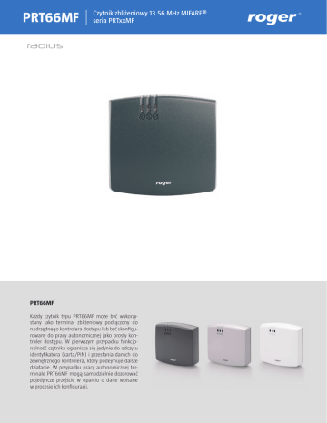 PRT66MF Czytnik zbliżeniowy 13.56 MHz MIFARE® seria PRTxxMF PRT66MF Każdy czytnik typu PRT66MF może być wykorzystany jako terminal zbliżeniowy podłączony do nadrzędnego kontrolera dostępu lub być skonfigurowany do pracy autonomicznej jako prosty kontroler dostępu. W pierwszym przypadku funkcjonalność czytnika ogranicza się jedynie do odczytu identyfikatora (karta/PIN) i przesłania danych do zewnętrznego kontrolera, który podejmuje dalsze działanie. W przypadku pracy autonomicznej terminale PRT66MF mogą samodzielnie dozorować pojedyncze przejście w oparciu o dane wpisane w procesie ich konfiguracji. Karta katalogowa Kontrolery serii PRT66MF PRxx1 Charakterystyka: • • • • • • • • • Karty 13.56 MHz standardu ISO/IEC 14443A i MIFARE® Odczyt: CSN, MSN lub SSN Konfigurowalny format transmisji danych wyjściowych Formaty: Wiegand 26..66 bit, Magstripe (Clock & Data), RS232, RACS (Roger) i inne Różne warianty transmisji kodów PIN oraz kodów klawiatury Osobne wejścia do kontroli wskaźnika LED oraz głośnika Praca w warunkach zewnętrznych Możliwość pracy jako programator kart MIFARE® (wymagany program RARC) Możliwość pracy autonomicznej jako samodzielny kontroler dostępu • • • • • • • • 120 zaindeksowanych użytkowników Identyfikacja: Kart i/lub PIN Historia 1024 zdarzeń Wyjście przekaźnikowe 1.5A/30V Dwa wejścia NO/NC Dwa wyjścia tranzystorowe Możliwość dołączenie ekspandera we/wy typu XM-2 Możliwość dołączenie dodatkowego czytnika serii PRT (obustronna kontrola przejścia) • Programowanie manualne lub z komputera • Ochrona antysabotażowa (tamper) • Znak CE LED STATUS LED OTWARTE LED SYSTEM Dostępne wersje i oznaczenia Dane techniczne Indeks Opis Parametr Wartość PRT66MF-G Obudowa ciemnoszara Napięcie zasilania 10-15 VDC PRT66MF-S Obudowa srebrny metalik Pobór prądu 65mA PRT66MF-W Obudowa biała Kontakt anty-sabotażowy Kontakt NC, 50mA/24V, IP67 Zasięg odczytu kart kluczy Do 6 cm Klasa środowiskowa Klasa IV, warunki zewnętrzne ogólne, temperatura otoczenia: -25°C- +60°C, wilgotność względna: 10-95% (bez kondensacji) Wymiary 85 X 85 X 27 mm Waga ≈120g Certyfikat CE ROGER sp.j Gościszewo 59 82-400 Sztum Polska T. +48 55 272 0132 F. +48 55 272 0133 E. [email protected] I. www.roger.pl Karta katalogowa PRT66MF, wersja 1.0PL Rev.A © 2010 ROGER sp. j. Roger sp.j. zastrzega sobie prawo do zmiany zawartości, specyfikacji czy dostępności prezentowanych produktów bez uprzedzenia. Widoki oraz sposób instalacji czytnika PRT66MF