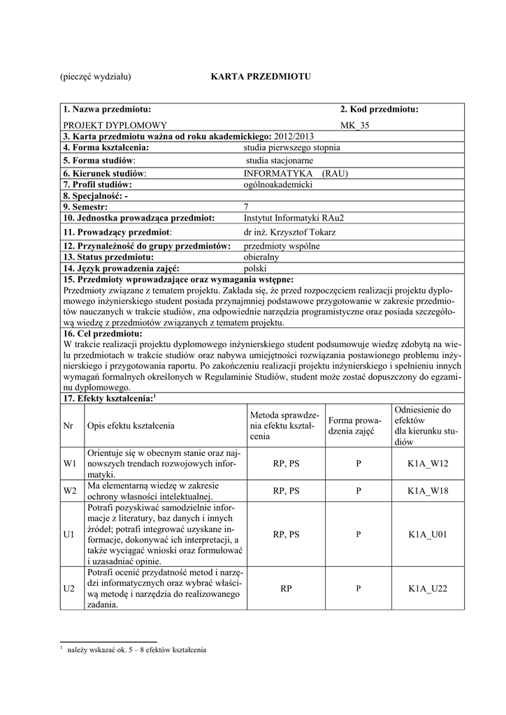 (pieczęć wydziału) 1. Nazwa przedmiotu: KARTA PRZEDMIOTU 2. Kod przedmiotu: PROJEKT DYPLOMOWY MK_35 3. Karta przedmiotu ważna od roku akademickiego: 2012/2013 4. Forma kształcenia: studia pierwszego stopnia 5. Forma studiów: studia stacjonarne 6. Kierunek studiów: INFORMATYKA (RAU) 7. Profil studiów: ogólnoakademicki 8. Specjalność: 9. Semestr: 7 10. Jednostka prowadząca przedmiot: Instytut Informatyki RAu2 11. Prowadzący przedmiot: dr inż. Krzysztof Tokarz 12. Przynależność do grupy przedmiotów: przedmioty wspólne 13. Status przedmiotu: obieralny 14. Język prowadzenia zajęć: polski 15. Przedmioty wprowadzające oraz wymagania wstępne: Przedmioty związane z tematem projektu. Zakłada się, że przed rozpoczęciem realizacji projektu dyplomowego inżynierskiego student posiada przynajmniej podstawowe przygotowanie w zakresie przedmiotów nauczanych w trakcie studiów, zna odpowiednie narzędzia programistyczne oraz posiada szczegółową wiedzę z przedmiotów związanych z tematem projektu. 16. Cel przedmiotu: W trakcie realizacji projektu dyplomowego inżynierskiego student podsumowuje wiedzę zdobytą na wielu przedmiotach w trakcie studiów oraz nabywa umiejętności rozwiązania postawionego problemu inżynierskiego i przygotowania raportu. Po zakończeniu realizacji projektu inżynierskiego i spełnieniu innych wymagań formalnych określonych w Regulaminie Studiów, student może zostać dopuszczony do egzaminu dyplomowego. 17. Efekty kształcenia:1 Odniesienie do Metoda sprawdzeForma prowa- efektów Nr Opis efektu kształcenia nia efektu kształdzenia zajęć dla kierunku stucenia diów Orientuje się w obecnym stanie oraz najW1 nowszych trendach rozwojowych inforRP, PS P K1A_W12 matyki. Ma elementarną wiedzę w zakresie W2 RP, PS P K1A_W18 ochrony własności intelektualnej. Potrafi pozyskiwać samodzielnie informacje z literatury, baz danych i innych źródeł; potrafi integrować uzyskane inP RP, PS U1 K1A_U01 formacje, dokonywać ich interpretacji, a także wyciągać wnioski oraz formułować i uzasadniać opinie. Potrafi ocenić przydatność metod i narzędzi informatycznych oraz wybrać właściP U2 K1A_U22 RP wą metodę i narzędzia do realizowanego zadania. 1 należy wskazać ok. 5 – 8 efektów kształcenia Potrafi opracować dokumentację dotyczącą realizacji zadania inżynierskiego i U3 przygotować raport zawierający omówiePS nie sposobu realizacji tego zadania oraz uzyskanych wyników. Potrafi przygotować i przedstawić krótką U4 prezentację poświęconą wynikom realiOP zacji zadania inżynierskiego. Potrafi dokonać wstępnej analizy ekonoU5 micznej podejmowanych działań przy reRP, PS, OP alizacji projektu Potrafi odpowiednio określić priorytety K1 RP służące do realizacji określonego zadania Potrafi działać aktywnie, wykazuje inicjatywę i pomysłowość, umie podjąć ryK2 RP, OP zyko i radzić sobie w trudnych sytuacjach. Rozumie konieczność ciągłego kształceK3 nia, pogłębiania wiedzy i nabywania noRP wych umiejętności Ma świadomość społecznej roli inżynieK4 ra, potrafi przekazywać informacje techRP, PS, OP niczne w sposób przystępny. 18. Formy zajęć dydaktycznych i ich wymiar (liczba godzin) W. - Ćw. - L. 19. Treści kształcenia: P. 30 P K1A_U19 K1A_U23 K1A_U24 K1A_U25 P K1A_U04 P K1A_U17 P K1A_K04 P K1A_K06 P K1A_K01 P K1A_K07 Sem. - Zajęcia obejmują: 1. Analizę postawionego zadania inżynierskiego. 2. Określenie harmonogramu realizacji projektu. 3. Studia literaturowe. 4. Dobór narzędzi programistycznych i/lub sprzętu. 5. Implementację oprogramowania i/lub sprzętu. 6. Bieżącą weryfikację przyjętego sposobu rozwiązania problemu. 7. Opracowanie wyników. 8. Prezentację wyników. 9. Przygotowanie raportu z realizacji projektu. Projekt dyplomowy inżynierski ma charakter aplikacyjny. Może być realizowany samodzielnie lub w kilkuosobowych grupach. Na zakończenie zajęć student musi przedstawić raport oraz zaprezentować wyniki w formie prezentacji multimedialnej. Raport z projektu inżynierskiego o objętości ok. 20-30 stron powinien zawierać następujące elementy: 1. Sformułowanie zadania. 2. Analizę istniejących rozwiązań z danej dziedziny. 3. Propozycję rozwiązania zadania. 4. Opis implementacji. 5. Analizę wyników i wnioski końcowe. W przypadku projektu zespołowego we wstępie raportu powinien zostać określony zakres prac wykonywanych przez poszczególnych autorów. W takim przypadku objętość raportu powinna być odpowiednio zwiększona. 20. Egzamin: tak 21. Literatura podstawowa: Pozycje literaturowe związane z realizowanym projektem 22. Literatura uzupełniająca: Pozycje literaturowe związane z realizowanym projektem. 23. Nakład pracy studenta potrzebny do osiągnięcia efektów kształcenia Lp. Forma zajęć 1 2 3 4 5 6 Liczba godzin kontaktowych / pracy studenta -/-/-/30 / 265 -/20 / 10 50 / 275 Wykład Ćwiczenia Laboratorium Projekt Seminarium Inne (egzamin, konsultacje) Suma godzin 24. Suma wszystkich godzin: 325 25. Liczba punktów ECTS:2 13 26. Liczba punktów ECTS uzyskanych na zajęciach z bezpośrednim udziałem nauczyciela akademickiego: 2 27. Liczba punktów ECTS uzyskanych na zajęciach o charakterze praktycznym (laboratoria, projekty): 13 26. Uwagi: - Zatwierdzono: ……………………………. (data i podpis prowadzącego) 2 1 punkt ECTS – 25-30 godzin. ………………………………………………… (data i podpis dyrektora instytutu/kierownika katedry/ Dyrektora Kolegium Języków Obcych/kierownika lub dyrektora jednostki międzywydziałowej)