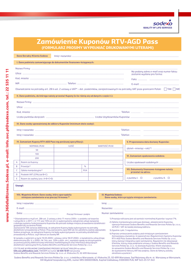 Zamówienie Kuponów RTV-AGD Pass (FORMULARZ PROSIMY WYPEŁNIAĆ DRUKOWANYMI LITERAMI) Dane Doradcy Klienta Sodexo Imię i nazwisko: ............................................................................................................................................................................................... www.360dlaBiznesu.Sodexo.pl, e-mail: [email protected], tel.: 22 535 11 11 I. Dane podmiotu zamawiającego do dokumentów finansowo-księgowych: Nazwa Firmy: ....................................................................................................................................................................................................................................................................................... Na podany adres e-mail oraz numer faksu zostanie wysłana pro forma: Ulica: .................................................................................................................................................................................................. Kod, miasto: .................................................................................................................................................................................... Faks: .................. NIP: ........................................................................................ Telefon: .................. .................................................................. E-mail: ........................................................................... . ....................................................... Oświadczenie na potrzeby art. 28 b ust. 2 ustawy o VAT* – dot. podatników, zarejestrowanych na potrzeby VAT poza granicami Polski TAK NIE II. Dane podmiotu, do którego należy przesłać Kupony (o ile różnią się od danych z części I.): Nazwa Firmy: ....................................................................................................................................................................................................................................................................................... Ulica: ........................................................................................................................................................................................................................................................................................................ Kod, miasto: ........................................................................................................................................................................... Telefon: ................... .................................................................... Liczba punktów doręczeń: ............................................................................................. Liczba Użytkowników Kuponów: ...................................................................................... III. Dane osoby upoważnionej do odbioru Kuponów (minimum dwie osoby): Imię i nazwisko: ................................................................................................................................................................... Telefon: . .................. .................................................................... Imię i nazwisko: ................................................................................................................................................................... Telefon: . .................. .................................................................... IV. Zamawiam Kupony RTV-AGD Pass wg poniższej specyfikacji: Nominał (PLN) V. P roponowana data dostawy Kuponów: Ilość Wartość (PLN) 50 100 VI. Z amawiam opakowania ozdobne: 200 A Razem za Kupony: B Prowizja (1) C Opłata manipulacyjna (2) D Podatek VAT (23%) (od B+C) E Razem do zapłaty (poz. A+B+C+D) (dzień – miesiąc – rok) (3): ............................................... Liczba opakowań ozdobnych: ................................ % VII. Dokumenty finansowo-księgowe należy przesłać na adres: PLN z punktu I. □ z punktu II. □ Uwagi: VIII. W ypełnia Klient: Dane osoby, która sporządziła niniejsze zamówienie oraz pieczęć firmowa: (4) IX. Wypełnia Sodexo: Dane osoby, która przyjęła niniejsze zamówienie: Imię i nazwisko: ................................................................................................................. Imię: . ...................................................................................................................................... E-mail: ................................................................ Nazwisko: ............................................................................................................................. Data: . .................................................................. Pieczęć firmowa i podpis Numer zamówienia: ........................................................................................................ * Oświadczenie w myśl art. 28b ust. 2 ustawy z dnia 11 marca 2004 r. o podatku od towarów i usług (Dz.U. z 2011 r. nr 117, poz 1054 ze zm.) o wykorzystaniu zakupionej usługi związanej z obsługą systemu funkcjonowania Kuponów dla potrzeb stałego miejsca prowadzenia działalności gospodarczej na terenie Polski. Zaznaczenie TAK oznacza deklarację, że zakupione Kupony będą wykorzystane na potrzeby działalności prowadzonej w Polsce. Przy zaznaczeniu opcji NIE lub nie udzieleniu żadnej odpowiedzi, Sodexo przyjmuje, że zakupione Kupony nie będą wykorzystywane na potrzeby działalności prowadzonej w Polsce, czyli faktura ze stawką NP. W związku z wejściem w życie 10.03.2003 r. ustawy z dnia 18.07.2002 r. o świadczeniu usług drogą elektroniczną (Dz. U. z 2002 r. Nr 144, poz. 1204 z późn. zm.), wyrażam zgodę na otrzymywanie za pomocą poczty elektronicznej informacji marketingowych oraz informacji dotyczących działal