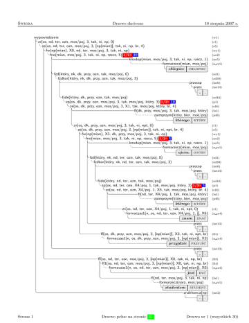 Świgra Drzewo skrócone 10 sierpnia 2007 r. wypowiedzenie zr(os, nd, ter, ozn, mos/poj, 3, tak, ni, np, 0) ze(os, nd, ter, ozn, mos/poj, 3, [np(mian)], tak, ni, np, br, 4) fw(np(mian), X0, nd, ter, mos/poj, 3, tak, ni, np) fno(mian, mos/poj, 3, tak, ni, np, rzecz, 5) 1/2 ⊲ 30 knodop(mian, mos/poj, 3, tak, ni, np, rzecz, 1) formarzecz(mian, mos/poj) chłopiec chłopiec fzd(który, nk, dk, przy, ozn, tak, mos/poj, 0) fzdkor(który, nk, dk, przy, ozn, tak, mos/poj, 3) przecsp przec , , fzde(który, dk, przy, ozn, tak, mos/poj) zp(os, dk, przy, ozn, mos/poj, 3, tak, mos/poj, który, 3) 1/2 ⊲ 10 ze(os, dk, przy, ozn, mos/poj, 3, X1, tak, mos/poj, który, br, 4) fl(dk, przy, mos/poj, 3, tak, mos/poj, który) zaimprzym(który, bier, mos/poj) którego który zr(os, dk, przy, ozn, mos/poj, 3, tak, ni, npt, 0) ze(os, dk, przy, ozn, mos/poj, 3, [np(mian)], tak, ni, npt, br, 4) fw(np(mian), X3, dk, przy, mos/poj, 3, tak, ni, np) fno(mian, mos/poj, 3, tak, ni, np, rzecz, 5) 1/2 ⊲ 5 knodop(mian, mos/poj, 3, tak, ni, np, rzecz, 1) formarzecz(mian, mos/poj) ojciec ojciec fzd(który, nk, nd, ter, ozn, tak, mos/poj, 0) fzdkor(który, nk, nd, ter, ozn, tak, mos/poj, 3) przecsp przec , , fzde(który, nd, ter, ozn, tak, mos/poj) zp(os, nd, ter, ozn, X4/poj, 1, tak, mos/poj, który, 3) 1/3 ⊲ 3 ze(os, nd, ter, ozn, X4/poj, 1, X5, tak, mos/poj, który, br, 4) fl(nd, ter, X4/poj, 1, tak, mos/poj, który) zaimprzym(który, bier, mos/poj) którego który zr(os, nd, ter, ozn, X4/poj, 1, tak, ni, npt, 0) formaczas1(n, os, nd, ter, ozn, X4/poj, 1, [], X6) znam znać przec , , ff(os, dk, przy, ozn, mos/poj, 3, [np(mian)], X3, tak, ni, npt, br) formaczas1(n, os, dk, przy, ozn, mos/poj, 3, [np(mian)], X3) przyjdzie przyjść przec , , ff(os, nd, ter, ozn, mos/poj, 3, [np(mian)], X0, tak, ni, np, br) ff1(os, nd, ter, ozn, mos/poj, 3, [np(mian)], X0, tak, ni, np, br) formaczas1(n, os, nd, ter, ozn, mos/poj, 3, [np(mian)], X0) jest być fl(nd, ter, mos/poj, 3, tak, ni, np) formarzecz(narz, mos/poj) studentem student znakkonca(np) . . Strona 1 Drzewo pełne na stronie 31 (w1) (r1) (e5) (wy1) (no2) (no5) (n rz1) (zd1) (zd39) (int6) (int13) (zd44) (p1) (e16) (lu1) (jel6) (r1) (e5) (wy1) (no2) (no5) (n rz1) (zd1) (zd39) (int6) (int13) (zd44) (p1) (e16) (lu1) (jel6) (r1) (n cz4) (int13) (fi1) (n cz4) (int13) (fi3) (fi4) (n cz4) (lu1) (n rz1) (int2) Drzewo nr 1 (wszystkich 30) Świgra Drzewo skrócone 10 sierpnia 2007 r. wypowiedzenie zr(os, nd, ter, ozn, mos/poj, 3, tak, ni, np, 0) ze(os, nd, ter, ozn, mos/poj, 3, [np(mian)], tak, ni, np, br, 4) fw(np(mian), X0, nd, ter, mos/poj, 3, tak, ni, np) fno(mian, mos/poj, 3, tak, ni, np, rzecz, 5) 1/2 ⊲ 30 knodop(mian, mos/poj, 3, tak, ni, np, rzecz, 1) formarzecz(mian, mos/poj) chłopiec chłopiec fzd(który, nk, dk, przy, ozn, tak, mos/poj, 0) fzdkor(który, nk, dk, przy, ozn, tak, mos/poj, 3) przecsp przec , , fzde(który, dk, przy, ozn, tak, mos/poj) zp(os, dk, przy, ozn, mos/poj, 3, tak, mos/poj, który, 3) 1/2 ⊲ 10 ze(os, dk, przy, ozn, mos/poj, 3, X1, tak, mos/poj, który, br, 4) fl(dk, przy, mos/poj, 3, tak, mos/poj, który) zaimprzym(który, bier, mos/poj) którego który zr(os, dk, przy, ozn, mos/poj, 3, tak, ni, npt, 0) ze(os, dk, przy, ozn, mos/poj, 3, [np(mian)], tak, ni, npt, br, 4) fw(np(mian), X3, dk, przy, mos/poj, 3, tak, ni, np) fno(mian, mos/poj, 3, tak, ni, np, rzecz, 5) 1/2 ⊲ 5 knodop(mian, mos/poj, 3, tak, ni, np, rzecz, 1) formarzecz(mian, mos/poj) ojciec ojciec fzd(który, nk, nd, ter, ozn, tak, mos/poj, 0) fzdkor(który, nk, nd, ter, ozn, tak, mos/poj, 3) przecsp przec , , fzde(który, nd, ter, ozn, tak, mos/poj) zp(os, nd, ter, ozn, X4/poj, 1, tak, mos/poj, który, 3) ⊳ 2/3 ⊲ 3 ze(os, nd, ter, ozn, X4/poj, 1, [], tak, mos/poj, który, br, 4) fl(nd, ter, X4/poj, 1, tak, mos/poj, który) zaimprzym(który, bier, mos/poj) którego który ff(os, nd, ter, ozn, X4/poj, 1, [], X5, tak, ni, który, br) formaczas1(n, os, nd, ter, ozn, X4/poj, 1, [], X5) znam znać przec , , ff(os, dk, przy, ozn, mos/poj, 3, [np(mian)], X3, tak, ni, npt, br) formaczas1(n, os, dk, przy, ozn, mos/poj, 3, [np(mian)], X3) przyjdzie przyjść przec , , ff(os, nd, ter, ozn, mos/poj, 3, [np(mian)], X0, tak, ni, np, br) ff1(os, nd, ter, ozn, mos/poj, 3, [np(mian)], X0, tak, ni, np, br) formaczas1(n, os, nd, ter, ozn, mos/poj, 3, [np(mian)], X0) jest być fl(nd, ter, mos/poj, 3, tak, ni, np) formarzecz(narz, mos/poj) studentem student znakkonca(np) . . Strona 2 Drzewo pełne na stronie 32 (w1) (r1) (e5) (wy1) (no2) (no5) (n rz1) (zd1) (zd39) (int6) (int13) (zd44) (p1) (e16) (lu1) (jel6) (r1) (e5) (wy1) (no2) (no5) (n rz1) (zd1) (zd39) (int6) (int13) (zd44) (p1) (e11) (lu1) (jel6) (fi1) (n cz4) (int13) (fi1) (n cz4) (int13) (fi3) (fi4) (n cz4) (lu1) (n rz1) (int2) Drzewo nr 2 (wszystkich 30) Świgra Drzewo skrócone 10 sierpnia 2007 r. wypowiedzenie zr(os, nd, ter, ozn, mos/poj, 3, tak, ni, np, 0) ze(os, nd, ter, ozn, mos/poj, 3, [np(mian)], tak, ni, np, br, 4) fw(np(mian), X0, nd, ter, mos/poj, 3, tak, ni, np) fno(mian, mos/poj, 3, tak, ni, np, rzecz, 5) 1/2 ⊲ 30 knodop(mian, mos/poj, 3, tak, ni, np, rzecz, 1) formarzecz(mian, mos/poj) chłopiec chłopiec fzd(który, nk, dk, przy, ozn, tak, mos/poj, 0) fzdkor(który, nk, dk, przy, ozn, tak, mos/poj, 3) przecsp przec , , fzde(który, dk, przy, ozn, tak, mos/poj) zp(os, dk, przy, ozn, mos/poj, 3, tak, mos/poj, który, 3) 1/2 ⊲ 10 ze(os, dk, przy, ozn, mos/poj, 3, X1, tak, mos/poj, który, br, 4) fl(dk, przy, mos/poj, 3, tak, mos/poj, który) zaimprzym(który, bier, mos/poj) którego który zr(os, dk, przy, ozn, mos/poj, 3, tak, ni, npt, 0) ze(os, dk, przy, ozn, mos/poj, 3, [np(mian)], tak, ni, npt, br, 4) fw(np(mian), X3, dk, przy, mos/poj, 3, tak, ni, np) fno(mian, mos/poj, 3, tak, ni, np, rzecz, 5) 1/2 ⊲ 5 knodop(mian, mos/poj, 3, tak, ni, np, rzecz, 1) formarzecz(mian, mos/poj) ojciec ojciec fzd(który, nk, nd, ter, ozn, tak, mos/poj, 0) fzdkor(który, nk, nd, ter, ozn, tak, mos/poj, 3) przecsp przec , , fzde(który, nd