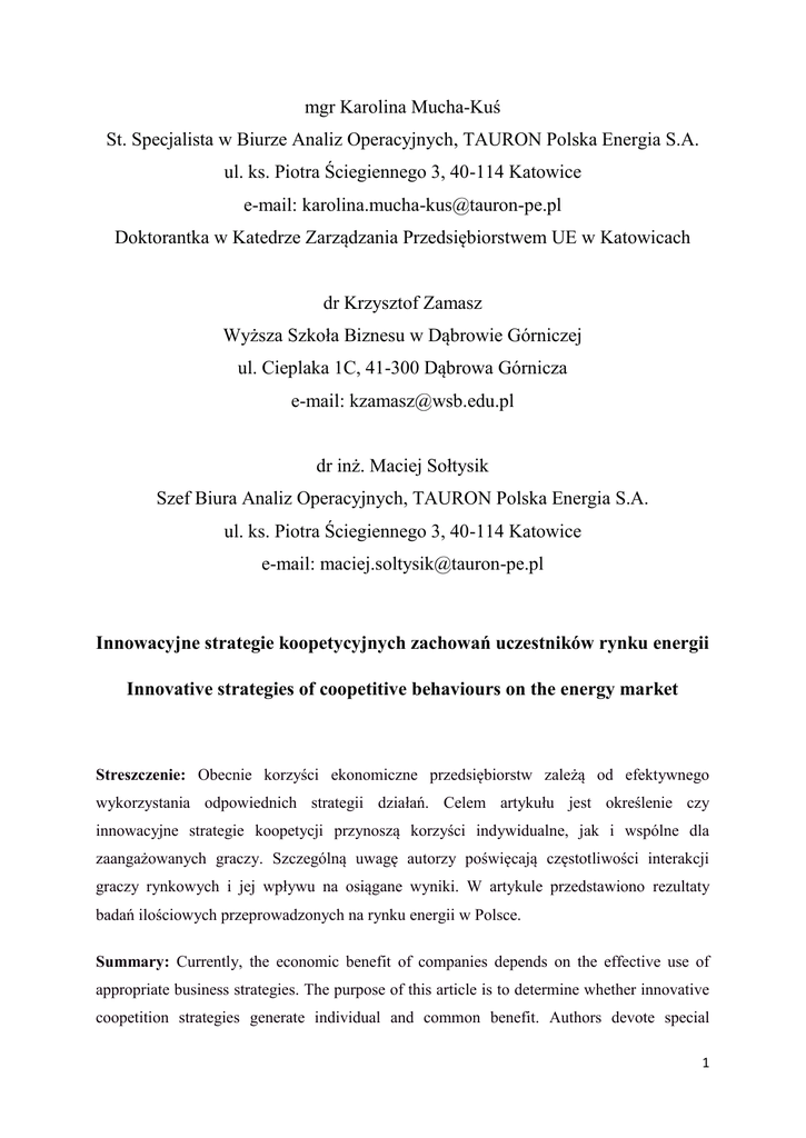 mgr Karolina Mucha-Kuś St. Specjalista w Biurze Analiz Operacyjnych, TAURON Polska Energia S.A. ul. ks. Piotra Ściegiennego 3, 40-114 Katowice e-mail: [email protected] Doktorantka w Katedrze Zarządzania Przedsiębiorstwem UE w Katowicach dr Krzysztof Zamasz Wyższa Szkoła Biznesu w Dąbrowie Górniczej ul. Cieplaka 1C, 41-300 Dąbrowa Górnicza e-mail: [email protected] dr inż. Maciej Sołtysik Szef Biura Analiz Operacyjnych, TAURON Polska Energia S.A. ul. ks. Piotra Ściegiennego 3, 40-114 Katowice e-mail: [email protected] Innowacyjne strategie koopetycyjnych zachowań uczestników rynku energii Innovative strategies of coopetitive behaviours on the energy market Streszczenie: Obecnie korzyści ekonomiczne przedsiębiorstw zależą od efektywnego wykorzystania odpowiednich strategii działań. Celem artykułu jest określenie czy innowacyjne strategie koopetycji przynoszą korzyści indywidualne, jak i wspólne dla zaangażowanych graczy. Szczególną uwagę autorzy poświęcają częstotliwości interakcji graczy rynkowych i jej wpływu na osiągane wyniki. W artykule przedstawiono rezultaty badań ilościowych przeprowadzonych na rynku energii w Polsce. Summary: Currently, the economic benefit of companies depends on the effective use of appropriate business strategies. The purpose of this article is to determine whether innovative coopetition strategies generate individual and common benefit. Authors devote special 1 attention to frequency of interactions among market players and its impact on their business results. The article presents the results of quantitative research conducted on the energy market in Poland. (autor tłumaczenia: Karolina Mucha-Kuś) Słowa kluczowe: innowacje, koopetycja, rynek energii, strategie, zarządzanie Key words: coopetition, energy market, innovation, management, strategies Wprowadzenie Zarządzanie strategiczne charakteryzuje się działaniami o długiej perspektywie podejmowanych decyzji, obserwacją przyszłych zmian otoczenia zarówno wewnętrznego, jak i zewnętrznego oraz dostosowaniem się do nich. Oznacza również wykorzystywanie szans i unikanie zagrożeń pojawiających się w zmiennym otoczeniu [Rokita, 2005, s. 282-304]. Organizacje nie tworzą wartości w odosobnieniu, ale wchodzą w różnego rodzaju relacje w celu osiągnięcia swoich celów strategicznych [Hakanson, Snehota, 2006, 187-200]. W niektórych sektorach gospodarki to współpraca międzyorganizacyjna determinuje formę rynku, a granice nie przebiegają między organizacjami, lecz między grupami kooperujących firm. Takim przykładem może być rynek energii elektrycznej, w którym uczestnicy działają w otoczeniu makroekonomicznym, gdzie przeplatają się czynniki polityczne, prawne, ekonomiczne, demograficzne, społeczne, ekologiczne i technologiczne. W przypadku gdy współpraca występuje pomiędzy konkurentami rynkowymi mamy do czynienia z koopetycją, innowacyjną strategią, która może przynieść korzyści nie tylko indywidualne, ale przede wszystkim wspólne, które są niemożliwe do osiągnięcia w pojedynkę. Pojawia się zatem kluczowe pytanie, czy koopetycja przynosi korzyści dla wszystkich uczestników rynku oraz czy wzrost częstotliwości interakcji koopetytorów ma pozytywny wpływ na osiągane przez nich wyniki? Celem artykułu jest odpowiedź na te pytania, sformułowana na podstawie badań ilościowych przeprowadzonych w wybranym obszarze rynku energii. Koopetycja – ujęcie teoretyczne Dynamiczne otoczenie implikuje ewolucję reguł gry rynkowej, co bezpośrednio przekłada się na kształt relacji pomiędzy graczami. Kluczowym dla uczestników rynku jest pozostanie w tej grze lub zwiększenie przewagi konkurencyjnej [Mucha-Kuś, 2010, s. 9-12]. Odpowiedzią na dynamikę funkcjonowania rynku odzwierciedlającą rzeczywiste zachowania jego graczy jest współpraca konkurentów. Koopetycjai zakłada występowanie konkurencji i współpracy w tym samym czasie i jest strategią zaprojektowaną i wdrażaną w celu 2 osiągnięcia lepszych wyników w długim okresie, dzięki współpracy z firmą konkurencyjną [Czakon, 2010, s. 8-12]. Koopetycja w literaturze zarządzania przedstawiana jest różnie w zależności od przyjętej perspektywy badawczej, jednak wszyscy badacze zjawiska podkreślają dwie charakteryzujące ją cechy: (i) jednoczesność występowania konkurencji i współdziałania, oraz (ii) generowanie wspólnych korzyści. Koopetycja jest strategią łączącą współpracę oraz konkurencję podmiotów również w różnych zakresach ich działalności [Tidström, 2009, s. 506-518; Czakon, 2009, s.11-14.]. W ujęciu klasycznym nauk ekonomicznych, współpraca konkurentów postrzegana była, jako czynnik negatywnie wpływający na rynek, lub wręcz niszczący konkurencję [Vonortas, 2000, s. 234-271],. Dotychczasowe badania skupiają się więc na jednostronnej perspektywie wpływu wspomnianych zachowań na osiąganie celów, nie dostrzegając szerszego kontekstu. Innowacyjność takiego podejścia z punktu widzenia teoretycznego, stanowi atrakcyjne poznawczo pole rozważań, w szczególności w kontekście wspólnych korzyści jakie może przynieść współpraca konkurentów, uwzględniając wpływ częstotliwości ich interakcji na osiągane wyniki. Zestawiając ograniczony dorobek empiryczny dotychczasowych badańii, zidentyfikowane luki badawcze oraz postulowane w literaturze implikacje koopetycji, eksploracja naukowa w tym obszarze wydaje się być szczególnie aktualna i zasadna. Koopetycja na rynku energii - założenia badawcze W celu udzielenia odpowiedzi na postawione we wstępie pytania, przeprowadzone zostały badania empiryczne na przykładzie rynku energii elektrycznej w Polsce. W związku z dołączeniem naszego kraju do Unii Europejskiej, sektor ten, przeszedł ogromne zmiany z uwagi na dostosowanie charakteru jego funkcjonowania do zaleceń unijnych. Przeprowadzone procesy restrukturyzacji, deregulacji oraz prywa