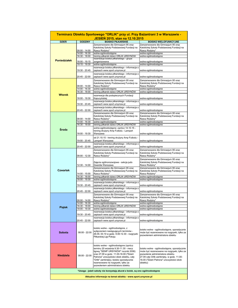 Terminarz Obiektu Sportowego "ORLIK" przy ul. Przy Bażantrani 3 w Warszawie JESIEŃ 2015, stan na 12.10.2015