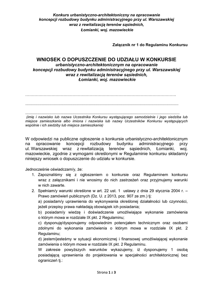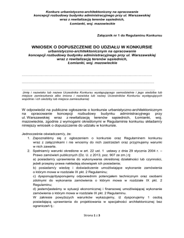 Konkurs urbanistyczno-architektoniczny na opracowanie koncepcji rozbudowy budynku administracyjnego przy ul. Warszawskiej wraz z rewitalizacją terenów sąsiednich, Łomianki, woj. mazowieckie Załącznik nr 1 do Regulaminu Konkursu WNIOSEK O DOPUSZCZENIE DO UDZIAŁU W KONKURSIE urbanistyczno-architektonicznym na opracowanie koncepcji rozbudowy budynku administracyjnego przy ul. Warszawskiej wraz z rewitalizacją terenów sąsiednich, Łomianki, woj. mazowieckie ……………………………………………………………………………………………………. ............................................................................................................................................ ............................................................................................................................................. (imię i nazwisko lub nazwa Uczestnika Konkursu występującego samodzielnie i jego siedziba lub miejsce zamieszkania albo imiona i nazwiska lub nazwy Uczestników Konkursu występujących wspólnie i ich siedziby lub miejsca zamieszkania) W odpowiedzi na publiczne ogłoszenie o konkursie urbanistyczno-architektonicznym na opracowanie koncepcji rozbudowy budynku administracyjnego przy ul. Warszawskiej wraz z rewitalizacją terenów sąsiednich, Łomianki, woj. mazowieckie, zgodnie z wymogami określonymi w Regulaminie konkursu składam/y niniejszy wniosek o dopuszczenie do udziału w konkursie. Jednocześnie oświadczam/y, Ŝe: 1. Zapoznaliśmy się z ogłoszeniem o konkursie oraz Regulaminem konkursu wraz z załącznikami i nie wnosimy do nich zastrzeŜeń oraz przyjmujemy warunki w nich zawarte. 2. Spełniam/y warunki określone w art. 22 ust. 1 ustawy z dnia 29 stycznia 2004 r. – Prawo zamówień publicznych (Dz. U. z 2013, poz. 907 ze zm.) tj: a) posiadam/y uprawnienia do wykonywania określonej działalności lub czynności, jeŜeli przepisy prawa nakładają obowiązek ich posiadania; b) posiadam/y wiedzę i doświadczenie umoŜliwiające wykonanie zamówienia o którym mowa w rozdziale IX pkt. 2 Regulaminu; c) dysponuję/dysponujemy odpowiednim potencjałem technicznym oraz osobami zdolnymi do wykonania zamówienia o którym mowa w rozdziale IX pkt. 2 Regulaminu; d) jestem/jesteśmy w sytuacji ekonomicznej i finansowej umoŜliwiającej wykonanie zamówienia o którym mowa w rozdziale IX pkt. 2 Regulaminu. W zakresie powyŜszych warunków wykazujemy, iŜ dysponujemy 1 osobą posiadającą uprawnienia do projektowania w specjalności architektonicznej bez ograniczeń tj.: Strona 1 z 3 Konkurs urbanistyczno-architektoniczny na opracowanie koncepcji rozbudowy budynku administracyjnego przy ul. Warszawskiej wraz z rewitalizacją terenów sąsiednich, Łomianki, woj. mazowieckie ……………………………………………………………………….. (imię i nazwisko osoby, którą dysponuje Uczestnik konkursu) ……………………………………………………………………….. (posiadane uprawnienia osoby którą dysponuje Uczestnik konkursu/numer uprawnień) ……………………………………………………………………….. (informacja nt. podstawy dysponowania) 3. Uczestnik konkursu samodzielnie biorący udział w konkursie jak i kaŜdy z Uczestników wspólnie biorących udział w konkursie, wymienieni w niniejszym wniosku o dopuszczenie, nie podlega wykluczeniu z konkursu na podstawie art. 24 ust. 1, ust. 2 pkt. 1,3,4,5 i ust. 2a ustawy z dnia 29 stycznia 2004 r. - Prawo zamówień publicznych (tj. Dz. U. z 2013, poz. 907 ze zm.). 4. Udzielam/udzielamy Organizatorowi bezpłatnej licencji niewyłącznej, nieograniczonej terytorialnie i czasowo od momentu zatwierdzenia wyników konkursu przez Kierownika Zamawiającego do opracowania studialnego i pracy konkursowej złoŜonej w konkursie, na polach eksploatacji wymienionych w Rozdziale ….. Regulaminu konkursu. 5. Zdobywając pierwszą nagrodę w konkursie przenoszę/przenosimy na Organizatora konkursu autorskie prawa majątkowe wraz z prawem do zezwalania na wykonywanie zaleŜnych praw autorskich do pracy konkursowej, na warunkach określonych w Regulaminie konkursu w Rozdziale IX. 6. Korzystanie przez Organizatora z utworu, nie naruszy jakichkolwiek praw osób trzecich, w tym majątkowych i osobistych praw autorskich osób trzecich. Wszelką korespondencję naleŜy kierować na adres ……………………………………………………………………………………… Nazwa ………………………………………………………………………………………. Adres ………………………………………………………………………………………. Telefon ………………………………………………………………………………………. Fax ………………………………………………………………………………………. E-mail Strona 2 z 3 Konkurs urbanistyczno-architektoniczny na opracowanie koncepcji rozbudowy budynku administracyjnego przy ul. Warszawskiej wraz z rewitalizacją terenów sąsiednich, Łomianki, woj. mazowieckie Pełnomocnikiem Uczestnika Konkursu/ Uczestników Konkursu jest * ……………………………………………………………………………………… Do wniosku załączam/y wymagane Regulaminem Konkursu oświadczenia i dokumenty potwierdzające spełnianie warunków udziału w Konkursie. Lista oświadczeń i/lub dokumentów: 1. 2. 3. 4. 5. …………………………… …………………………… …………………………… …………………………… …………………………… ………………………… ……………………………………………….1 (miejscowość i data) (czytelny podpis osoby lub osób uprawnionych do reprezentowania Uczestnika konkursu występującego samodzielnie albo czytelny podpis osoby uprawnionej do reprezentowania Uczestników wspólnie bior