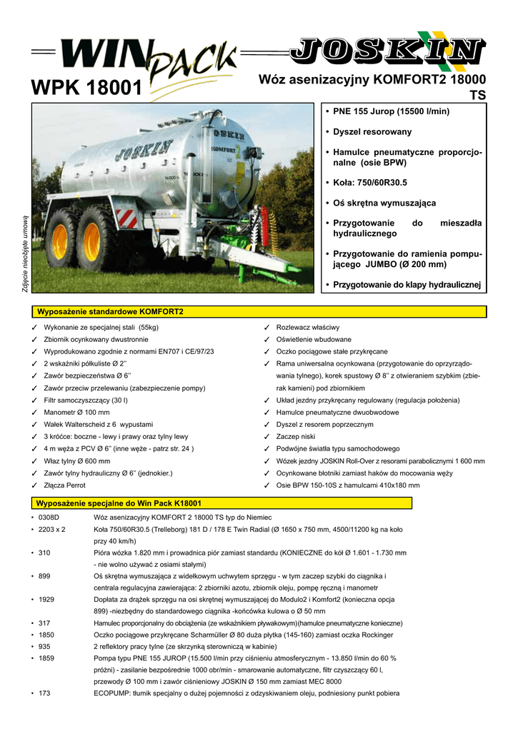 WPK 18001 Wóz asenizacyjny KOMFORT2 18000 TS • PNE 155 Jurop (15500 l/min) • Dyszel resorowany • Hamulce pneumatyczne proporcjo nalne (osie BPW) • Koła: 750/60R30.5 Zdjęcie nieobjęte umową • Oś skrętna wymuszająca • Przygotowanie hydraulicznego do mieszadła • Przygotowanie do ramienia pompu jącego JUMBO (Ø 200 mm) • Przygotowanie do klapy hydraulicznej Wyposażenie standardowe KOMFORT2 ✓ Wykonanie ze specjalnej stali (55kg) ✓ Rozlewacz właściwy ✓ Zbiornik ocynkowany dwustronnie ✓ Oświetlenie wbudowane ✓ Wyprodukowano zgodnie z normami EN707 i CE/97/23 ✓ Oczko pociągowe stałe przykręcane ✓ 2 wskaźniki półkuliste Ø 2’’ ✓ Rama uniwersalna ocynkowana (przygotowanie do oprzyrządo- ✓ Zawór bezpieczeństwa Ø 6’’ wania tylnego), korek spustowy Ø 8’’ z otwieraniem szybkim (zbie- ✓ Zawór przeciw przelewaniu (zabezpieczenie pompy) rak kamieni) pod zbiornikiem ✓ Filtr samoczyszczący (30 l) ✓ Układ jezdny przykręcany regulowany (regulacja położenia) ✓ Manometr Ø 100 mm ✓ Hamulce pneumatyczne dwuobwodowe ✓ Wałek Walterscheid z 6 wypustami ✓ Dyszel z resorem poprzecznym ✓ 3 króćce: boczne - lewy i prawy oraz tylny lewy ✓ Zaczep niski ✓ 4 m węża z PCV Ø 6’’ (inne węże - patrz str. 24 ) ✓ Podwójne światła typu samochodowego ✓ Właz tylny Ø 600 mm ✓ Wózek jezdny JOSKIN Roll-Over z resorami parabolicznymi 1 600 mm ✓ Zawór tylny hydrauliczny Ø 6’’ (jednokier.) ✓ Ocynkowane błotniki zamiast haków do mocowania węży ✓ Złącza Perrot ✓ Osie BPW 150-10S z hamulcami 410x180 mm Wyposażenie specjalne do Win Pack K18001 • 0308D Wóz asenizacyjny KOMFORT 2 18000 TS typ do Niemiec • 2203 x 2 Koła 750/60R30.5 (Trelleborg) 181 D / 178 E Twin Radial (Ø 1650 x 750 mm, 4500/11200 kg na koło przy 40 km/h) • 310 Pióra wózka 1.820 mm i prowadnica piór zamiast standardu (KONIECZNE do kół Ø 1.601 -1.730 mm - nie wolno używać z osiami stałymi) • 899 Oś skrętna wymuszająca z widełkowym uchwytem sprzęgu - w tym zaczep szybki do ciągnika i centrala regulacyjna zawierająca: 2 zbiorniki azotu, zbiornik oleju, pompę ręczną i manometr • 1929 Dopłata za drążek sprzęgu na osi skrętnej wymuszającej do Modulo2 i Komfort2 (konieczna opcja 899) -niezbędny do standardowego ciągnika -końcówka kulowa o Ø 50 mm • 317 Hamulec proporcjonalny do obciążenia (ze wskaźnikiem pływakowym) (hamulce pneumatyczne konieczne) • 1850 Oczko pociągowe przykręcane Scharmüller Ø 80 duża płytka (145-160) zamiast oczka Rockinger • 935 2 reflektory pracy tylne (ze skrzynką sterowniczą w kabinie) • 1859 Pompa typu PNE 155 JUROP (15.500 l/min przy ciśnieniu atmosferycznym - 13.850 l/min do 60 % próżni) - zasilanie bezpośrednie 1000 obr/min - smarowanie automatyczne, filtr czyszczący 60 l, przewody Ø 100 mm i zawór ciśnieniowy JOSKIN Ø 150 mm zamiast MEC 8000 • 173 ECOPUMP: tłumik specjalny o dużej pojemności z odzyskiwaniem oleju, podniesiony punkt pobiera WPK 18001 Wóz asenizacyjny KOMFORT2 18000 TS nia powietrza i zmniejszenie hałasu • 050 Sterowanie hydrauliczne pompą (dwukier.) - standard do Euroliner i Vacu-Cargo • 110 Wałek szerokokątny 1-stronny (Walterscheid) • 170 Zabezpieczenie śrubowe na wałku (standard z systemem Garda i pompami przepływowymi: ślimakową lub krzywkową) • 012 Połączony wskaźnik poziomu Ø 6’’ zamiast wskaźnika półkulistego Ø 2’’ z przodu • 015 x 2 Króciec Ø 8’’ zamiast standardowego 6’’ (przedni lewy i prawy) • 017 • 626 Dodatkowy króciec Ø 8’’ - WPK 18001, na górze z przodu zbiornika Zawór zasysający Ø 6’’ ze szczęką ślizgową Perrot • 030 • 896 Zawór dzwonowy Ø 150 mm (jednokier.) zamiast zaworu standardowego Przygotowanie do mieszadła hydraulicznego • 097 Przygotowanie do JUMBO przedniego niebudowanego Ø 200 mm • 1865 Przygotowanie do pokrywy hydraulicznej 500 x 600 mm - w tym przygotowanie do drabinki wewnętrznej i zewnętrznej