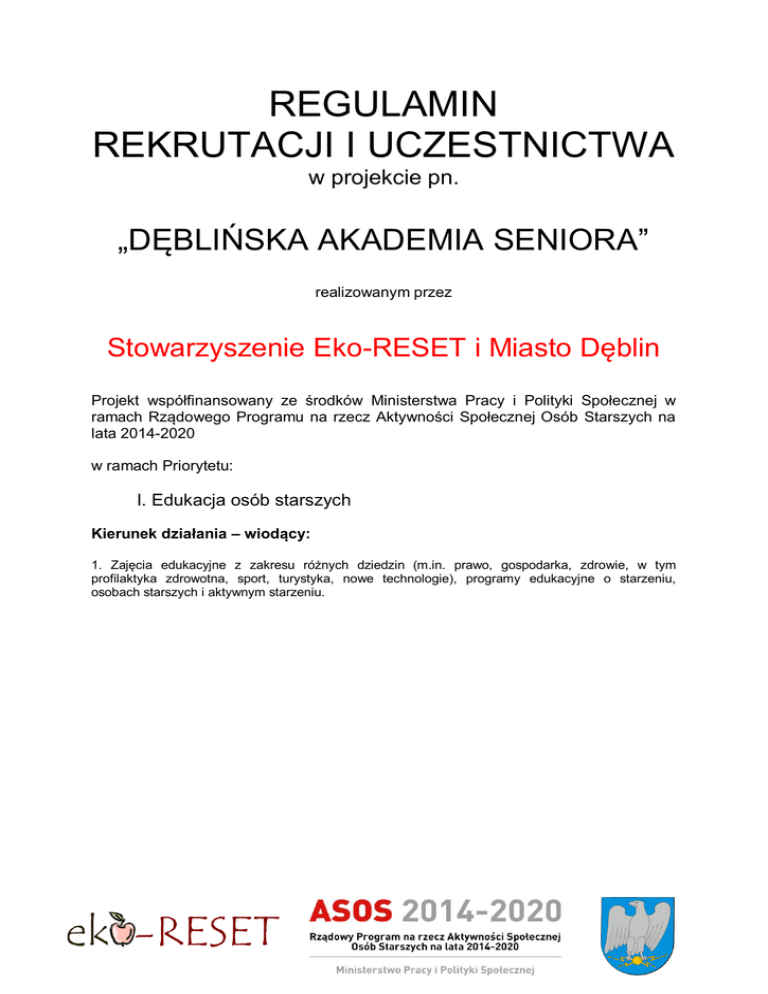 REGULAMIN REKRUTACJI I UCZESTNICTWA w projekcie pn. „DĘBLIŃSKA AKADEMIA SENIORA” realizowanym przez Stowarzyszenie Eko-RESET i Miasto Dęblin Projekt współfinansowany ze środków Ministerstwa Pracy i Polityki Społecznej w ramach Rządowego Programu na rzecz Aktywności Społecznej Osób Starszych na lata 2014-2020 w ramach Priorytetu: I. Edukacja osób starszych Kierunek działania – wiodący: 1. Zajęcia edukacyjne z zakresu różnych dziedzin (m.in. prawo, gospodarka, zdrowie, w tym profilaktyka zdrowotna, sport, turystyka, nowe technologie), programy edukacyjne o starzeniu, osobach starszych i aktywnym starzeniu. I. Postanowienia ogólne §1 Niniejszy regulamin określa zasady uczestnictwa i proces rekrutacji w ramach projektu pn. „Dęblińska Akademia seniora”, dofinansowanego ze środków Rządowego Programu na rzecz Aktywności Społecznej Osób Starszych, Priorytet I. Edukacja Osób Starszych, Kierunek działania - wiodący: 1. Zajęcia edukacyjne z zakresu różnych dziedzin (m.in. prawo, gospodarka, zdrowie, w tym profilaktyka zdrowotna, sport, turystyka, nowe technologie), programy edukacyjne o starzeniu, osobach starszych i aktywnym starzeniu. §2 Ilekroć w Regulaminie jest mowa o: 1. Projekcie - należy przez to rozumieć projekt pn. „Dęblińska Akademia Seniora”. 2. Koordynatorze Projektu - należy przez to rozumieć Stowarzyszenie EkoRESET. 3. Partnerze Projektu – należy przez to rozumieć Miasto Dęblin. 4. Beneficjencie lub Uczestniku Projektu - należy przez to rozumieć osobę zakwalifikowaną do uczestnictwa w Projekcie. 5. Formularzu zgłoszeniowym - należy przez to rozumieć dokument stanowiący podstawę do ubiegania się o udział w Projekcie, zwany dalej Formularzem zgłoszeniowym. 6. Wykładzie - należy przez to rozumieć zajęcia z zakresu profilaktyki zdrowotnej, prawa, gospodarki. 7. Warsztacie - należy przez to rozumieć zajęcia z takich dziedzin jak: profilaktyka zdrowotna, sport, nowoczesne technologie, aktywne starzenie się, rozwój umiejętności i zainteresowań. 8. Seminarium - należy przez to rozumieć zajęcia z zakresu aktywności społecznej osób starszych oraz z zakresu edukacji religijnej i międzykulturowej. 9. Wycieczce edukacyjnej - należy przez to rozumieć dwie wycieczki śladami polskiej historii: Sandomierz- Baranów Sandomierski, Lublin- KozłówkaLeonów. 10. Biurze Projektu - należy przez rozumieć biuro projektu pn. „Dęblińska Akademia Seniora” w Dęblinie przy ul. Rynek 12, Urząd Miasta Dęblin, pokój 12. §3 1. Projekt realizowany jest przez Stowarzyszenie Eko-RESET w partnerstwie z Miastem Dęblin. 2. Biuro Projektu mieści się przy ul. Rynek 12 w Dęblinie, w Urzędzie Miasta Dęblin, pokój nr 12. 3. Projekt realizowany jest w terminie od 01.05.2014 r. do dnia 31.12.2014 r. 4. Celem ogólnym projektu jest: poprawa aktywności społecznej osób starszych poprzez różne formy edukacji. II. Warunki uczestnictwa w Projekcie §4 1. Uczestnikami Projektu mogą zostać: osoby, które ukończyły 60 rok życia; osoby zamieszkałe na terenie miasta Dęblin. 2. Uczestnicy Projektu zobowiązani są ponadto do stosowania zasad określonych w niniejszym Regulaminie, obowiązkowego uczestnictwa w Seminariach pn. „Aktywność społeczna osób starszych” i „Seminarium bożonarodzeniowe” oraz wyrażenia zgody na przetwarzanie ich danych osobowych dla potrzeb procesu rekrutacji, realizacji i ewaluacji Projektu, zgodnie z ustawą z dnia 29 sierpnia 1997 roku o ochronie danych osobowych (Dz. U. z 2002 roku Nr 101, poz. 926 z późn. zm.). III. Proces rekrutacji §5 1. Rekrutacja do projektu będzie miała charakter otwarty, rozpocznie się wraz z akcją promocyjną Projektu i odbywać się będzie w okresie 1-31 maja 2014 r. 2. W Projekcie może wziąć udział 50 osób, które ukończyły 60 rok życia i mieszkają na terenie miasta Dęblin. 3. Dokładny termin naboru zostanie podany do publicznej wiadomości na stronie stowarzyszenia www.eko-reset.pl, na stronie partnera - miasta Dęblin www.deblin.pl oraz w Biurze Projektu. 4. W przypadku, gdy do Projektu w procesie rekrutacji nie zostanie zebrana zakładana liczba osób, przewiduje się przedłużenie naboru do momentu zrekrutowania założonej liczby osób. 5. Zgłoszenia do udziału w Projekcie można składać osobiście w Biurze Projektu lub za pośrednictwem poczty tradycyjnej, na adres: Urząd Miasta Dęblin, ul. Rynek 12, 08-530 Dęblin. 6. W celu dokonania zgłoszenia trzeba będzie dostarczyć prawidłowo wypełniony i podpisany przez kandydata Formularz zgłoszeniowy. 7. Wymagane dokumenty dostępne będą na stronie internetowej Koordynatora Projektu www.eko-reset.pl oraz na stronie partnera www.deblin.pl, jak również w Biurze Projektu. 8. Formularze zgłoszeniowe wprowadzane będą według daty ich wpływu i rejestrowane w bazie zgłoszeń (baza danych w postaci tabeli MS Excel). 9. Za moment zgłoszenia przyjmie się moment, w którym został złożony komplet wymaganych dokumentów. 10. O zakwalifikowaniu Kandydata do Projektu będzie decydowała ocena formalna, tj.: spełnienie kryteriów dostępu oraz złożenie w Biurze Projektu wymaganych i poprawnie wypełnionych dokumentów w określonym przez Koordynatora terminie - zdecyduje data wpływu dokumentów. 11. Spełnienie kryteriów formalnych zostanie potwierdzone na Karcie Oceny Formalnej Kandydata, która zostanie sporządzona i zatwierdzona przez Koordynatora Projektu. 12. Kryteria oceny formalnej: ocena 0 - 1(0 - nie spełnia; 1 - spełnia). 13. Do Projektu zostaną zakwalifikowane osoby, które przeszły pozytywnie ocenę formalną, będzie decydowała kolejność zgłoszeń. 14. Osoby, które spełniły kryteria formalne, a nie zakwalifikowały się do Projektu z uwagi na brak miejsc, zostaną umieszczone na liście rezerwowej. 15. Osoby z listy rezerwowej będą kwalifikowane do udziału w Projekcie w przypadku rezygnacji osób z listy podstawowej (przed rozpoczęciem dz