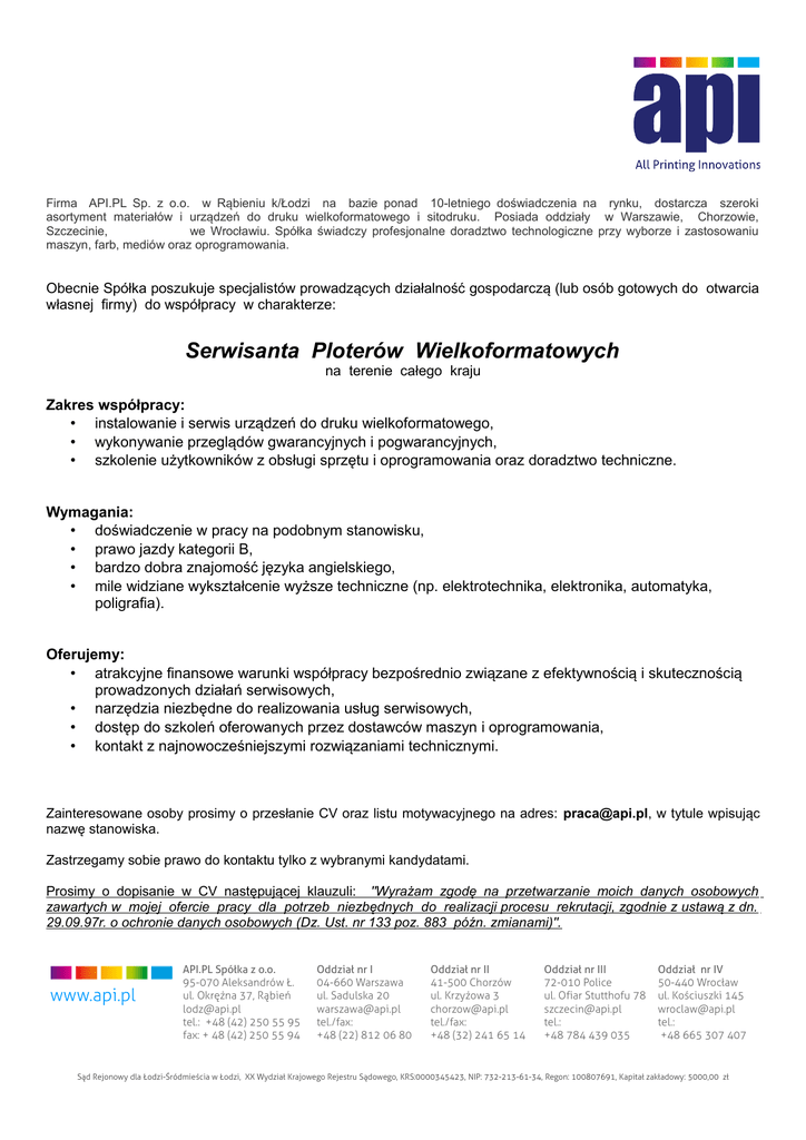 Firma API.PL Sp. z o.o. w Rąbieniu k/Łodzi na bazie ponad 10-letniego doświadczenia na rynku, dostarcza szeroki asortyment materiałów i urządzeń do druku wielkoformatowego i sitodruku. Posiada oddziały w Warszawie, Chorzowie, Szczecinie, we Wrocławiu. Spółka świadczy profesjonalne doradztwo technologiczne przy wyborze i zastosowaniu maszyn, farb, mediów oraz oprogramowania. Obecnie Spółka poszukuje specjalistów prowadzących działalność gospodarczą (lub osób gotowych do otwarcia własnej firmy) do współpracy w charakterze: Serwisanta Ploterow Wielkoformatowych na terenie całego kraju Zakres współpracy: • instalowanie i serwis urządzeń do druku wielkoformatowego, • wykonywanie przeglądów gwarancyjnych i pogwarancyjnych, • szkolenie użytkownikow z obsługi sprzetu i oprogramowania oraz doradztwo techniczne. Wymagania: • doswiadczenie w pracy na podobnym stanowisku, • prawo jazdy kategorii B, • bardzo dobra znajomosć jezyka angielskiego, • mile widziane wykształcenie wyższe techniczne (np. elektrotechnika, elektronika, automatyka, poligrafia). Oferujemy: • atrakcyjne finansowe warunki współpracy bezpośrednio związane z efektywnością i skutecznością prowadzonych działań serwisowych, • narzędzia niezbędne do realizowania usług serwisowych, • dostep do szkoleń oferowanych przez dostawcow maszyn i oprogramowania, • kontakt z najnowoczesniejszymi rozwiazaniami technicznymi. Zainteresowane osoby prosimy o przesłanie CV oraz listu motywacyjnego na adres: [email protected], w tytule wpisujac nazwe stanowiska. Zastrzegamy sobie prawo do kontaktu tylko z wybranymi kandydatami. Prosimy o dopisanie w CV nastepujacej klauzuli: "Wyrazam zgodę na przetwarzanie moich danych osobowych zawartych w mojej ofercie pracy dla potrzeb niezbędnych do realizacji procesu rekrutacji, zgodnie z ustawą z dn. 29.09.97r. o ochronie danych osobowych (Dz. Ust. nr 133 poz. 883 późn. zmianami)". www.api.pl API.PL Spółka z o.o. 95-070 Aleksandrów Ł. ul. Okrężna 37, Rąbień [email protected] tel.: +48 (42) 250 55 95 fax: + 48 (42) 250 55 94 Oddział nr I 04-660 Warszawa ul. Sadulska 20 [email protected] tel./fax: +48 (22) 812 06 80 Oddział nr II 41-500 Chorzów ul. Krzyżowa 3 [email protected] tel./fax: +48 (32) 241 65 14 Oddział nr III 72-010 Police ul. Ofiar Stutthofu 78 [email protected] tel.: +48 784 439 035 Oddział nr IV 50-440 Wrocław ul. Kościuszki 145 [email protected] tel.: +48 665 307 407 Sąd Rejonowy dla Łodzi-Śródmieścia w Łodzi, XX Wydział Krajowego Rejestru Sądowego, KRS:0000345423, NIP: 732-213-61-34, Regon: 100807691, Kapitał zakładowy: 5000,00 zł