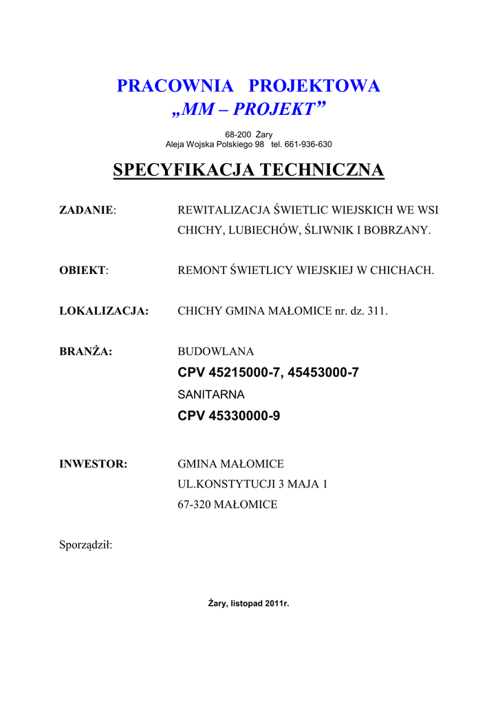 PRACOWNIA PROJEKTOWA „MM – PROJEKT” 68-200 Żary Aleja Wojska Polskiego 98 tel. 661-936-630 SPECYFIKACJA TECHNICZNA ZADANIE: REWITALIZACJA ŚWIETLIC WIEJSKICH WE WSI CHICHY, LUBIECHÓW, ŚLIWNIK I BOBRZANY. OBIEKT: REMONT ŚWIETLICY WIEJSKIEJ W CHICHACH. LOKALIZACJA: CHICHY GMINA MAŁOMICE nr. dz. 311. BRANŻA: BUDOWLANA CPV 45215000-7, 45453000-7 SANITARNA CPV 45330000-9 INWESTOR: GMINA MAŁOMICE UL.KONSTYTUCJI 3 MAJA 1 67-320 MAŁOMICE Sporządził: Żary, listopad 2011r. SPECYFIKACJA TECHNICZNA WYKONANIA I ODBIORU ROBÓT BUDOWLANYCH DLA ZADANIA REMONT ŚWIETLICY WIEJSKIEJ W CHICHACH GM. MAŁOMICE DZ. NR. 311. SPIS TREŚCI WSTĘP 1. Ustalenia ogólne. 1.1. Wprowadzenie. 1.2. Podstawa opracowania. 1.3. Wymagania ogólne dotyczące realizacji robót. 1.4. Wymagania ogólne wynikające z Prawa Budowlanego. 1.5. Dokumentacja techniczna. 1.6. Zmiany rozwiązań projektowych i materiałowych. 1.7. Dokumentacja projektowa, przepisy, polskie Normy i inne wymagania. 1.8. Zakres prac, które obejmują poszczególne pozycje przedmiaru. 1.9. Odbiór robót budowlanych 2. Zagospodarowanie placu budowy. BRANŻA BUDOWLANA 1. Rozbiórki i demontaże elementów budowlanych. 1.1. Wykucie z muru ościeżnic, krat, balustrad i innych elementów stalowych 1.2. Demontaż drzwi i wykucie z muru ościeżnic drzwiowych 1.3. Demontaż okien 1.4. Rozbiórkę posadzek cementowych, płytek ceramicznych, pvc 1.5. Rozbiórkę ścian murowanych z cegły i kominów 1.6. Rozbiórkę różnych elementów wewnętrznych i zewnętrznych 1.7. Rozbiórkę pieca kaflowego 1.8. Rozebranie pokrycia dachowego z papy 2. Fundamenty i izolacje przeciwwilgociowe. 2.1. Fundamenty i ściany fundamentowe. 3. Roboty murowe i konstrukcyjne 3.1. Wykonanie nowych ścianek działowych 3.2. Wykonanie kominów wentylacyjnych 3.3. Wykonanie zamurowań otworów okiennych i drzwiowych 4. Nadproża 5. Tynki i okładziny ścian. 5.1. Tynki i okładziny ścian w pomieszczeniach mokrych (sanitarnych). 5.2. Tynki i okładziny ścian w pomieszczeniach suchych.. 5.3. Sufity podwieszone 6. Podłoża i posadzki. 6.1. Podłogi z wykładziną obiektową 6.2. Podłogi z płytek gres na gruncie 6.3. Podłogi z płytek gres na stropie 7. Malowanie. 7.1 Malowanie ścian w pomieszczeniach mokrych. 7.2 Malowanie ścian w pomieszczeniach suchych. 7.3.Tynk dekoracyjny mozaikowy 8. Stolarka okienna i drzwiowa. 8.1. Okna. 8.2. Drzwi wewnętrzne i zewnętrzne. 8.3.Ościeżnice. 9. Pokrycie dachu 9.1. Pokrycie dachowe z blachodachówki – dach dwuspadowy 2 9.2. Pokrycie dachowe z papy termozgrzewalnej – dach jednospadowy 9.3. Rynny , rury spustowe i obróbki blacharskie 10. Elewacja 11. Nawierzchnia z kostki betonowej BRANŻA SANITARNA 1.1. Wewnętrzna instalacja wodociągowa 1.2. Wewnętrzna instalacja kanalizacji. 3 WSTĘP 1. ZAGADNIENIA OGÓLNE 1.1. WPROWADZENIE dotyczących remontu świetlicy wiejskiej w Chichach gm. Małomice dz. nr. 311. określa wymagania w zakresie: - właściwości materiałów; - sposobu i jakości wykonania robót; - oceny prawidłowości wykonania robót oraz próby sprawdzenia i odbioru robót. Specyfikacja techniczna wykonania i odbioru robót 1.2. PODSTAWA OPRACOWANIA Specyfikację techniczną wykonania i odbioru robót opracowano na podstawie: - projektu budowlanego; - przedmiaru robót; - wizji w terenie. 1.3. WYMAGANIA OGÓLNE DOTYCZĄCE REALIZACJI ROBÓT Realizacja robót budowlanych musi zawsze odpowiadać wszystkim przepisom techniczno – budowlanym i prawnym, dotyczących danego obiektu i technologii wykonania robót. Szczególną uwagę należy zwrócić na przepisy dotyczące ochrony przeciwpożarowej, bezpieczeństwa i higieny pracy, ochrony środowiska, ochrony sanitarnej. Wykonawca jest zobowiązany do zapewnienia na własny koszt przestrzegania obowiązujących przepisów oraz spełnienia ewentualnych późniejszych, w trakcie budowy, wymogów władz administracyjnych. 1.4. WYMAGANIA OGÓLNE WYNIKAJĄCE Z PRAWA BUDOWLANEGO Wykonywanie robót budowlanych zgodnie z wymogami Prawa Budowlanego należy do obowiązków Wykonawcy. Zamawiający zapewnia na budowie jedynie nadzór inwestorski. Do obowiązków Wykonawcy w tym zakresie, należy w szczególności: - zatrudnienie kierownika budowy i kierowników robót w wymaganych specjalnościach, - realizacja zadań wynikających z obowiązków kierownika budowy określonych w Art. 22 i Art. 42 pkt. 2 Prawa Budowlanego. 1.5. DOKUMENTACJA TECHNICZNA Dokumentacja techniczna, dostarczona przez Zamawiającego, przed jej przekazaniem na budowę powinna być sprawdzona przez Wykonawcę, w szczególności pod kątem możliwości technicznych realizacji zgodnie z przepisami BHP, rodzajem stosowanych materiałów, urządzeń i rozwiązań konstrukcyjnych. 1.6. ZMIANY ROZWIĄZAŃ PROJEKTOWYCH I MATERIAŁOWYCH Wszelkie zmiany i odstępstwa od ww. dokumentacji technicznej nie mogą powodować obniżenia wartości funkcjonalnych i użytkowych obiektów, a zmiany dotyczące zmiany projektowanych rozwiązań materiałowych i urządzeń nie mogą powodować zmniejszenia trwałości eksploatacyjnej i zwiększenia kosztów eksploatacji. Wprowadzenie zmiany do ww. dokumentacji jest możliwe wyłącznie przed złożeniem oferty, po zaakceptowaniu proponowanej zmiany przez Zamawiającego w formie odpowiedzi na zapytanie ofertowe. Wniosek – zapytanie ofertowe Wykonawca powinien złożyć do Zamawiającego przed upływem terminu do składania ofert (zapytań do SIWZ) Wniosek w tej sprawie powinien zawierać precyzyjnie opisane proponowane rozwiązanie zamienne oraz porównanie parametrów technicznych z rozwiązaniem zawartym w dokumentacji technicznej. Jeżeli jest to możliwe do wniosku należy dołączyć próbkę proponowanego materiału. Do wniosku 4 należy koniecznie dołączyć dokument potwierdzający, że wyrób jest dopuszczony do obrotu i stosowania w budownictwie. W trakcie realizacji robót Zamawiający nie dopuszcza wprowadzania zmian poza następującymi przypadkami: - wyrób zo