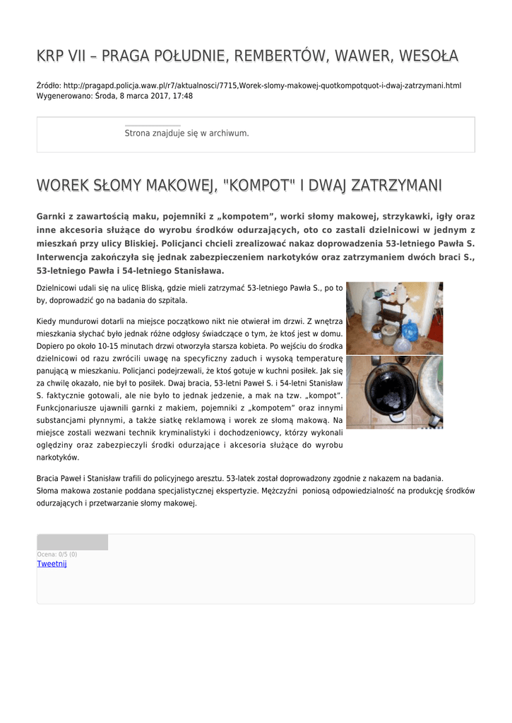 KRP VII – PRAGA POŁUDNIE, REMBERTÓW, WAWER, WESOŁA Źródło: http://pragapd.policja.waw.pl/r7/aktualnosci/7715,Worek-slomy-makowej-quotkompotquot-i-dwaj-zatrzymani.html Wygenerowano: Środa, 8 marca 2017, 17:48 Strona znajduje się w archiwum. WOREK SŁOMY MAKOWEJ, "KOMPOT" I DWAJ ZATRZYMANI Garnki z zawartością maku, pojemniki z „kompotem”, worki słomy makowej, strzykawki, igły oraz inne akcesoria służące do wyrobu środków odurzających, oto co zastali dzielnicowi w jednym z mieszkań przy ulicy Bliskiej. Policjanci chcieli zrealizować nakaz doprowadzenia 53-letniego Pawła S. Interwencja zakończyła się jednak zabezpieczeniem narkotyków oraz zatrzymaniem dwóch braci S., 53-letniego Pawła i 54-letniego Stanisława. Dzielnicowi udali się na ulicę Bliską, gdzie mieli zatrzymać 53-letniego Pawła S., po to by, doprowadzić go na badania do szpitala. Kiedy mundurowi dotarli na miejsce początkowo nikt nie otwierał im drzwi. Z wnętrza mieszkania słychać było jednak różne odgłosy świadczące o tym, że ktoś jest w domu. Dopiero po około 10-15 minutach drzwi otworzyła starsza kobieta. Po wejściu do środka dzielnicowi od razu zwrócili uwagę na specyficzny zaduch i wysoką temperaturę panującą w mieszkaniu. Policjanci podejrzewali, że ktoś gotuje w kuchni posiłek. Jak się za chwilę okazało, nie był to posiłek. Dwaj bracia, 53-letni Paweł S. i 54-letni Stanisław S. faktycznie gotowali, ale nie było to jednak jedzenie, a mak na tzw. „kompot”. Funkcjonariusze ujawnili garnki z makiem, pojemniki z „kompotem” oraz innymi substancjami płynnymi, a także siatkę reklamową i worek ze słomą makową. Na miejsce zostali wezwani technik kryminalistyki i dochodzeniowcy, którzy wykonali oględziny oraz zabezpieczyli środki odurzające i akcesoria służące do wyrobu narkotyków. Bracia Paweł i Stanisław trafili do policyjnego aresztu. 53-latek został doprowadzony zgodnie z nakazem na badania. Słoma makowa zostanie poddana specjalistycznej ekspertyzie. Mężczyźni poniosą odpowiedzialność na produkcję środków odurzających i przetwarzanie słomy makowej. Ocena: 0/5 (0) Tweetnij