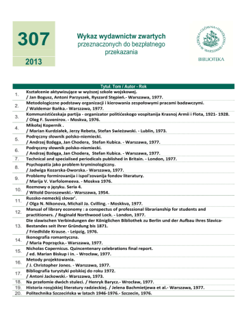 307 Wykaz wydawnictw zwartych przeznaczonych do bezpłatnego przekazania 2013 1. 2. 3. 4. 5. 6. 7. 8. 9. 10. 11. 12. 13. 14. 15. 16. 17. 18. 19. 20. Tytuł. Tom / Autor - Rok Kształcenie aktywizujące w wyższej szkole wojskowej. / Jan Bogusz, Antoni Parzyszek, Ryszard Stępień.‐ Warszawa, 1977. Metodologiczne podstawy organizacji i kierowania zespołowymi pracami badawczymi. / Waldemar Bańka.‐ Warszawa, 1977. Kommunistićeskaja partija ‐ organizator politićeskogo vospitanija Krasnoj Armii i Flota, 1921‐ 1928. / Oleg F. Suvenirov. ‐ Moskva, 1976. Mikołaj Kopernik . / Marian Kurdziałek, Jerzy Rebeta, Stefan Swieżawski. ‐ Lublin, 1973. Podręczny słownik polsko‐niemiecki. / Andrzej Bzdęga, Jan Chodera, Stefan Kubica. ‐ Warszawa, 1977. Podręczny słownik polsko‐niemiecki. / Andrzej Bzdęga, Jan Chodera, Stefan Kubica. ‐ Warszawa, 1977. Technical and specialised periodicals published in Britain. ‐ London, 1977. Psychopatia jako problem kryminologiczny. / Jadwiga Kozarska‐Dworska.‐ Warszawa, 1977. Problemy formirovanija i ispol'zovanija fondov literatury. / Marija V. Varfolomeeva. ‐ Moskva 1976. Rozmowy o języku. Seria 4. / Witold Doroszewski.‐ Warszawa, 1954. Russko‐nemeckij slovar'. / Olga N. Nikonova, Michail Ja. Cvilling. ‐ Moskkva, 1977. Manual of library economy : a conspectus of professional librarianship for students and practitioners. / Reginald Northwood Lock. ‐ London, 1977. Die slawischen Verbindungen der Königlichen Bibliothek zu Berlin und der Aufbau ihres Slavica‐ Bestandes seit ihrer Gründung bis 1871. / Friedhilde Krause. ‐ Leipzig, 1976. Ikonografia romantyczna. / Maria Poprzęcka.‐ Warszawa, 1977. Nicholas Copernicus. Quincentenary celebrations final report. / ed. Marian Biskup i in. ‐ Wrocław, 1977. Metody projektowania. / J. Christopher Jones. ‐ Warszawa, 1977. Bibliografia turystyki polskiej do roku 1972. / Antoni Jackowski.‐ Warszawa, 1973. Na przełomie dwóch stuleci. / Henryk Barycz.‐ Wrocław, 1977. Historia rosyjskiej literatury radzieckiej. / Jelena Bachmietjewa et al.‐ Warszawa, 1977. Politechnika Szczecińska w latach 1946‐1976.‐ Szczecin, 1976.