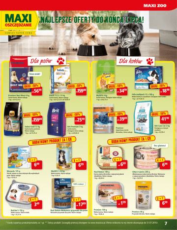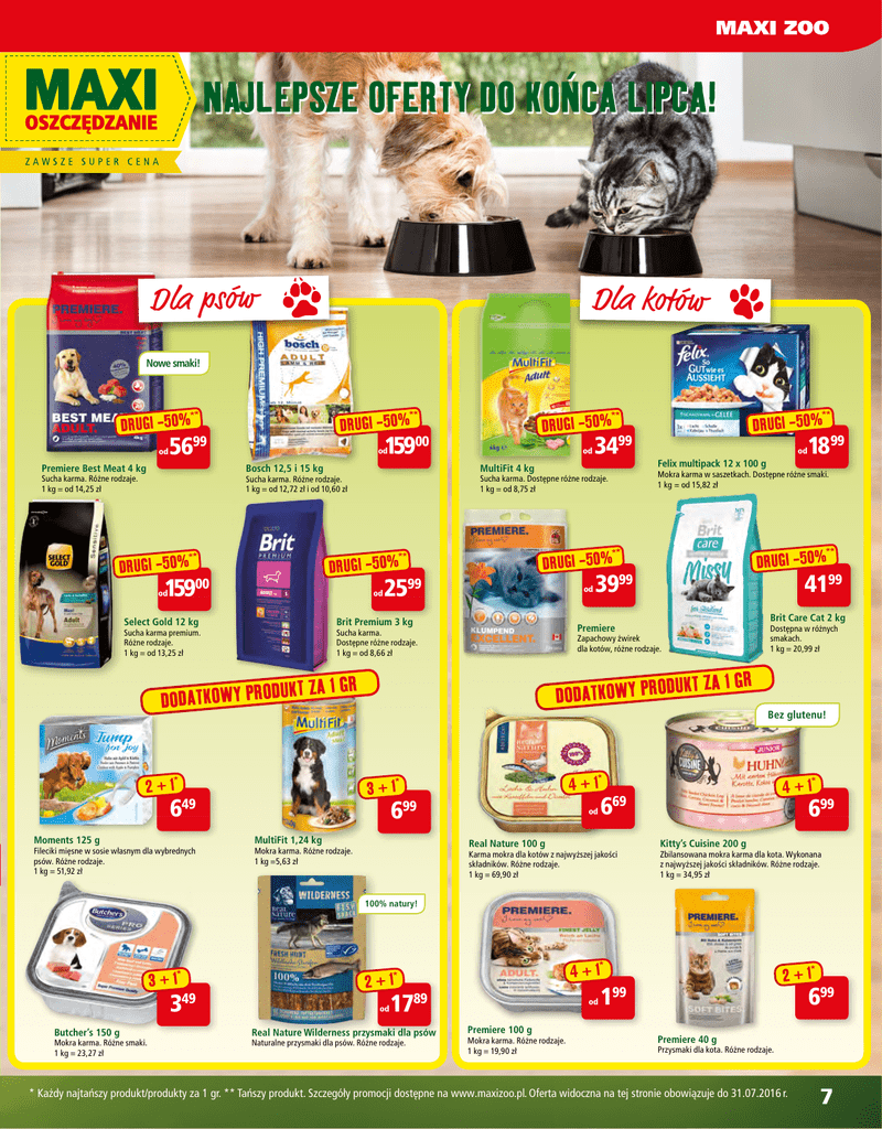 NAJLEPSZE OFERTY DO KOŃCA LIPCA! Dla psów Dla kotów Nowe smaki! ** ** od Premiere Best Meat 4 kg 15900 od Select Gold 12 kg od Brit Premium 3 kg Sucha karma premium. Różne rodzaje. 1 kg = od 13,25 zł Brit Care Cat 2 kg DODATKOWY PRODUKT Dostępna w różnych smakach. 1 kg = 20,99 zł ZA 1 GR Bez glutenu! 4 + 1* 3 + 1* 649 4199 3999 Zapachowy żwirek dla kotów, różne rodzaje. 1 GR 2 + 1* DRUGI -50% Premiere Sucha karma. Dostępne różne rodzaje. 1 kg = od 8,66 zł ZA DODATKOWY PRODUKT Fileciki mięsne w sosie własnym dla wybrednych psów. Różne rodzaje. 1 kg = 51,92 zł 2599 1899 ** ** DRUGI -50% DRUGI -50% od od Felix multipack 12 x 100 g Mokra karma w saszetkach. Dostępne różne smaki. 1 kg = od 15,82 zł Sucha karma. Dostępne różne rodzaje. 1 kg = od 8,75 zł ** ** DRUGI -50% 3499 MultiFit 4 kg Sucha karma. Różne rodzaje. 1 kg = od 12,72 zł i od 10,60 zł Moments 125 g od od Bosch 12,5 i 15 kg Sucha karma. Różne rodzaje. 1 kg = od 14,25 zł DRUGI -50% DRUGI -50% 15900 5699 ** ** DRUGI -50% DRUGI -50% 699 MultiFit 1,24 kg od 669 Real Nature 100 g Mokra karma. Różne rodzaje. 1 kg =5,63 zł 4 + 1* Karma mokra dla kotów z najwyższej jakości składników. Różne rodzaje. 1 kg = 69,90 zł 699 Kitty’s Cuisine 200 g Zbilansowana mokra karma dla kota. Wykonana z najwyższej jakości składników. Różne rodzaje. 1 kg = 34,95 zł 100% natury! 3 + 1* 349 Butcher’s 150 g Mokra karma. Różne smaki. 1 kg = 23,27 zł 4 + 1* 2 + 1* od 1789 Real Nature Wilderness przysmaki dla psów Naturalne przysmaki dla psów. Różne rodzaje. od Premiere 100 g Mokra karma. Różne rodzaje. 1 kg = 19,90 zł 2 + 1* 199 699 Premiere 40 g Przysmaki dla kota. Różne rodzaje. * Każdy najtańszy produkt/produkty za 1 gr. ** Tańszy produkt. Szczegóły promocji dostępne na www.maxizoo.pl. Oferta widoczna na tej stronie obowiązuje do 31.07.2016 r. 7