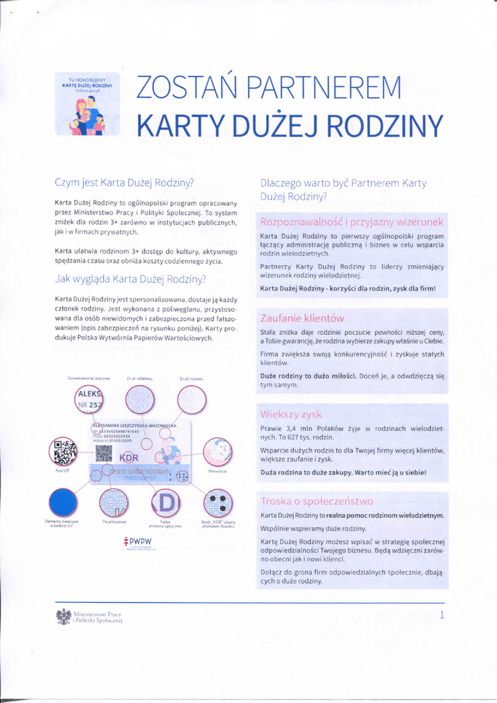 TU HONORUJEMY KAOT^ DUttI RODZINY -0dZ.lld£!3upt ZOSTAN PARTNEREM KARTYDUZEJ RODZINY Czym jest Karta Duzej Rodziny? Karta Duzej Rodziny to ogolnopolski program opracowany przez Ministerstwo Pracy i Polityki Spolecznej- To system znizek dla rodzin 3+ zarowno w instytucjach publicznych, jak i w firmach prywatnych. Karta utatwia rodzinom 3+ dost^p do kultury, aktywnego sp^dzania czasu oraz obniza kosztycodziennego zycia. Jakwygl^da Karta Duzej Rodziny? Karta Duzej Rodziny jest spersonatizowana, dostajej^ kazdy cztonek rodziny. Jesl wykonana z poliwegtanu, przystosowana dla osob niewidomych i zabezpieczona przed falszowaniem (opis zabezpieczen na rysunku ponizej). Karty produkuje Polska Wytwornia Papierow Wartosciowych. DIaczego warto bye Partnerem Karty Duzej Rodziny? RozDoznawalnosc i przyjazny wizerunek Karta Duzej Rodziny to pierwszy ogolnopolski program (^cz^cy administracj^ pubiicznq i biznes w celu wsparcia rodzin wielodzietnych. Partnerzy Karty Duzej Rodziny to liderzy zmieniaj^cy wizerunek rodziny wielodzietnej. Karta Duzej Rodziny - korzysci dla rodzin, zysk dta firm! Zaufanie klientow stata znizka daje rodzinie poczucie pewnosci nizszej ceny, a Tobie gwarancj^, ze rodzina wybierze zakupy wiasnie u Ciebie. Firma zwi^ksza swoj^ konkurencyjnosc i zyskuje statych klientow, Duie rodziny to duzo mitosci. Doceri je, a odwdzi^cza si^ tym samym. Wt^kszy zysk /i^fy;,SANoa^ ifszczvr^si^ MAZOWIEC^A Prawie 3,4 mln Polakow zyje w rodzinach wielodzietnych. To 627 tys. rodzin. Wsparcie duzych rodzin to dla Twojej firmy wi^cej klientow, wi^ksze zaufanie i zysk. Duza rodzina to duze zakupy. Warto miec u siebie! Troska o spoieczenstwo Karta Duzej Rodziny to realna pomoc rodzinom wielodzietnym, Wspolnie wspieramyduze rodziny. iPWPW Kart^ Duzej Rodziny mozesz wpisac w strategic spotecznej odpowiedzialnosci Twojego biznesu. B^dq wdzi^czni zarowno obecni jak i nowi klienci. Dol^cz do grona firm odpowiedzialnych spotecznie, dbajqcycti 0 duie rodziny. Ministerstwo Pran i Poiitvki Spoiec7ticj