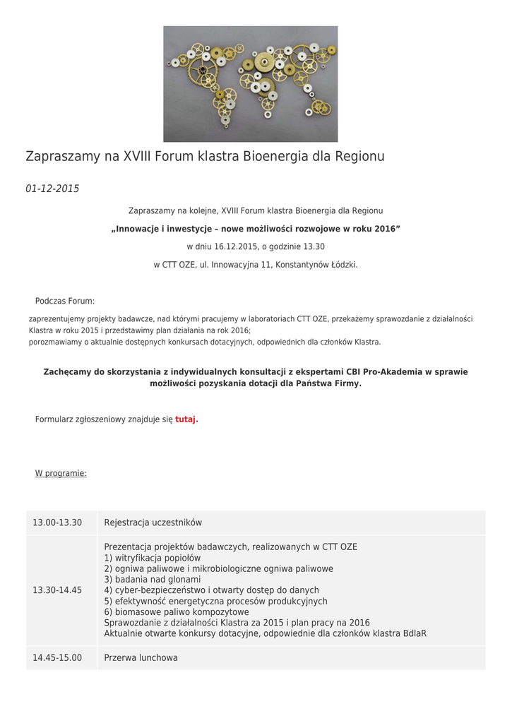 Zapraszamy na XVIII Forum klastra Bioenergia dla Regionu 01-12-2015 Zapraszamy na kolejne, XVIII Forum klastra Bioenergia dla Regionu „Innowacje i inwestycje – nowe możliwości rozwojowe w roku 2016” w dniu 16.12.2015, o godzinie 13.30 w CTT OZE, ul. Innowacyjna 11, Konstantynów Łódzki. Podczas Forum: zaprezentujemy projekty badawcze, nad którymi pracujemy w laboratoriach CTT OZE, przekażemy sprawozdanie z działalności Klastra w roku 2015 i przedstawimy plan działania na rok 2016; porozmawiamy o aktualnie dostępnych konkursach dotacyjnych, odpowiednich dla członków Klastra. Zachęcamy do skorzystania z indywidualnych konsultacji z ekspertami CBI Pro-Akademia w sprawie możliwości pozyskania dotacji dla Państwa Firmy. Formularz zgłoszeniowy znajduje się tutaj. W programie: 13.00-13.30 Rejestracja uczestników 13.30-14.45 Prezentacja projektów badawczych, realizowanych w CTT OZE 1) witryfikacja popiołów 2) ogniwa paliwowe i mikrobiologiczne ogniwa paliwowe 3) badania nad glonami 4) cyber-bezpieczeństwo i otwarty dostęp do danych 5) efektywność energetyczna procesów produkcyjnych 6) biomasowe paliwo kompozytowe Sprawozdanie z działalności Klastra za 2015 i plan pracy na 2016 Aktualnie otwarte konkursy dotacyjne, odpowiednie dla członków klastra BdlaR 14.45-15.00 Przerwa lunchowa 15.00-17.00 Indywidualne konsultacje z ekspertami CBI Pro-Akademia w sprawie możliwości pozyskania dofinansowania dla swojej Firmy Strona CBI Pro-Akademia używa ciasteczek (cookies), dzięki którym nasz serwis może działać lepiej. Zobacz